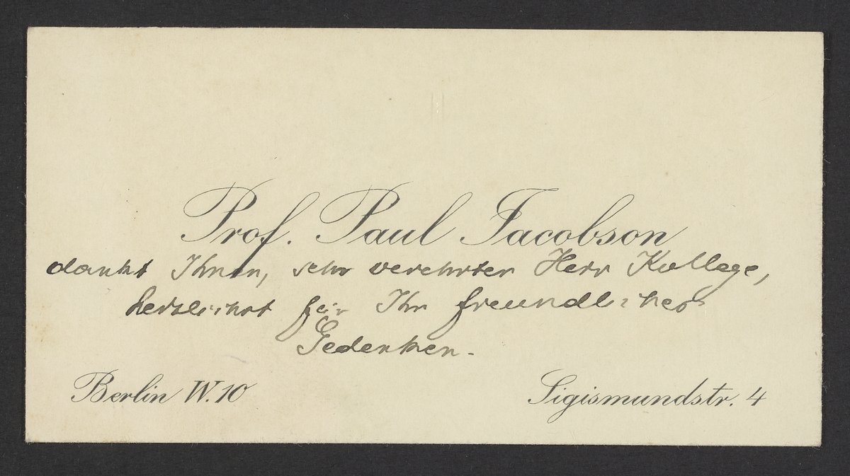 Jacobson, Paul. “Paul Jacobson's Personal Calling Card,” n.d. Papers of Georg and Max Bredig, Box 3, Folder 18. Science History Institute. Philadelphia. https://digital.sciencehistory.org/works/lxhksq0.