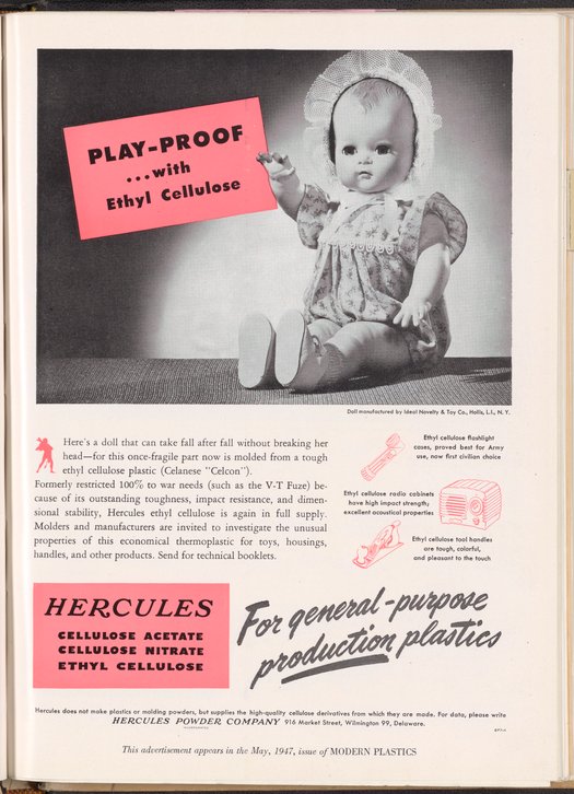 Hercules Incorporated. “Play Proof... with Ethyl Cellulose.” 1947 Hercules Advertisements, 1947. Records of Hercules Incorporated, Volume 1947. Science History Institute. Philadelphia. https://digital.sciencehistory.org/works/lyadnqj.