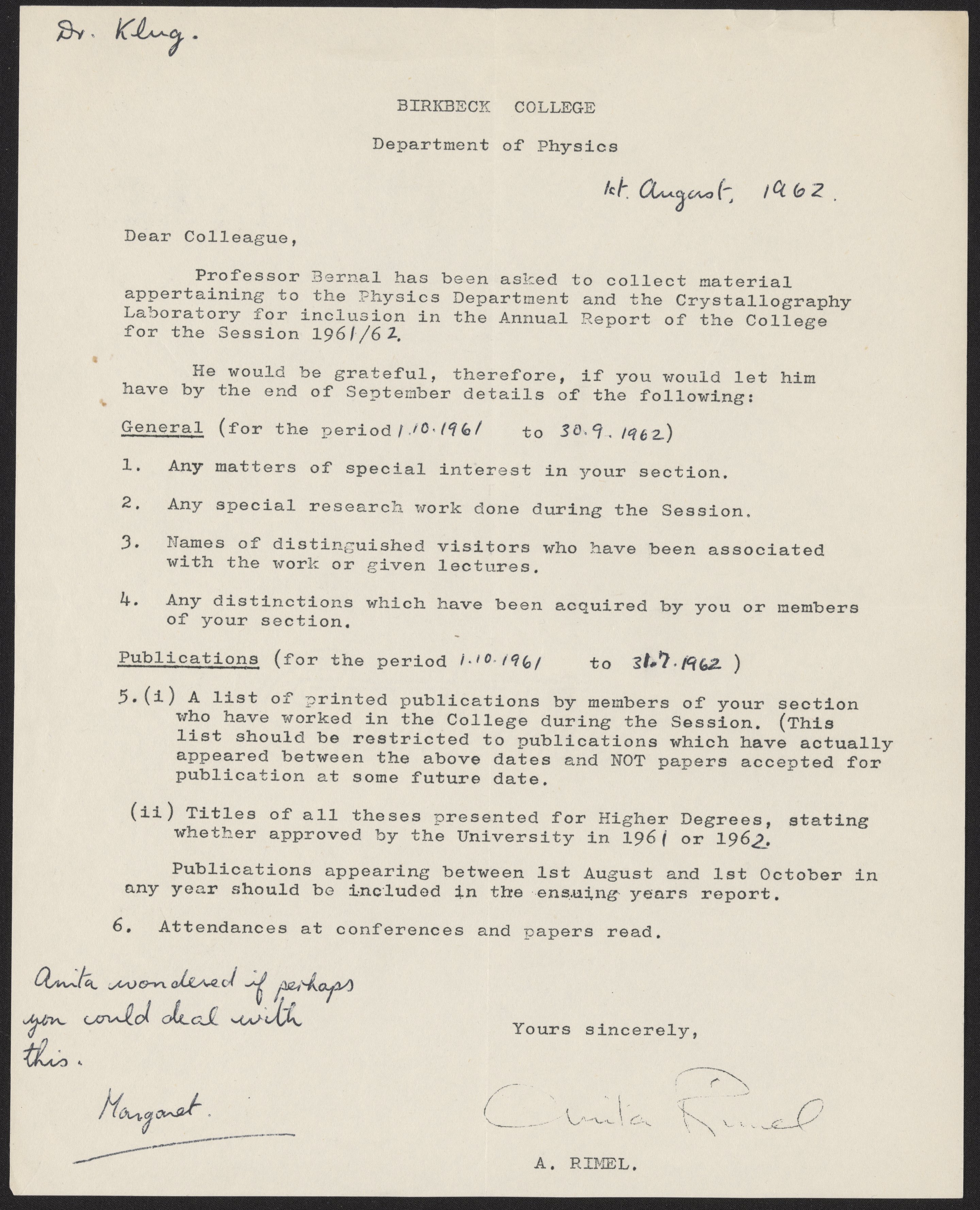 Rimel, Anita. “Memo from Anita Rimel to Aaron Klug, August 1st, 1962,” August 1, 1962. History of Molecular Biology Collection, Box 17, Folder 12. Science History Institute. Philadelphia. https://digital.sciencehistory.org/works/lzteiu8.