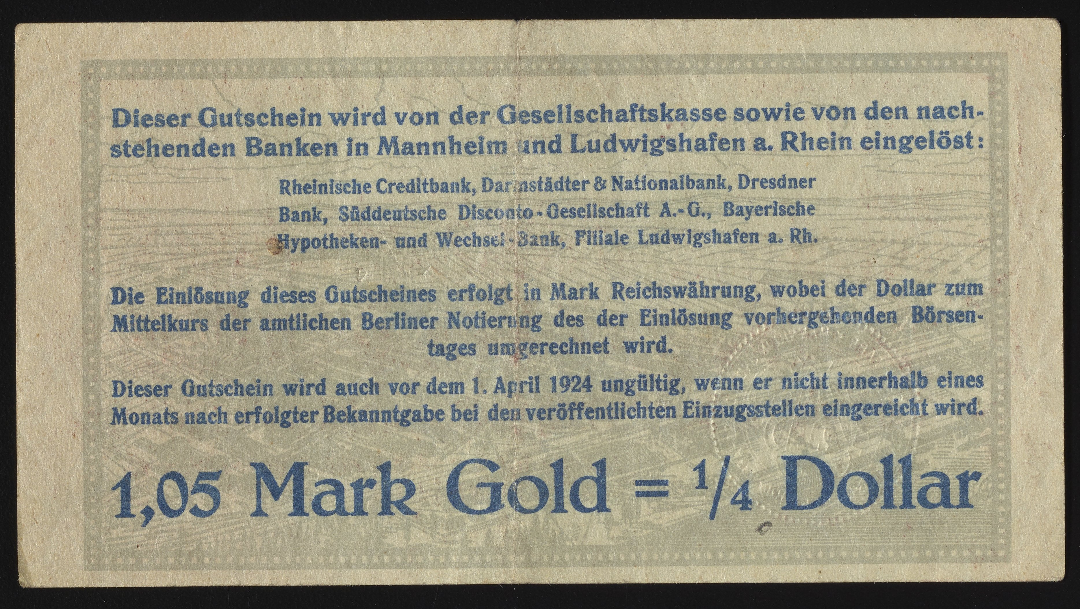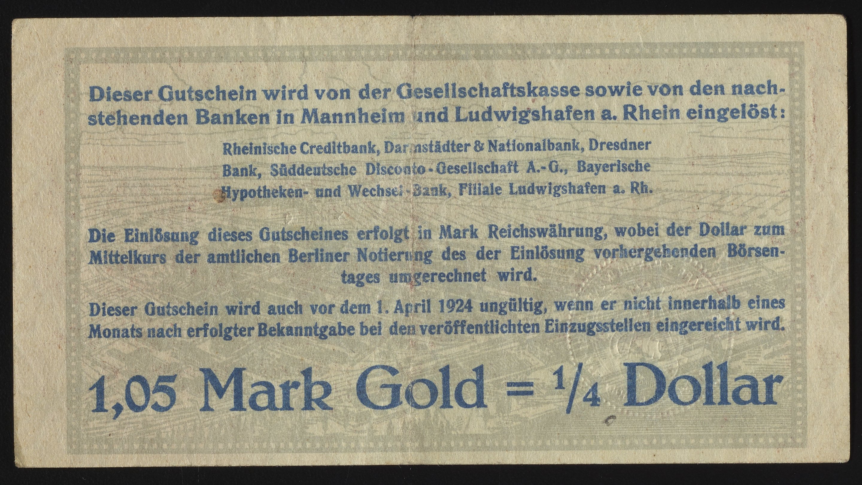Small JPG1200 x 662px — 243 KBLarge JPG2880 x 1589px — 1.2 MBFull-sized JPG3755 x 2072px — 1.9 MBOriginal fileTIFF — 3755 x 2072px — 22.3 MBThis 1.05 Goldmark = 1/4 dollar voucher was issued by Badische Anilin- & Soda-Fabrike after the German government created the Rentenmark to replace the old Reichsmark, which had become worthless due to hyperinflation. Cities and companies began issuing Goldmark paper money after the Rentenmark currency reform of October 15, 1923. Badische Anilin- & Soda-Fabrik and the city of Ludwigshafen issued notes in parallel with the same denominations. The verso of the bill includes the terms of the bill and an embossed seal. Paper features a watermark design.