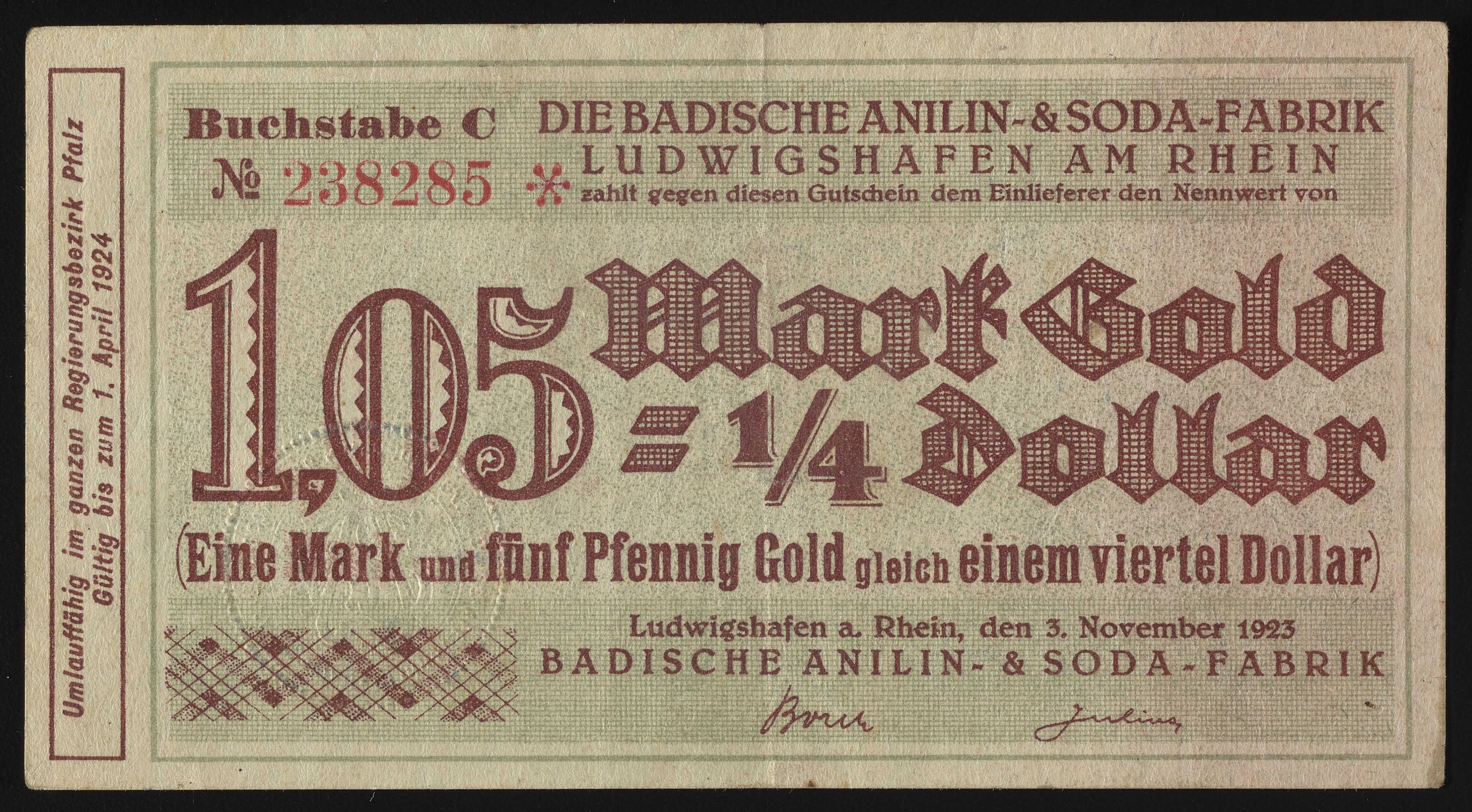 “Badische Anilin- & Soda-Fabrik 1.05 Mark Gold = 1/4 Dollar Gutschein.” Ludwigshafen am Rhein, Germany: Badische Anilin- & Soda-Fabrik, November 3, 1923. Robert J. Bauman collection. Science History Institute. Philadelphia. https://digital.sciencehistory.org/works/m039k602w.