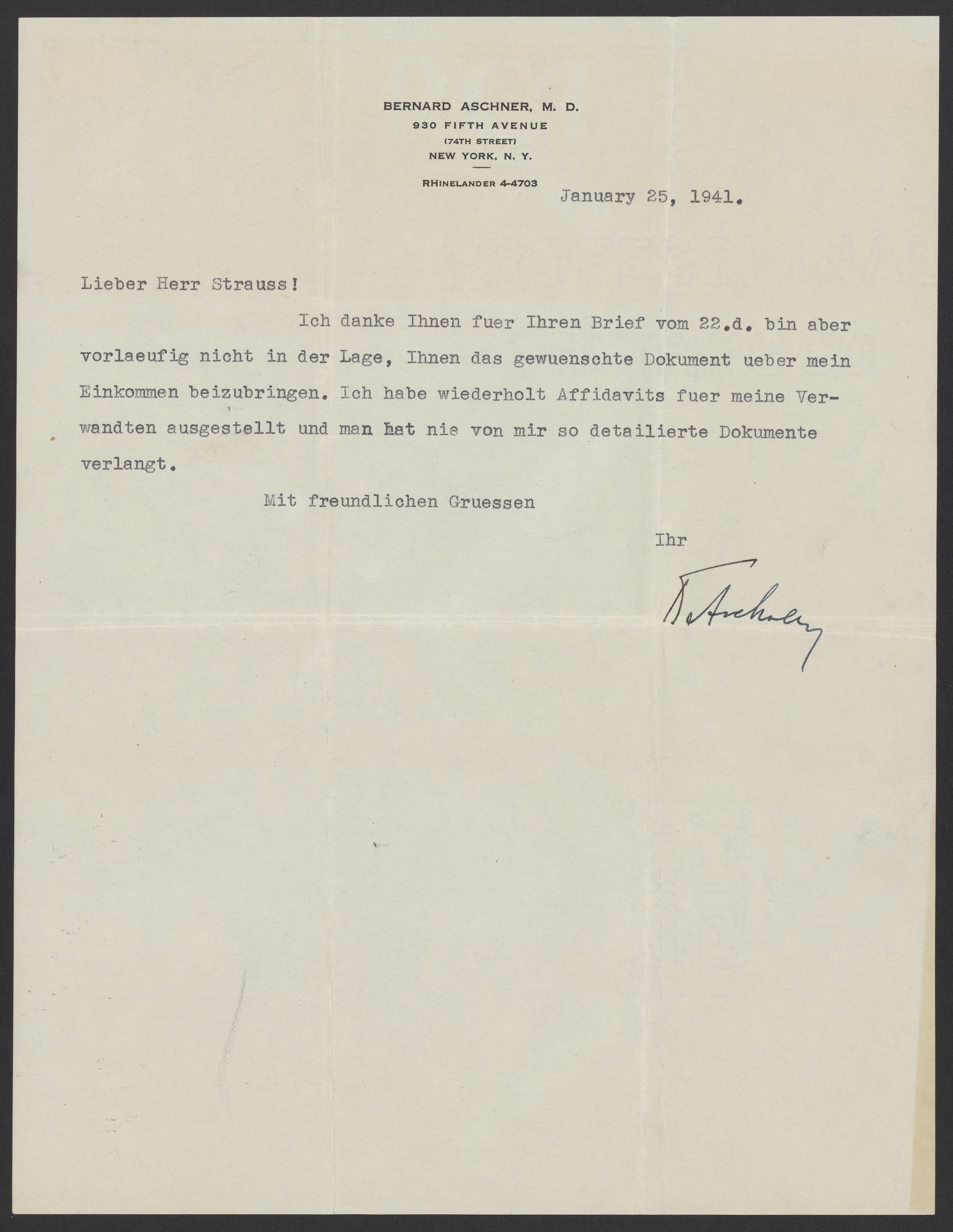 Letter to Mr. Strauss from Bernard Aschner, January 1941