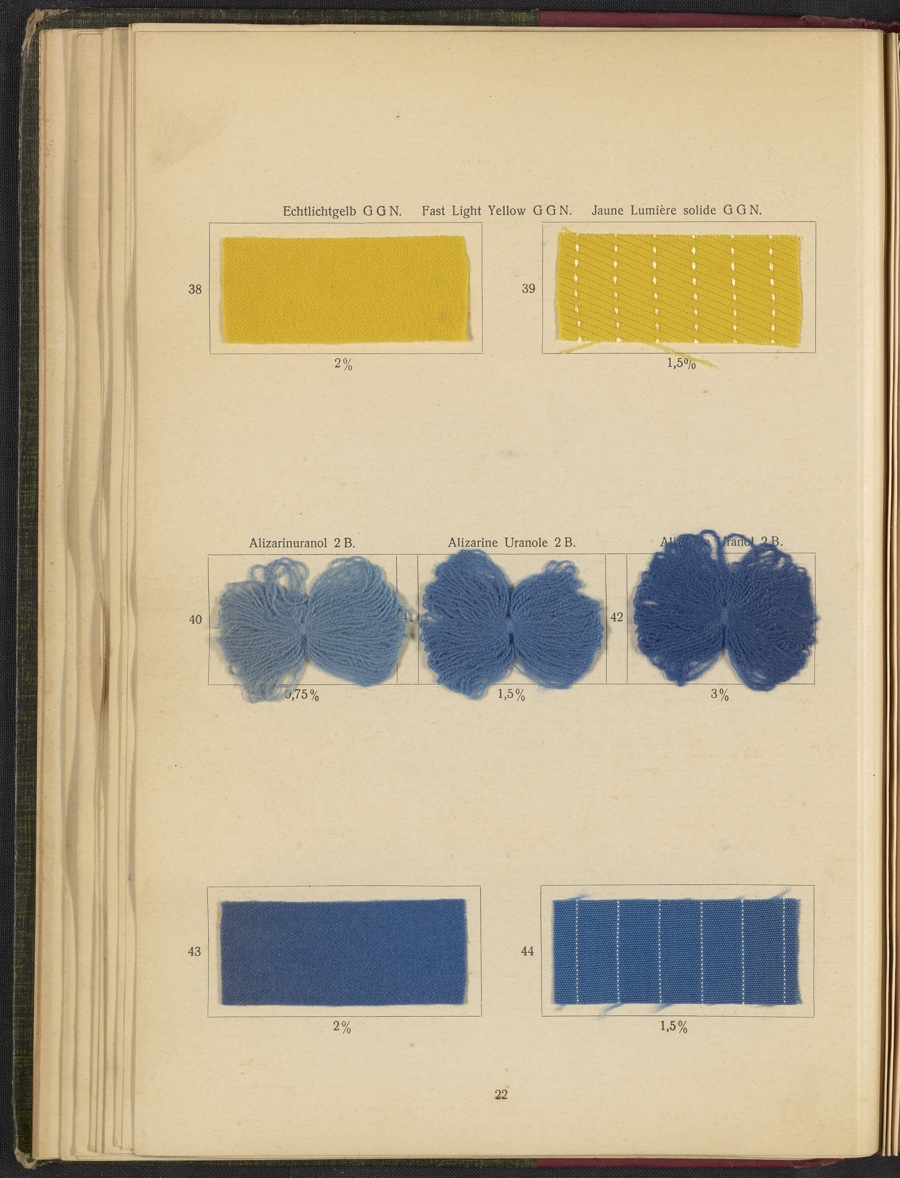 Small JPG1200 x 1597px — 455 KBLarge JPG2880 x 3832px — 2.6 MBFull-sized JPG3266 x 4346px — 3.2 MBOriginal fileTIFF — 3266 x 4346px — 40.6 MBSample book from the Bayer Company, Inc.--the North American extension of the German company, Farbenfabriken vorm. Friedrich Bayer & Co.--containing mounted dyed wool thread and swatch samples. Bayer & Co. was the first incarnation of the modern pharmaceutical company, Bayer AG, originally established to manufacture and sell synthetic dyestuffs.