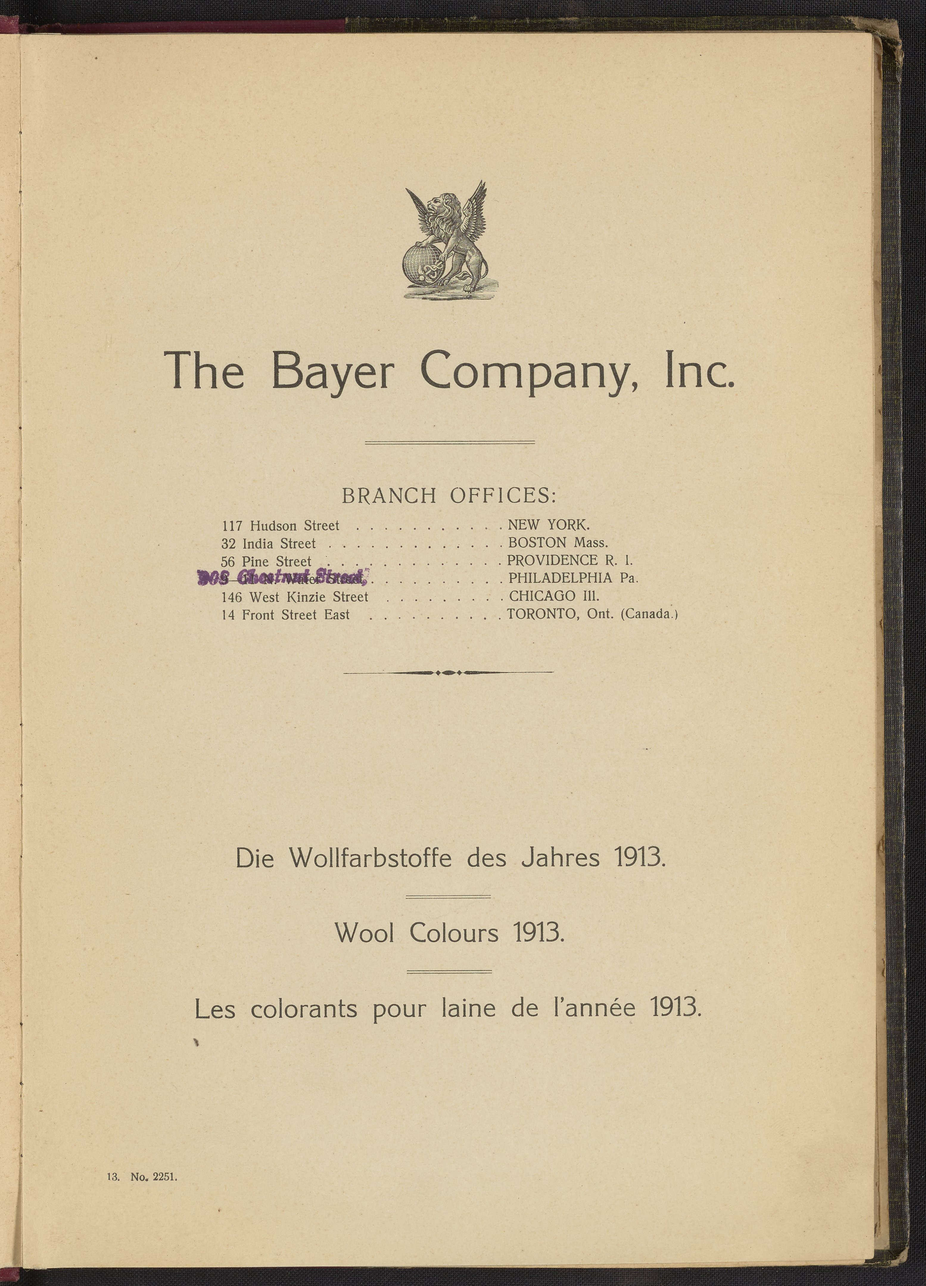 Bayer Company, Inc. Die Wollfarbstoffe Des Jahres 1913. New York, New York: Inc. Bayer Company, circa 1913. https://digital.sciencehistory.org/works/m2gptdf.