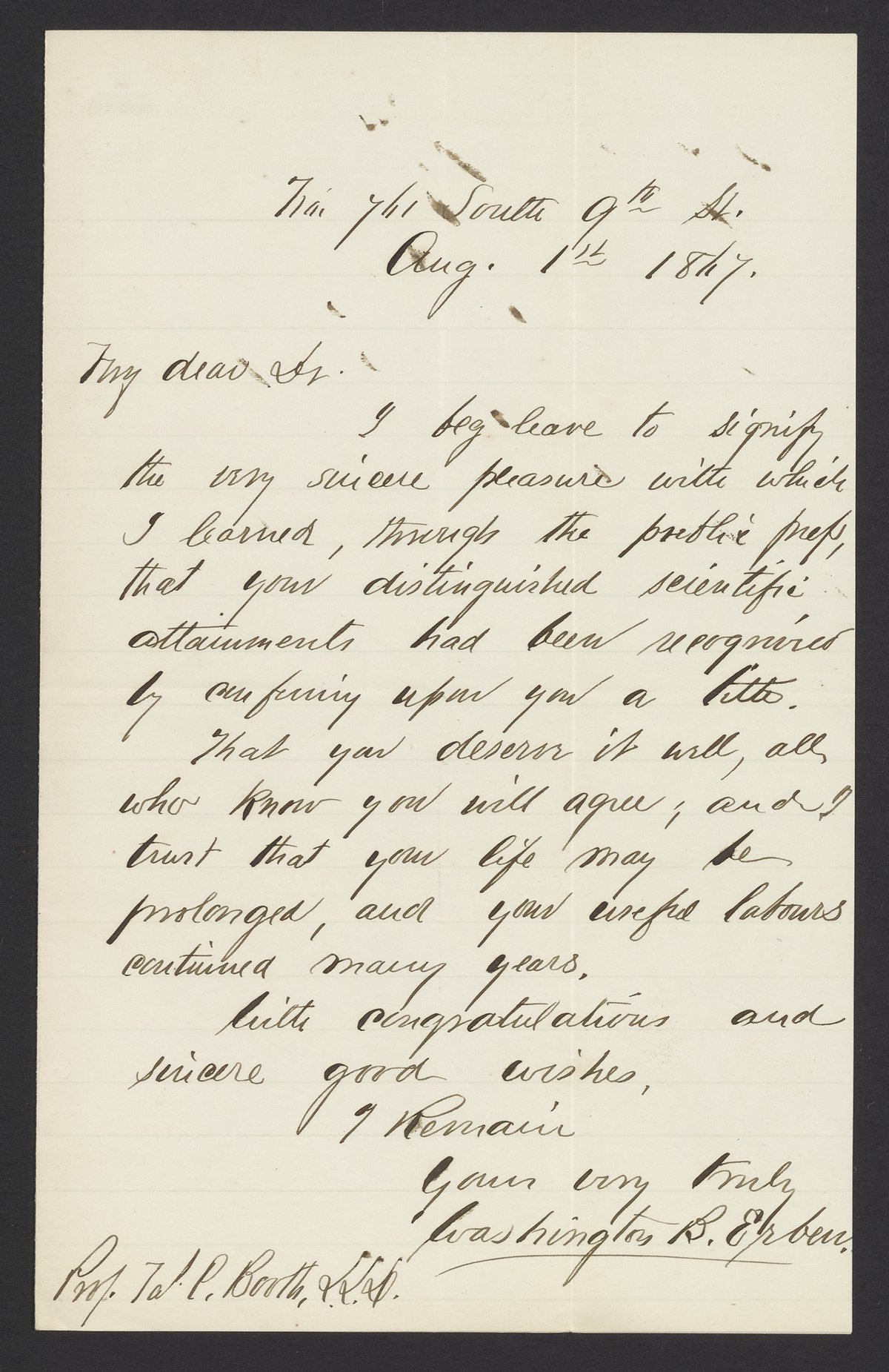 Erben, Washington B., Rev. “Letter from Rev. Washington B. Erben to James Curtis Booth,” August 1, 1867. Papers of James Curtis Booth, Box 2, Folder 5. Science History Institute. Philadelphia. https://digital.sciencehistory.org/works/m4u1n1j.