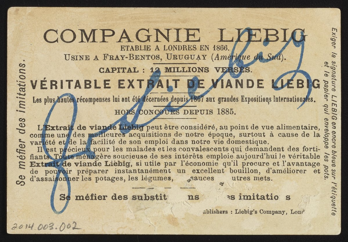 “Trade Card for Véritable Extrait De Viande Liebig [Real Liebig Meat Extract] with Crocodile Chase in Egypt.” Lithographic ink. London, England: Liebig's Extract of Meat Company, 1903. Science History Institute. Philadelphia. https://digital.sciencehistory.org/works/m613mz51x.