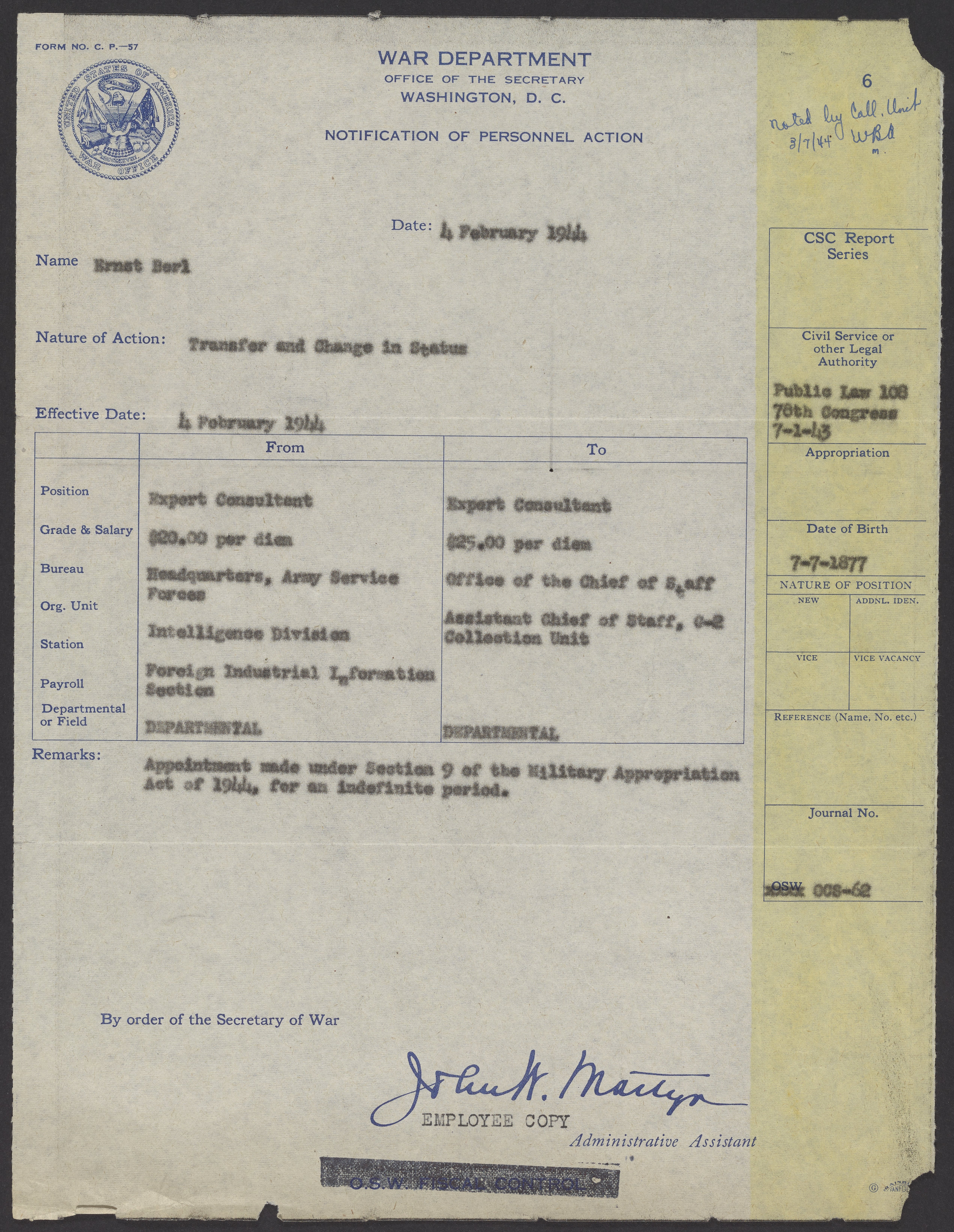 Notification of Personnel Action regarding Ernst Berl, February 4, 1944