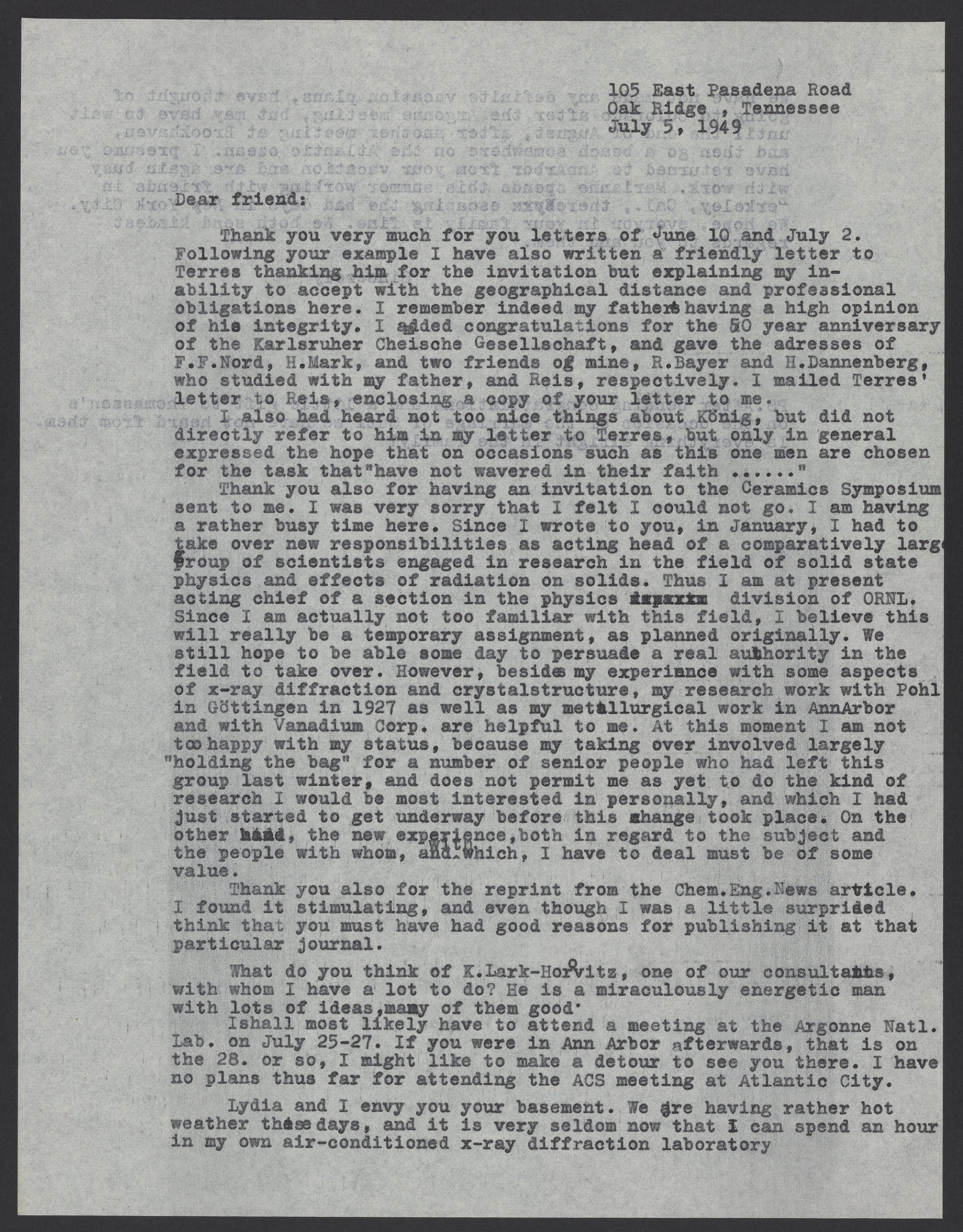 Letter from Max Bredig July 5, 1949