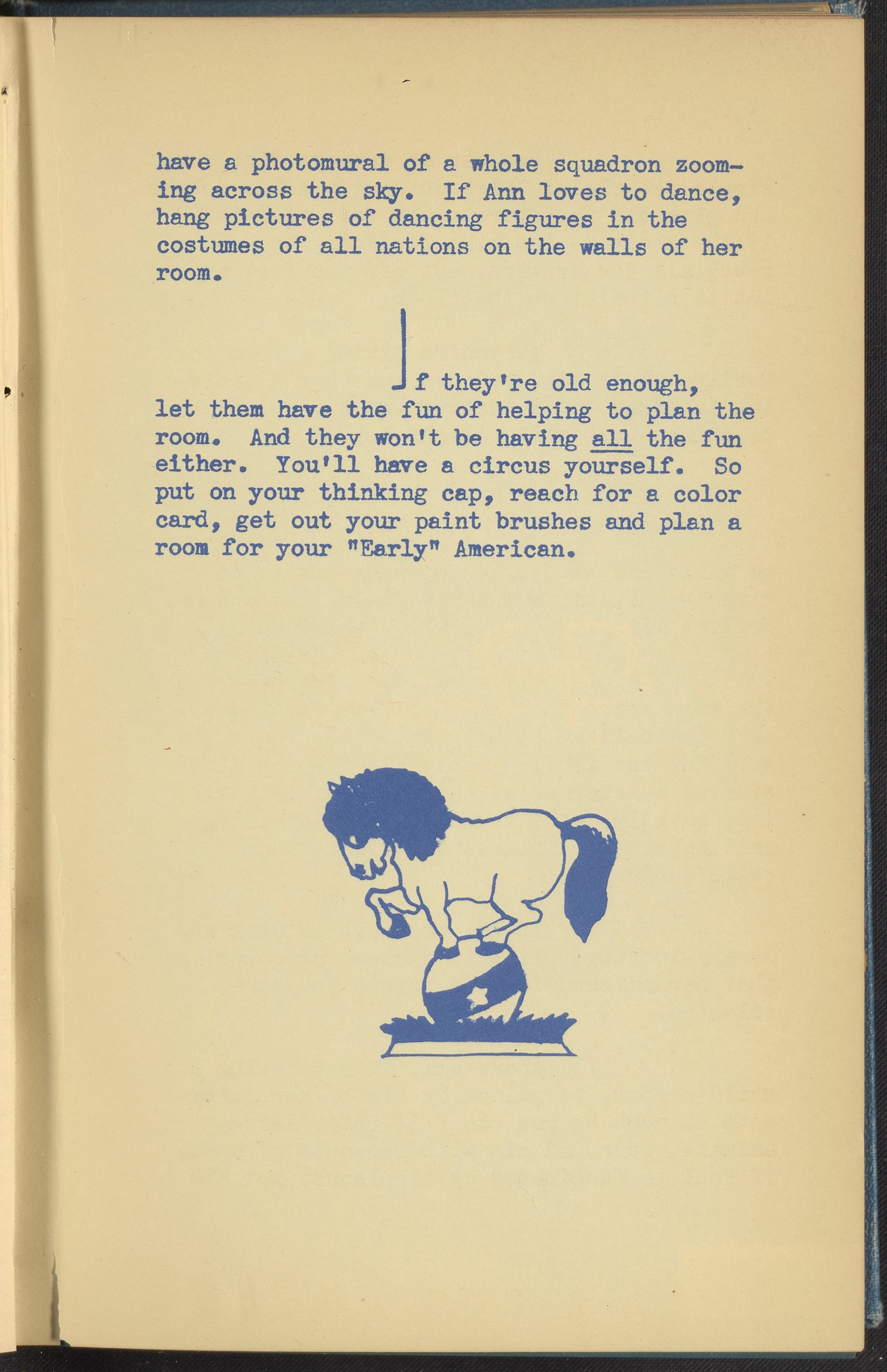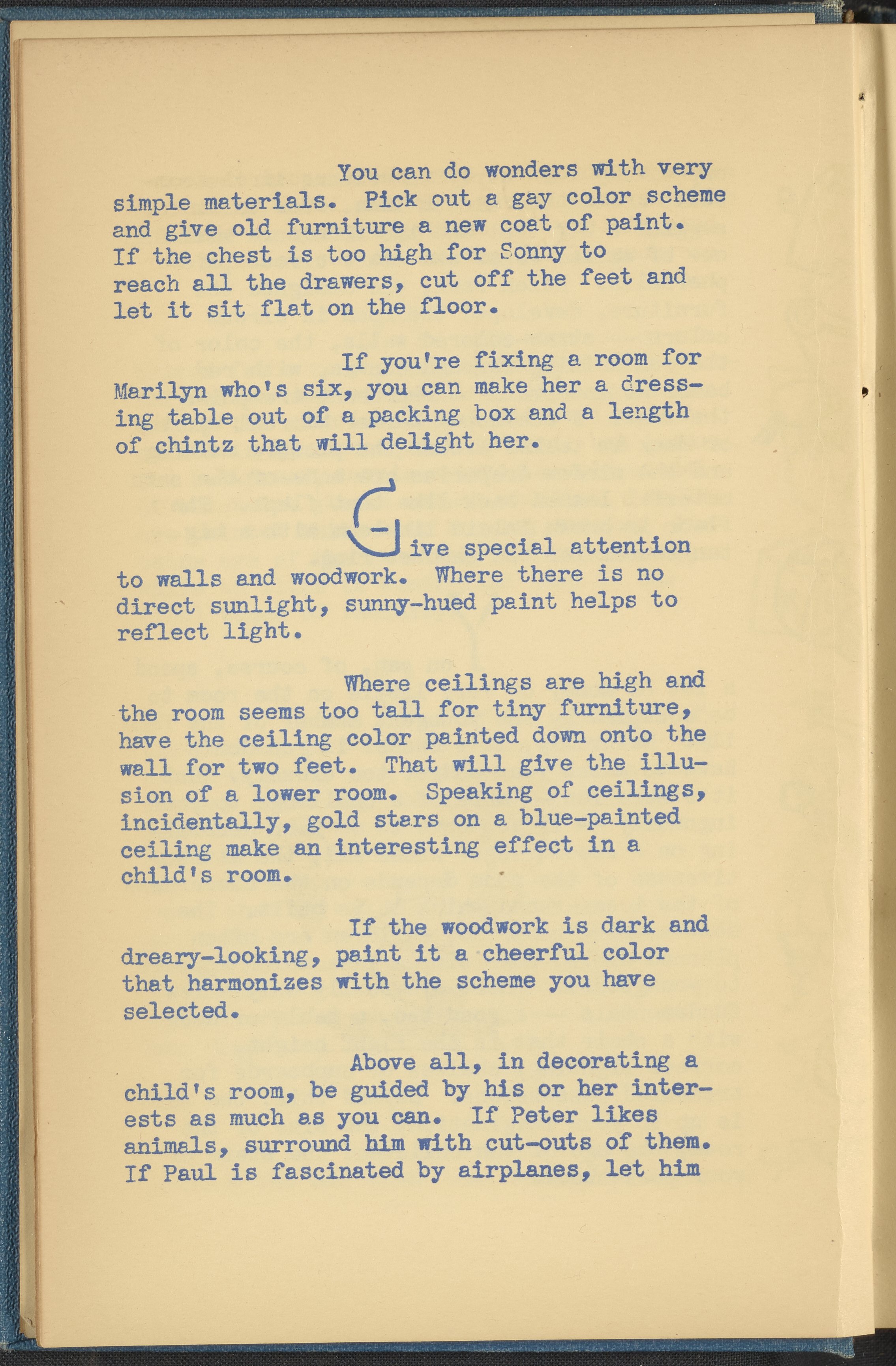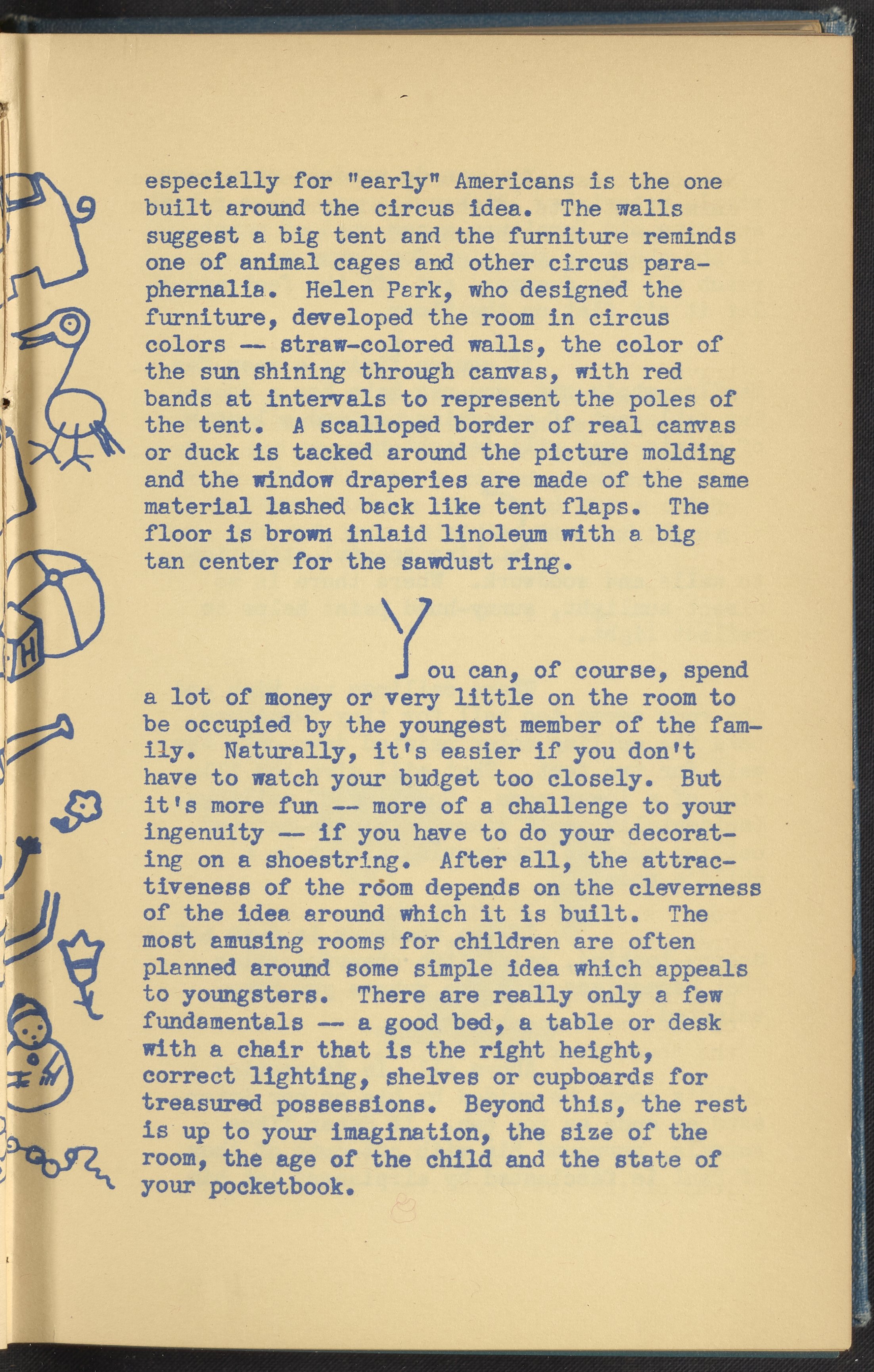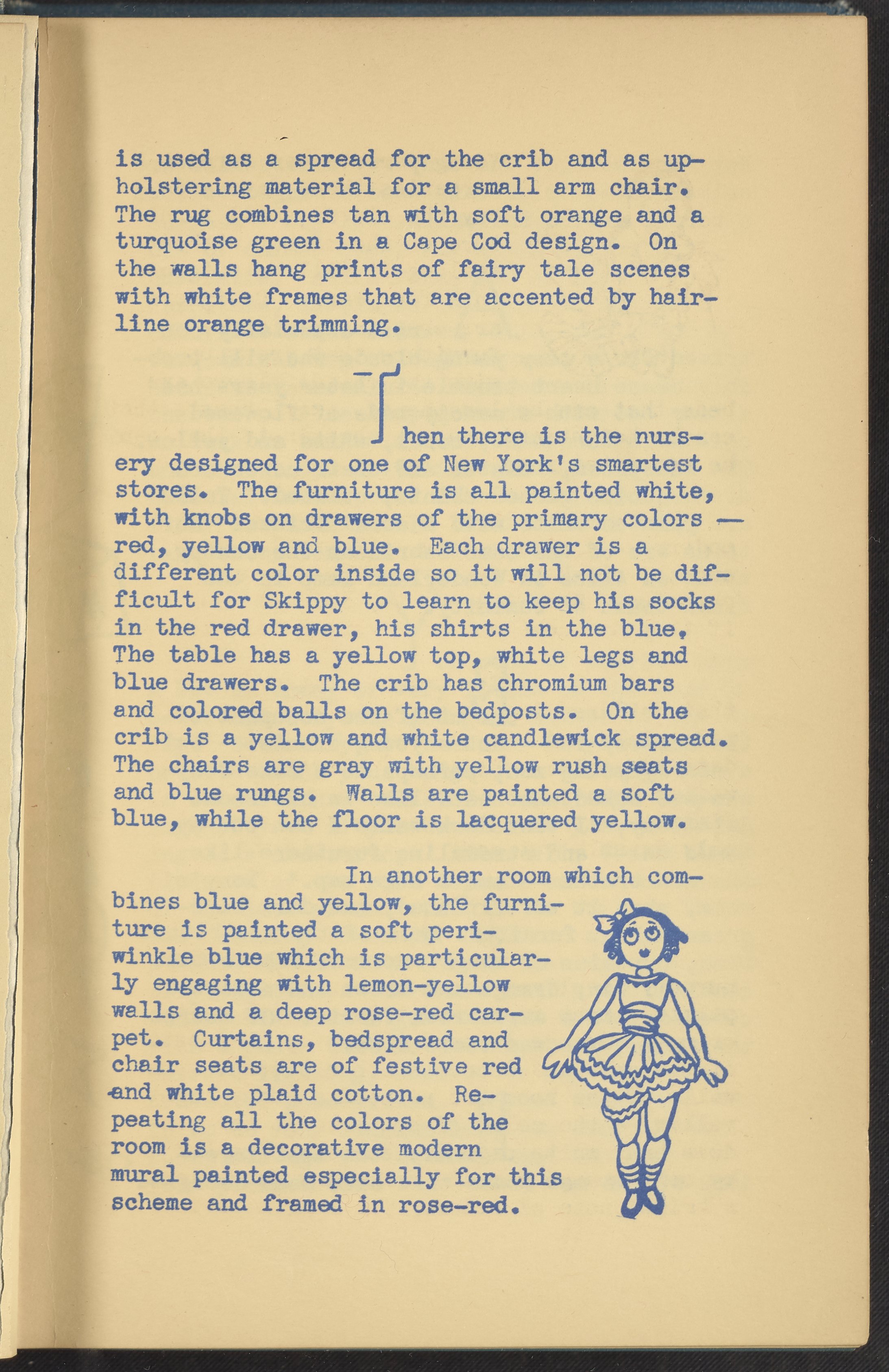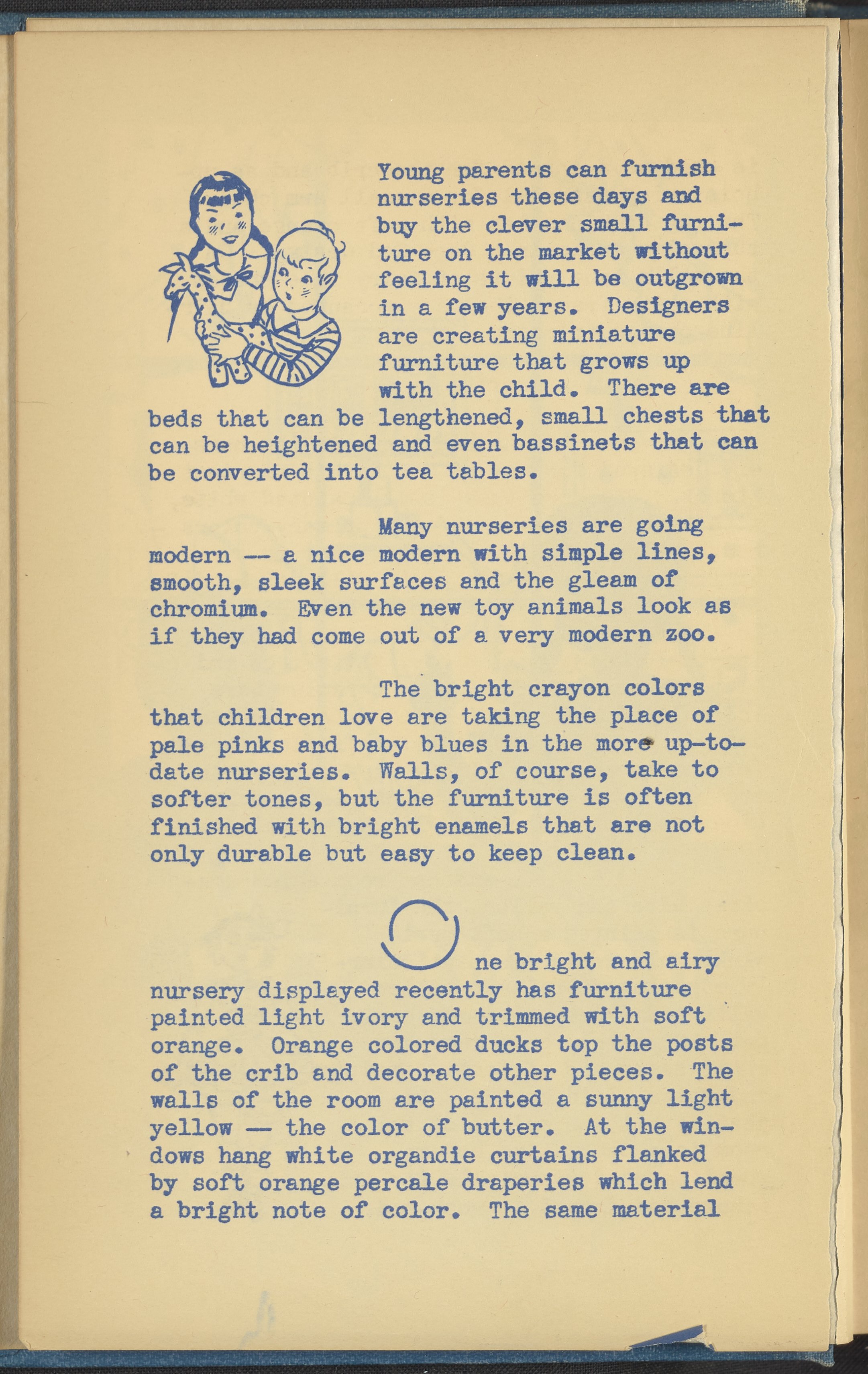 Booklet corresponding to a radio broadcast program created by the National Paint, Varnish, and Lacquer Association. The booklet discusses trends for nursery and children's bedroom decoration. Describes several nurseries with varying design elements and themes for inspiration. Then, provides tips for remodeling a child's bedroom on a budget. Includes small stylized illustrations throughout and decorated covers.