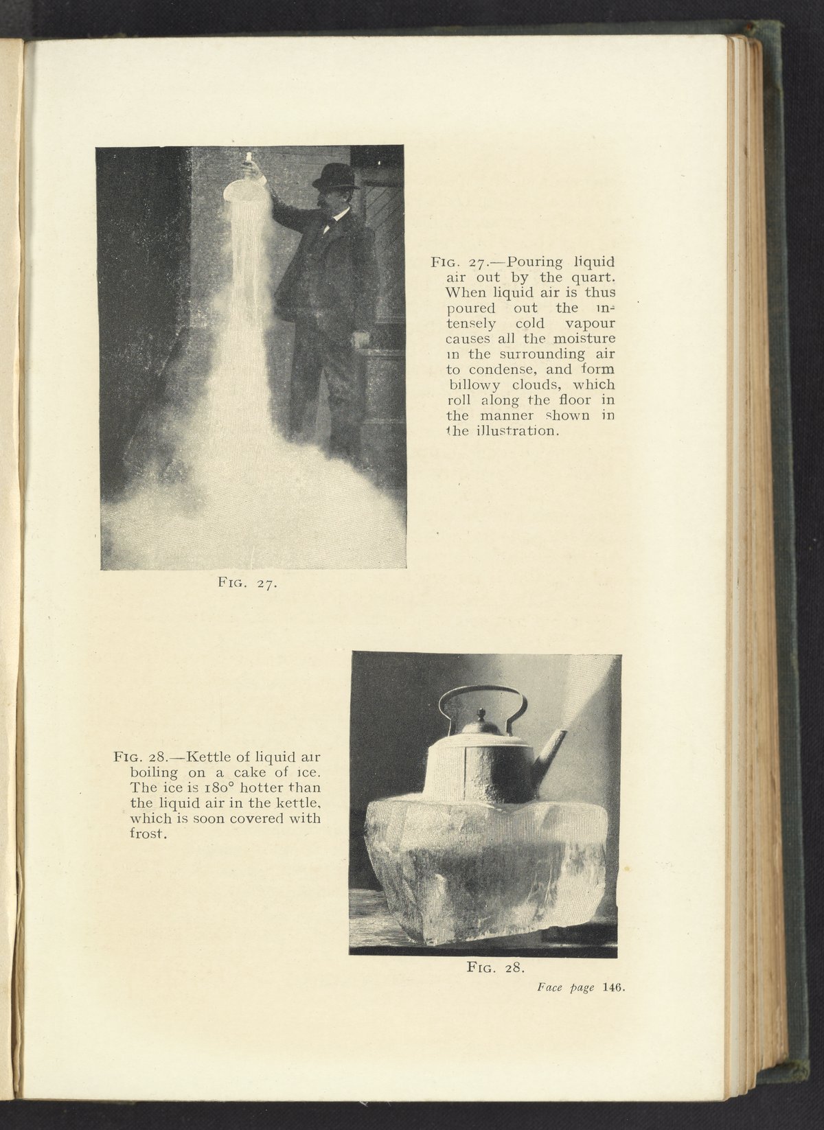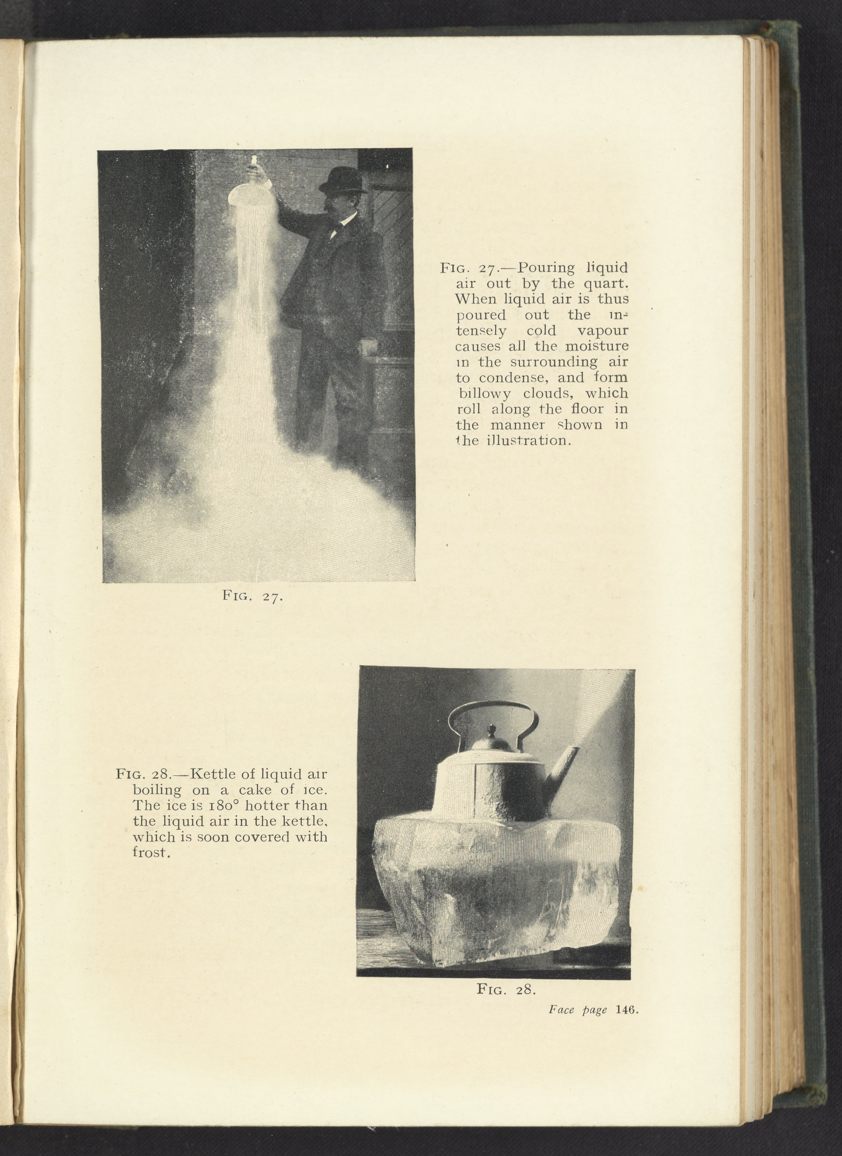 Fig. 27: Pouring Liquid Air; Fig. 28: Kettle of Liquid Air on a Cake of Ice