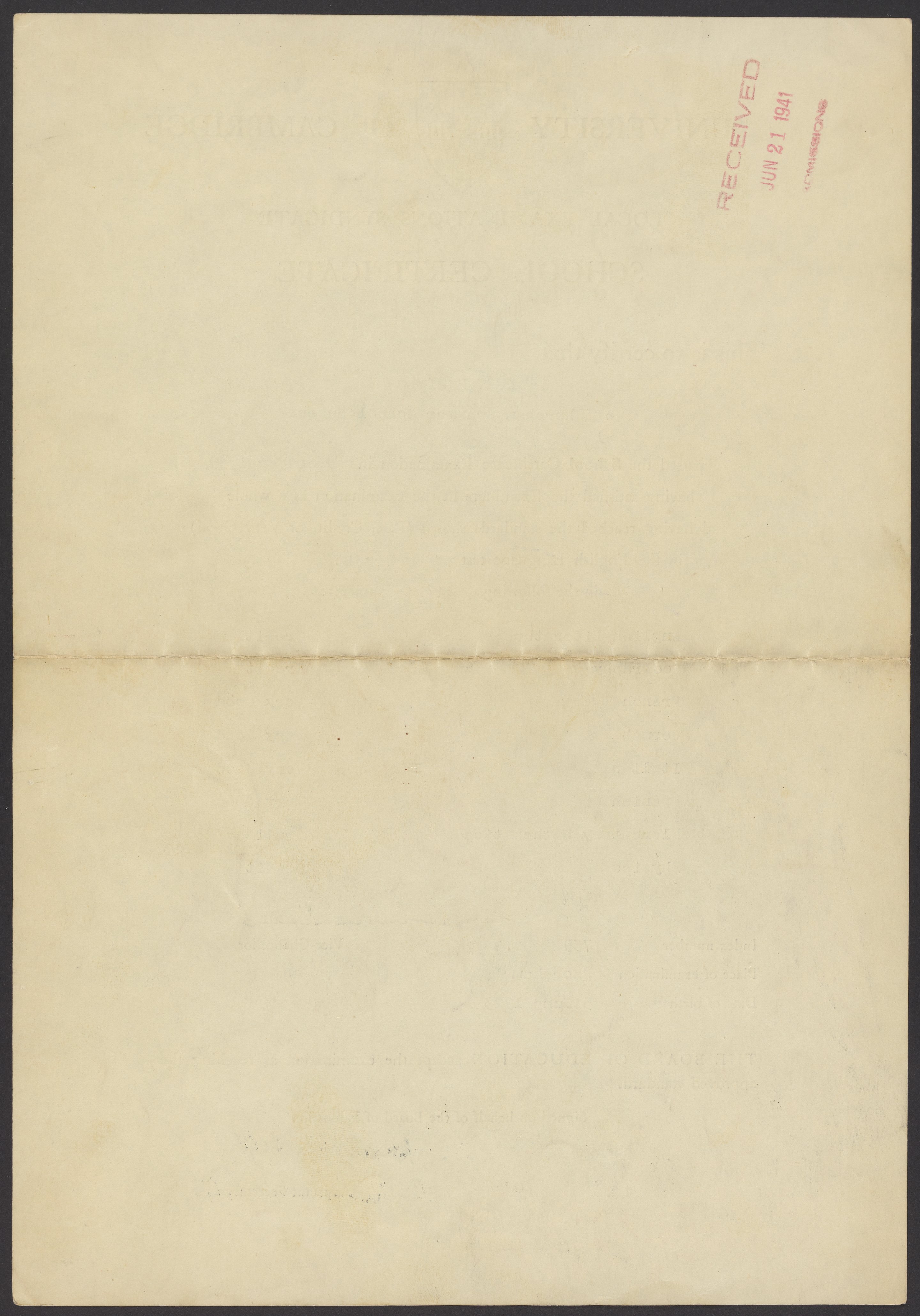 Certificate from the University of Cambridge Local Examinations Syndicate (UCLES), also known as the Cambridge Assessment, certifying that Kurt M. Mislow (1923-2017) of Shoreham Grammar School, Sussex, passed his school certificate exam in December 1939.