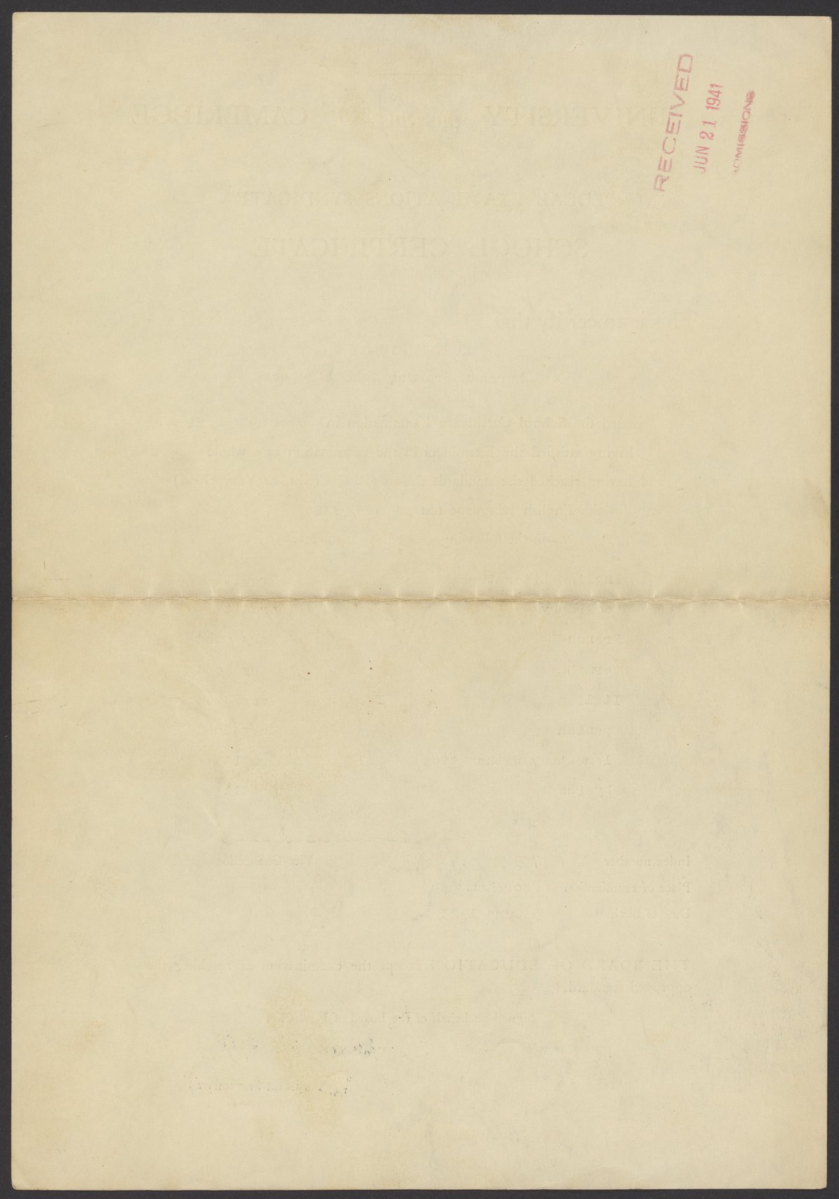 Certificate from the University of Cambridge Local Examinations Syndicate (UCLES), also known as the Cambridge Assessment, certifying that Kurt M. Mislow (1923-2017) of Shoreham Grammar School, Sussex, passed his school certificate exam in December 1939.