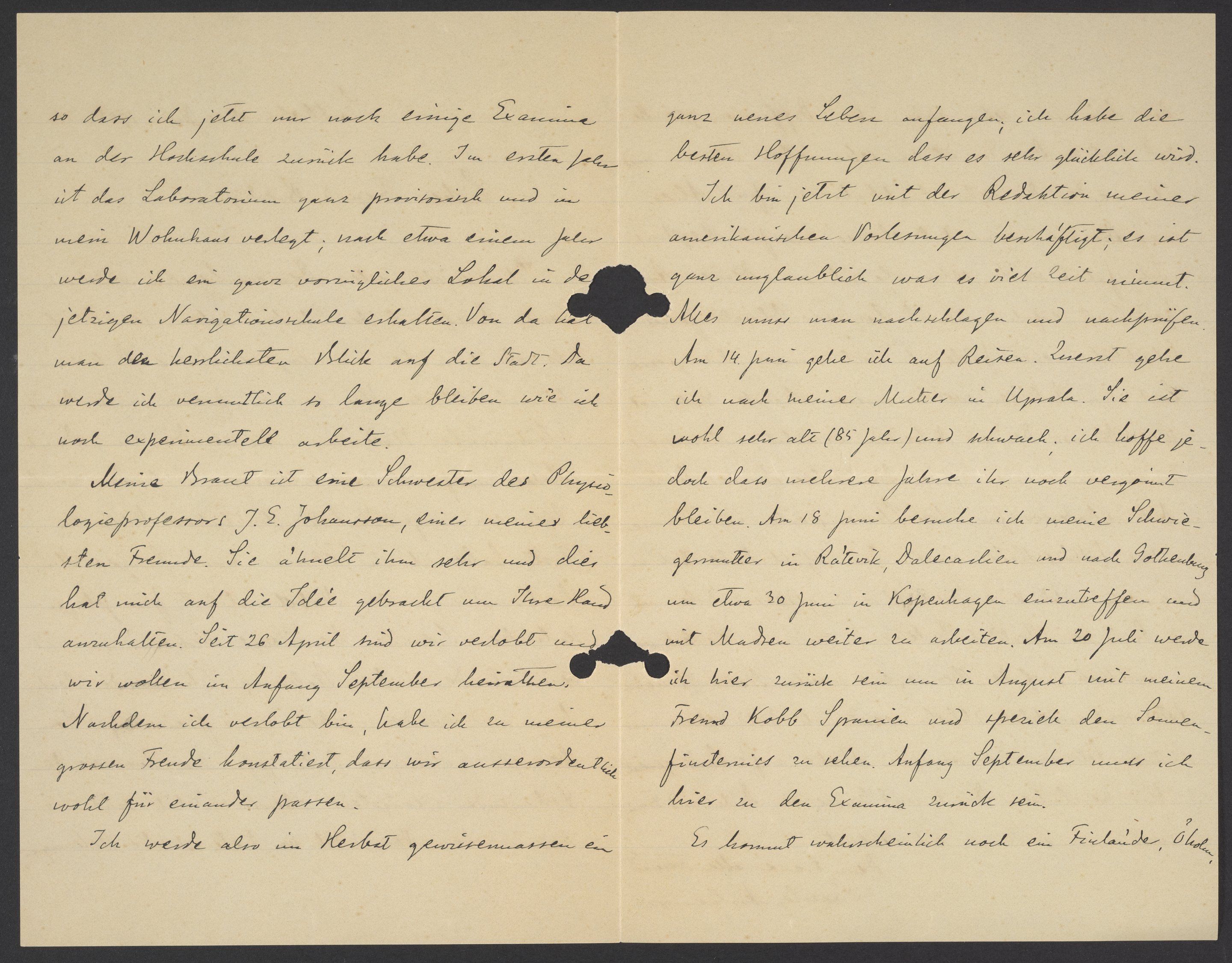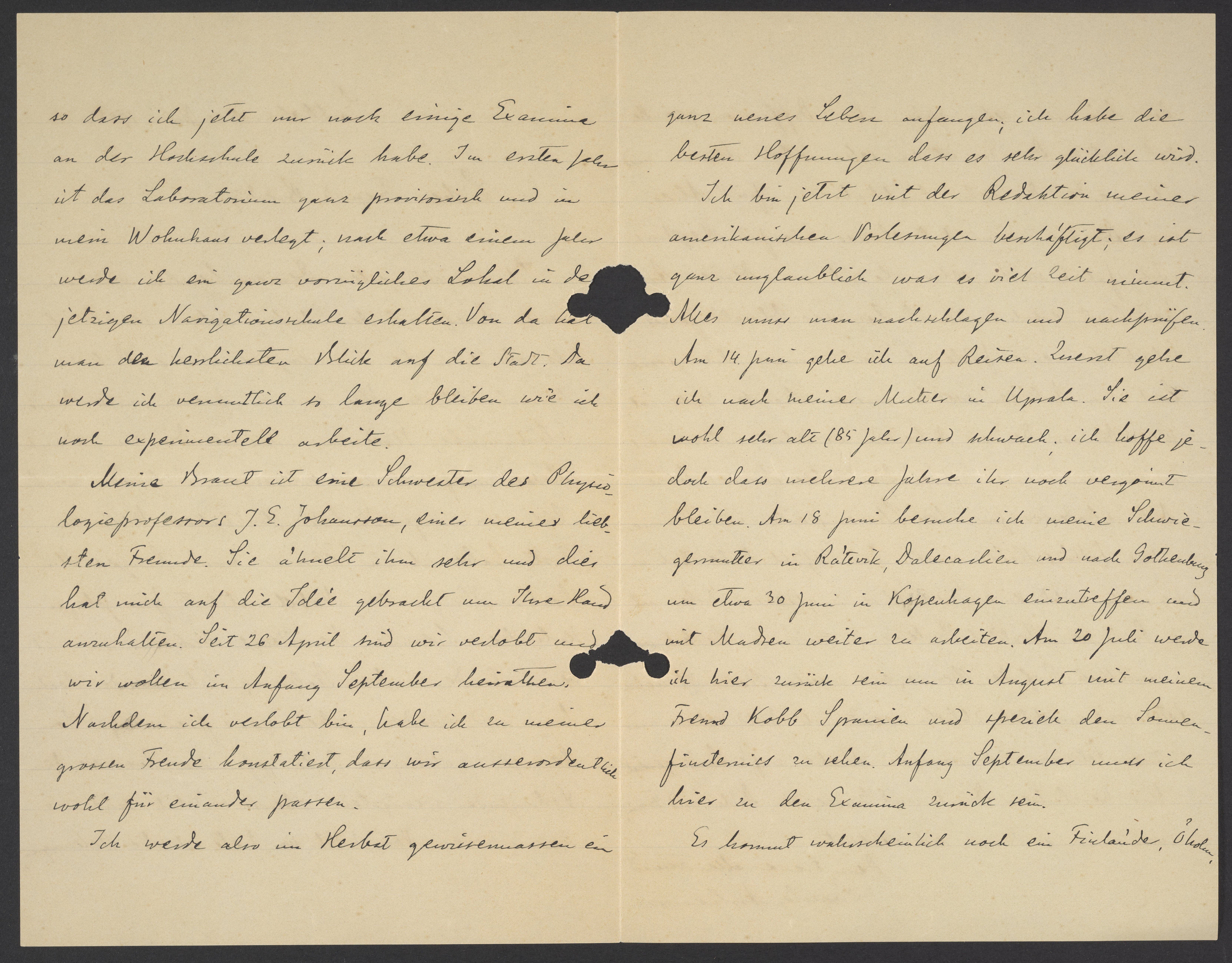Meine Braut ist eine Schwester des Physiologieprofessors J.E Johansson, einer meiner liebsten Freunde. Sie ähnelt ihm sehr und dies hat mich auf die Idee gebrahct um Ihre Hand anzuhalten. Seit 26. April sind wir verlobt und wir wollen im Anfang September heiraten. Nachdem ich verlobt bin, habe ich zu meiner grossen Freude konstatiert, dass wir ausserordentlich wohl für einander passen.