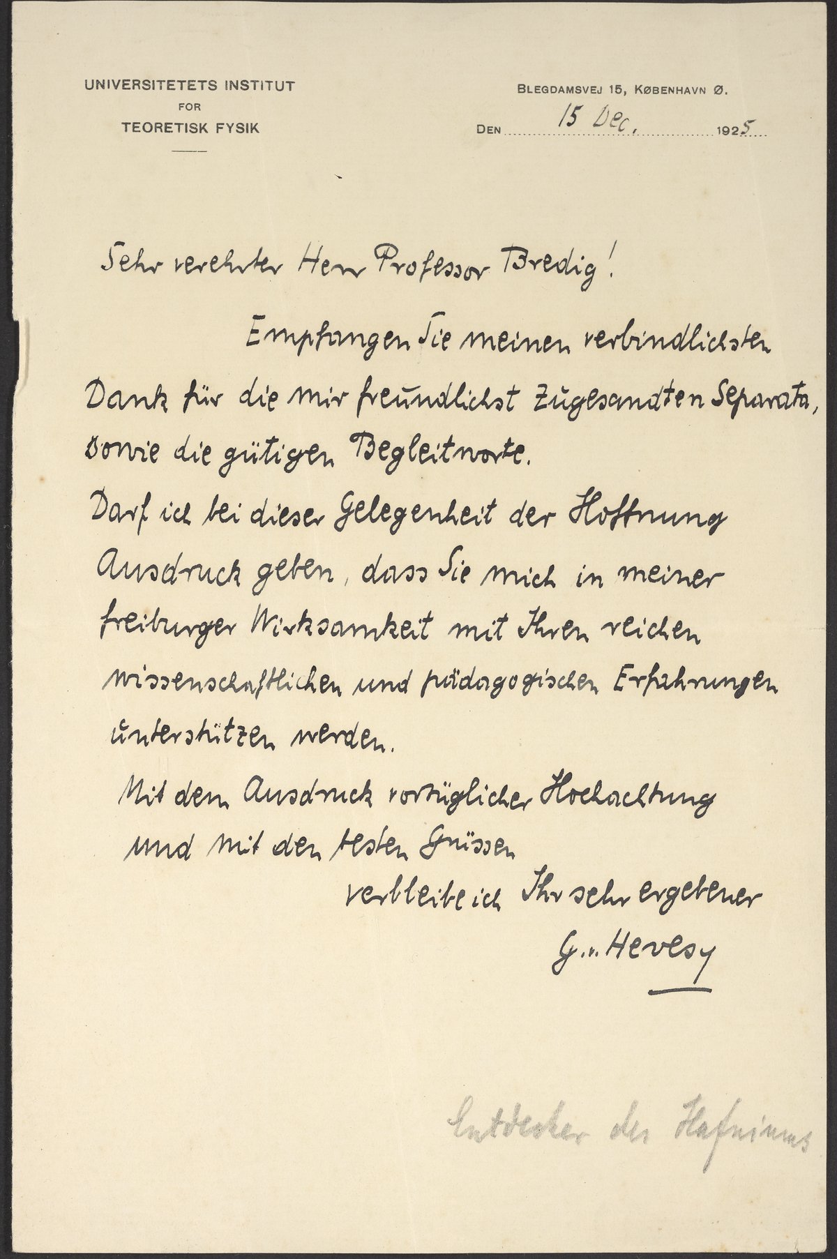 Letter from George Hevesy to Georg Bredig