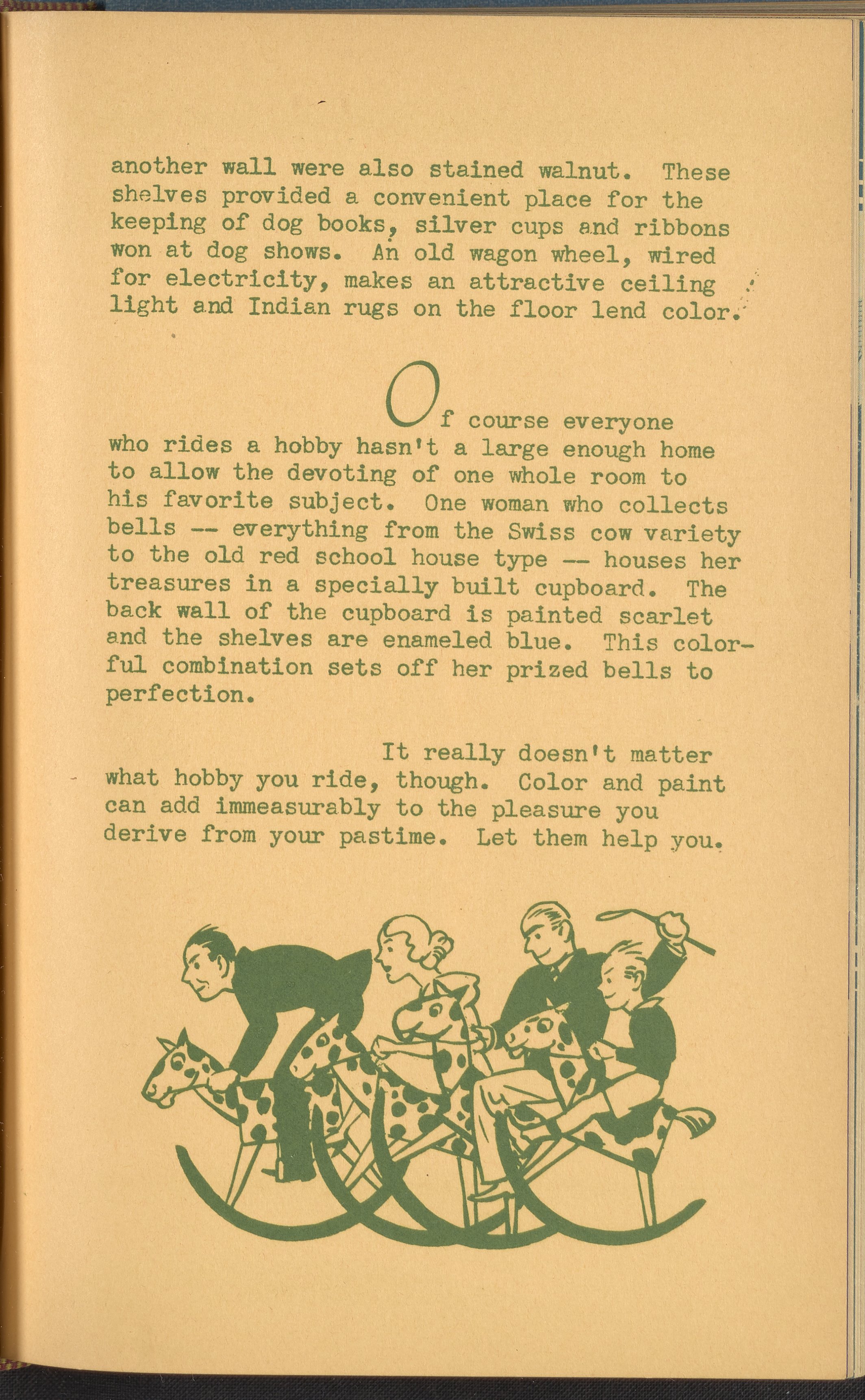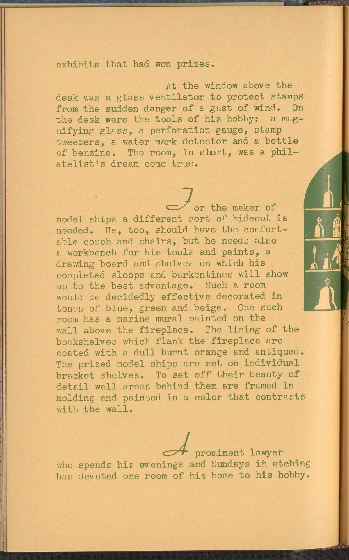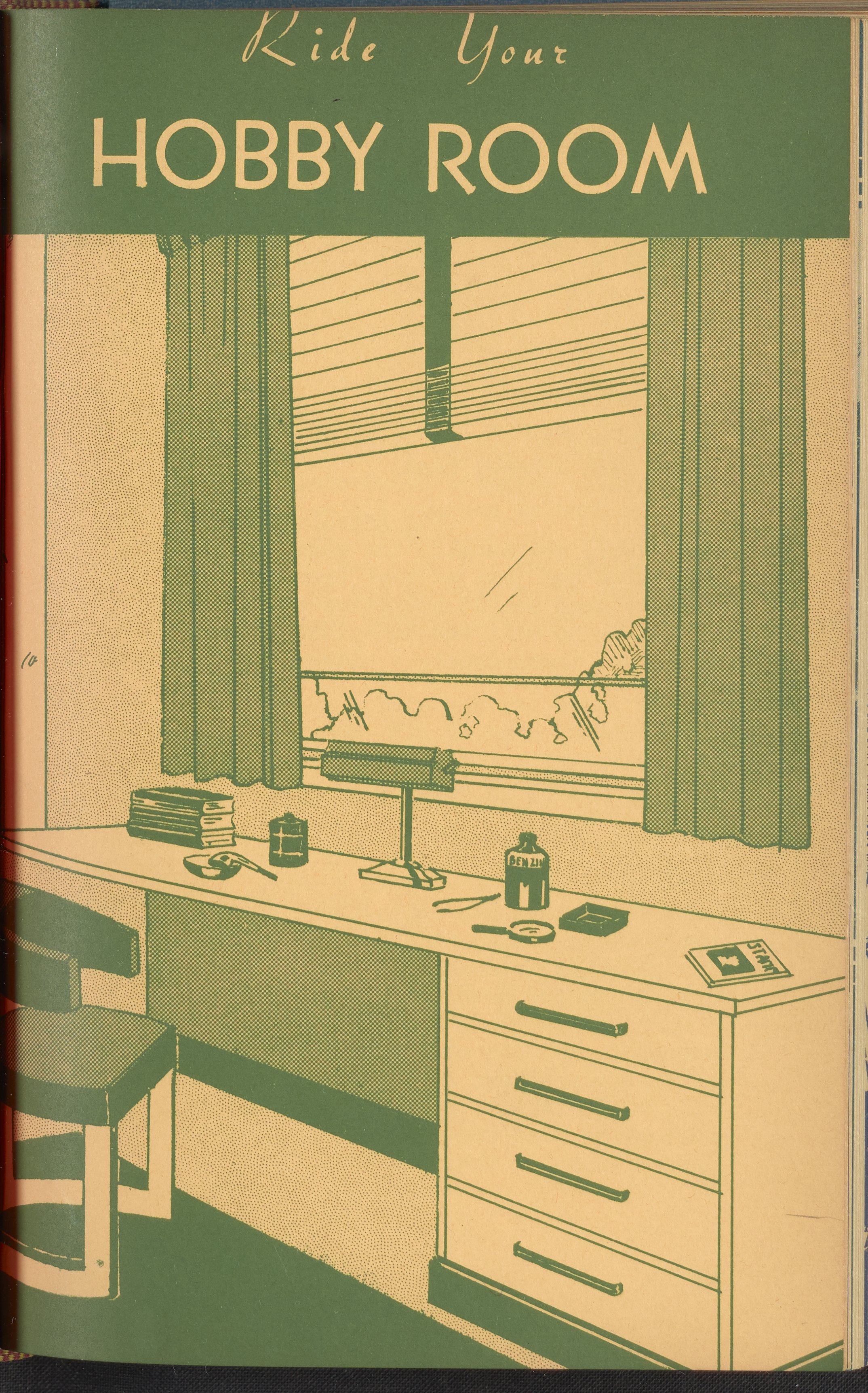 Booklet corresponding to a radio broadcast program created by the National Paint, Varnish, and Lacquer Association. The booklet describes how to decorate a hobby room, emphasizing the use of paint and color. Explains the decorative aspects of rooms suited to hobbies such as stamp collecting, model ship making, etching, or dog care. Also discusses how to decorate a hobby room combined with a game room. Includes small stylized illustrations throughout and decorated covers.