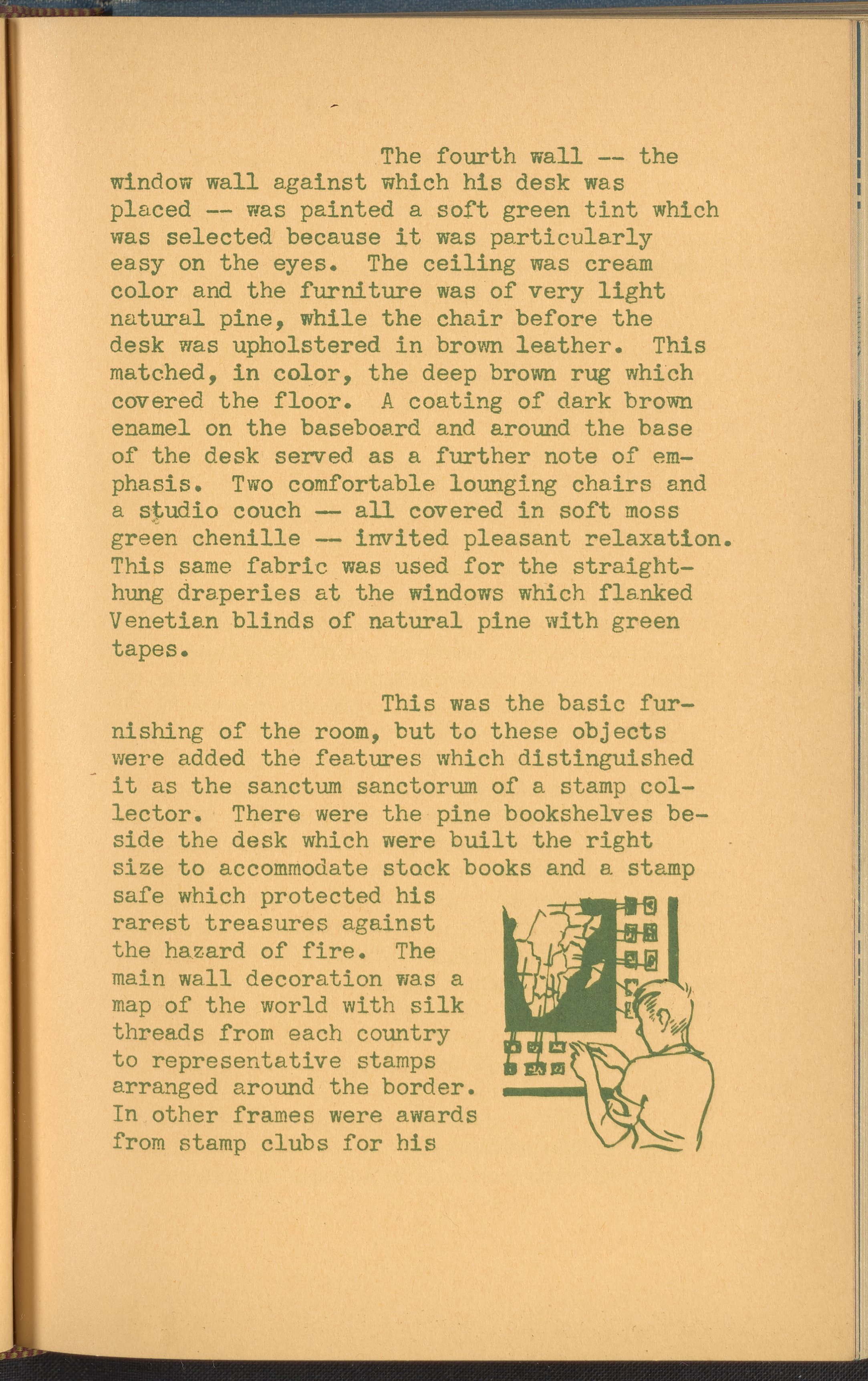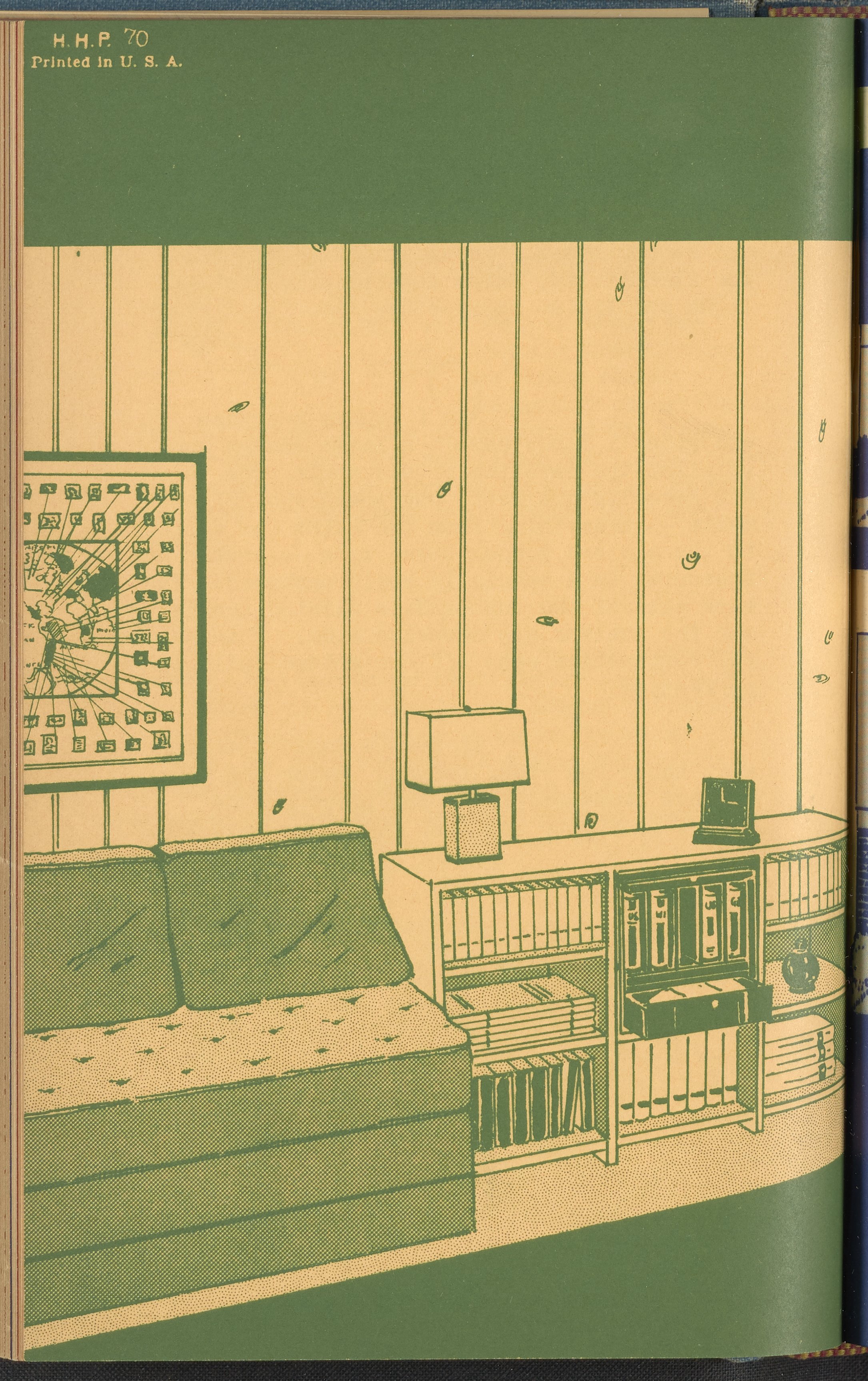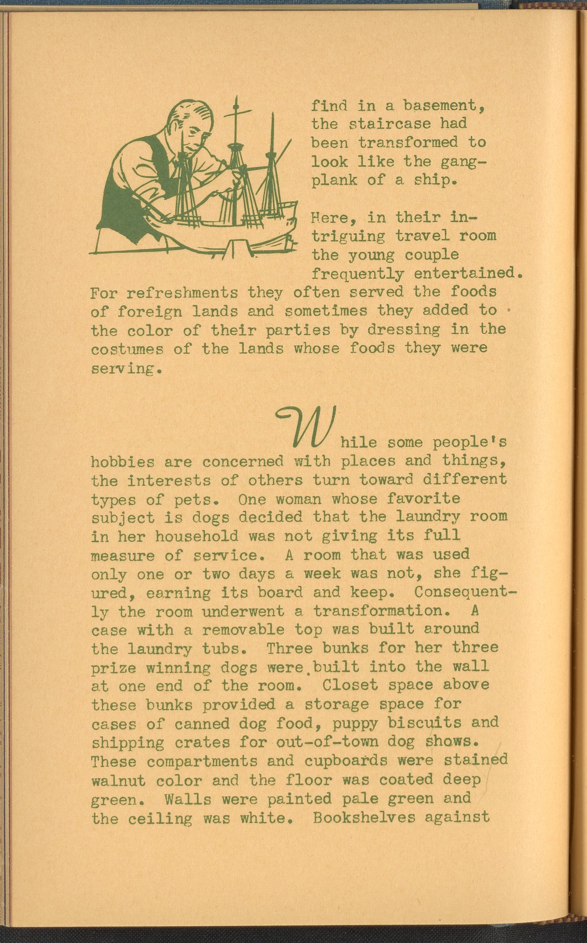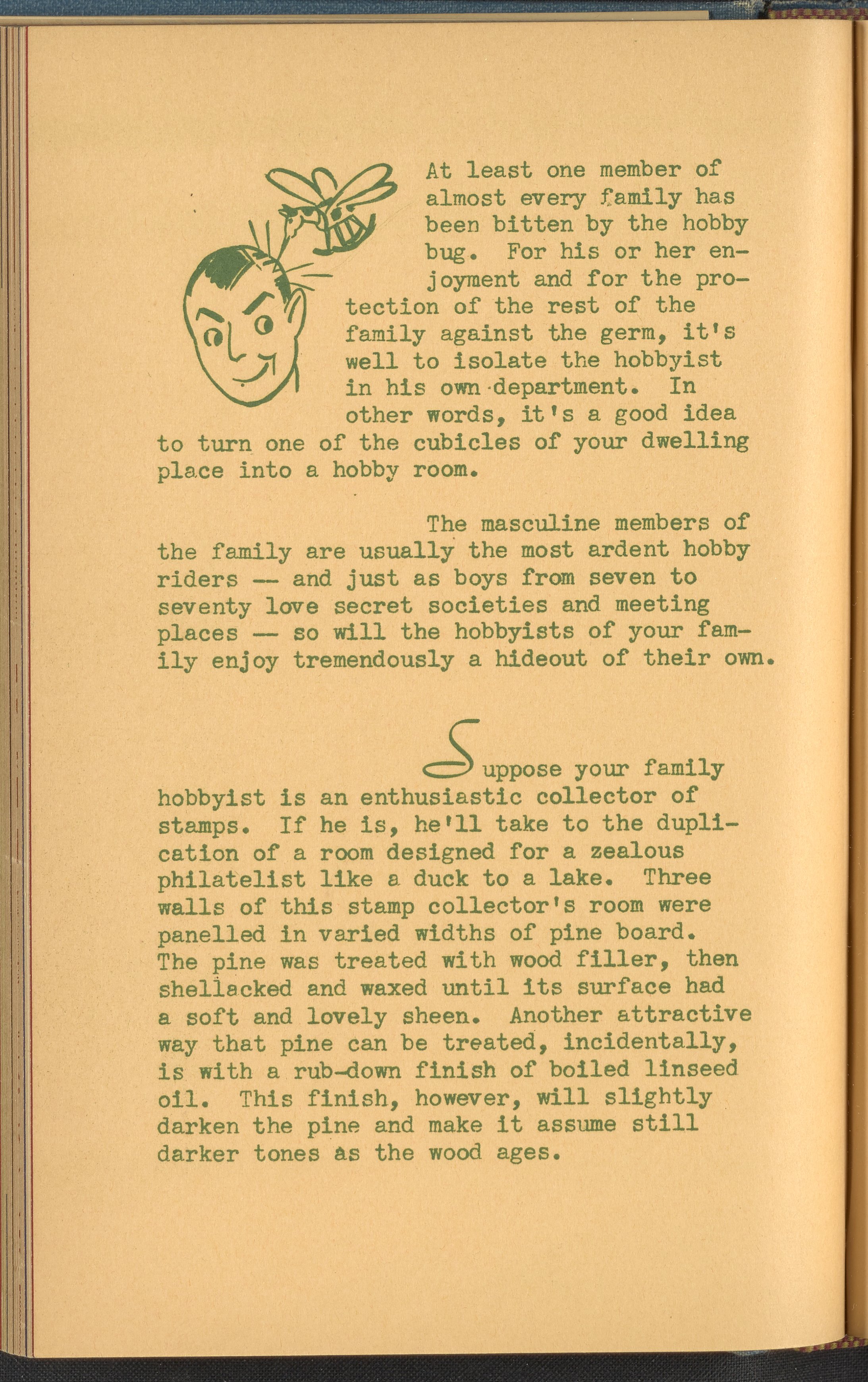 Booklet corresponding to a radio broadcast program created by the National Paint, Varnish, and Lacquer Association. The booklet describes how to decorate a hobby room, emphasizing the use of paint and color. Explains the decorative aspects of rooms suited to hobbies such as stamp collecting, model ship making, etching, or dog care. Also discusses how to decorate a hobby room combined with a game room. Includes small stylized illustrations throughout and decorated covers.