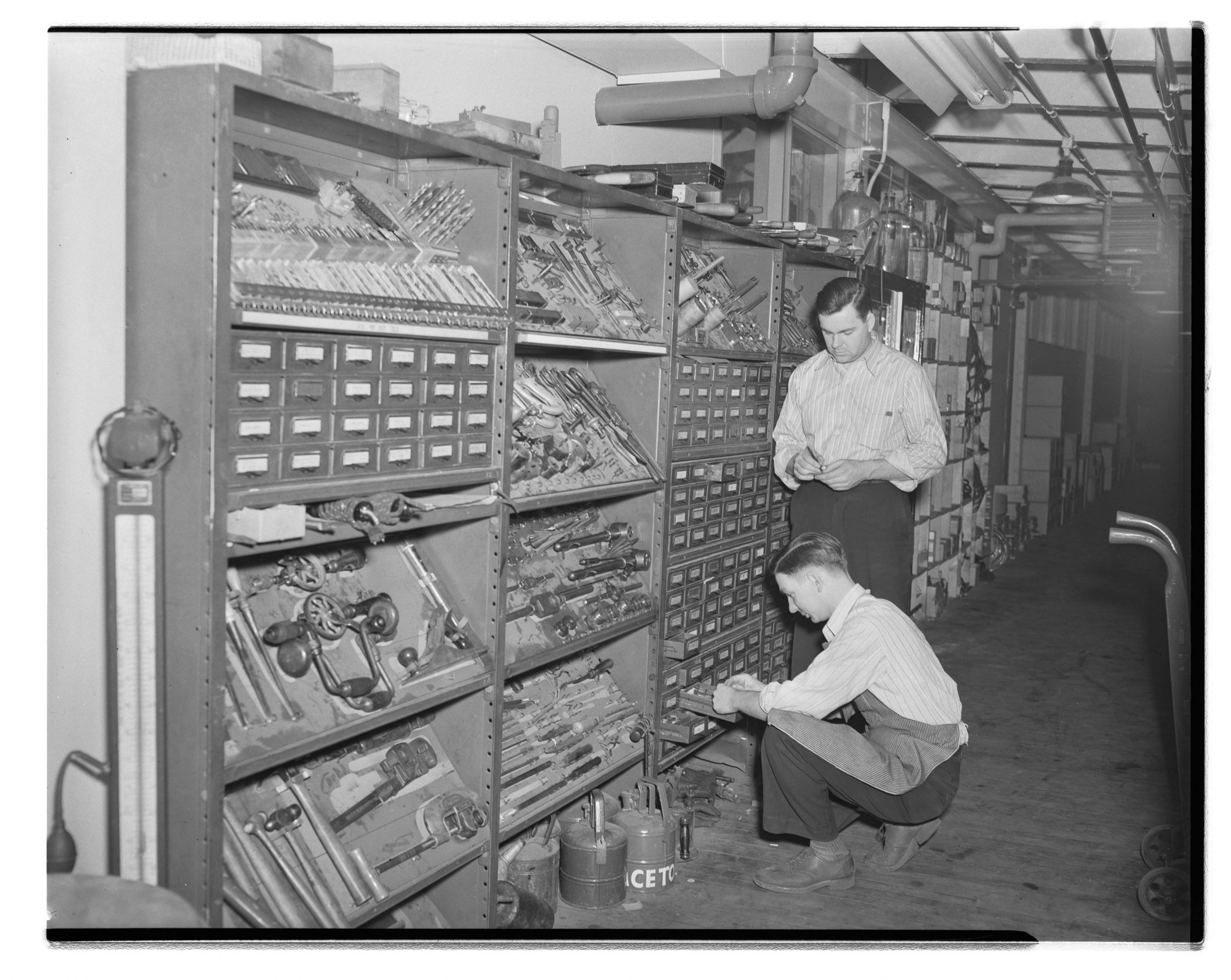 General view of Melvin Dietzel (kneeling) and Larry Oeffner examining the stock supply of replacement parts in the Dow Chemical Company's Instrument Department. Established in 1926, the Instrument Department was responsible for the installation and maintenance of the assorted apparatus necessary to manage the plant's production facilities and processes. The department notably maintained accurate standards for temperatures, voltage, resistance, flow and pressures against which the plant's instruments were regularly calibrated and checked for accuracy.