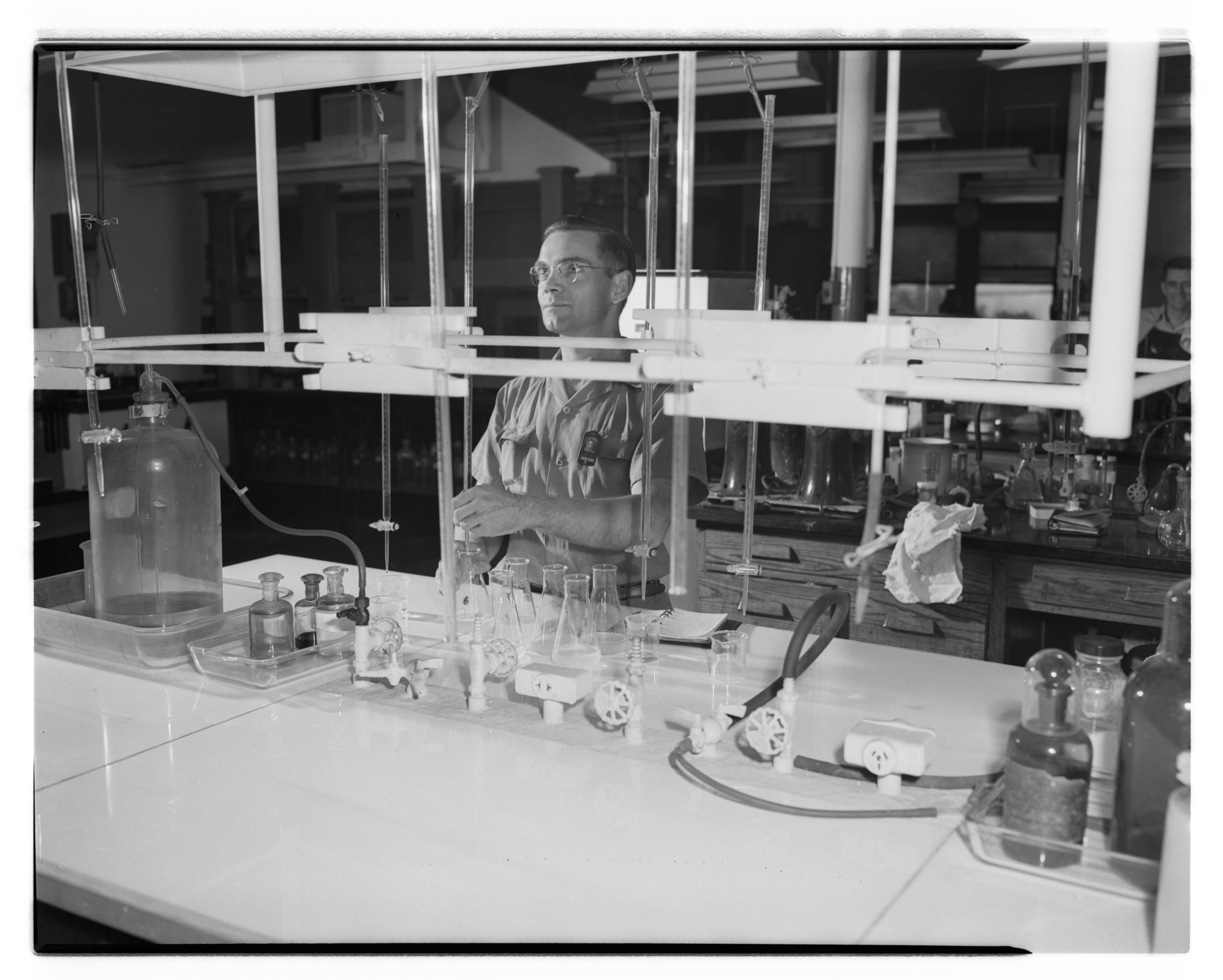 Dow Chemical Company. “Leo Ruhnau Conducting Acid Analysis in Dow Chemical Company Laboratory,” 1944. Dow Chemical Company Historical Image Collection, Box 7, Folder Plants--Main Laboratory (Old). Science History Institute. Philadelphia. https://digital.sciencehistory.org/works/mk61rh48m.