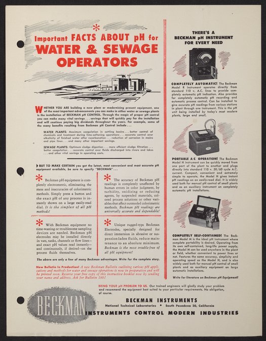 Beckman Instruments, Inc. “Important Facts About PH for Water & Sewage Operators,” 1950–1959. Beckman Historical Collection, Box 18, Folder 30. Science History Institute. Philadelphia. https://digital.sciencehistory.org/works/mk61rh49w.