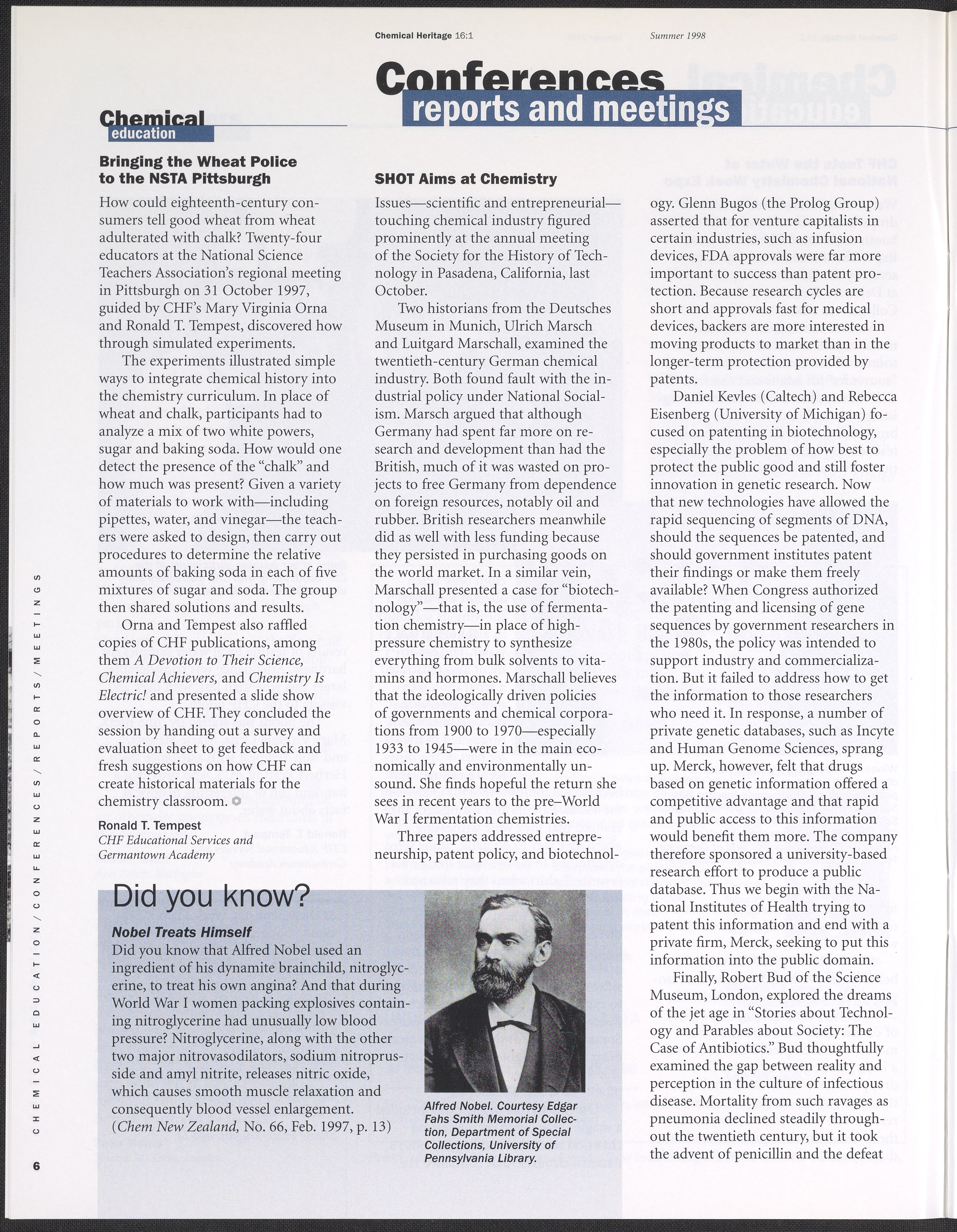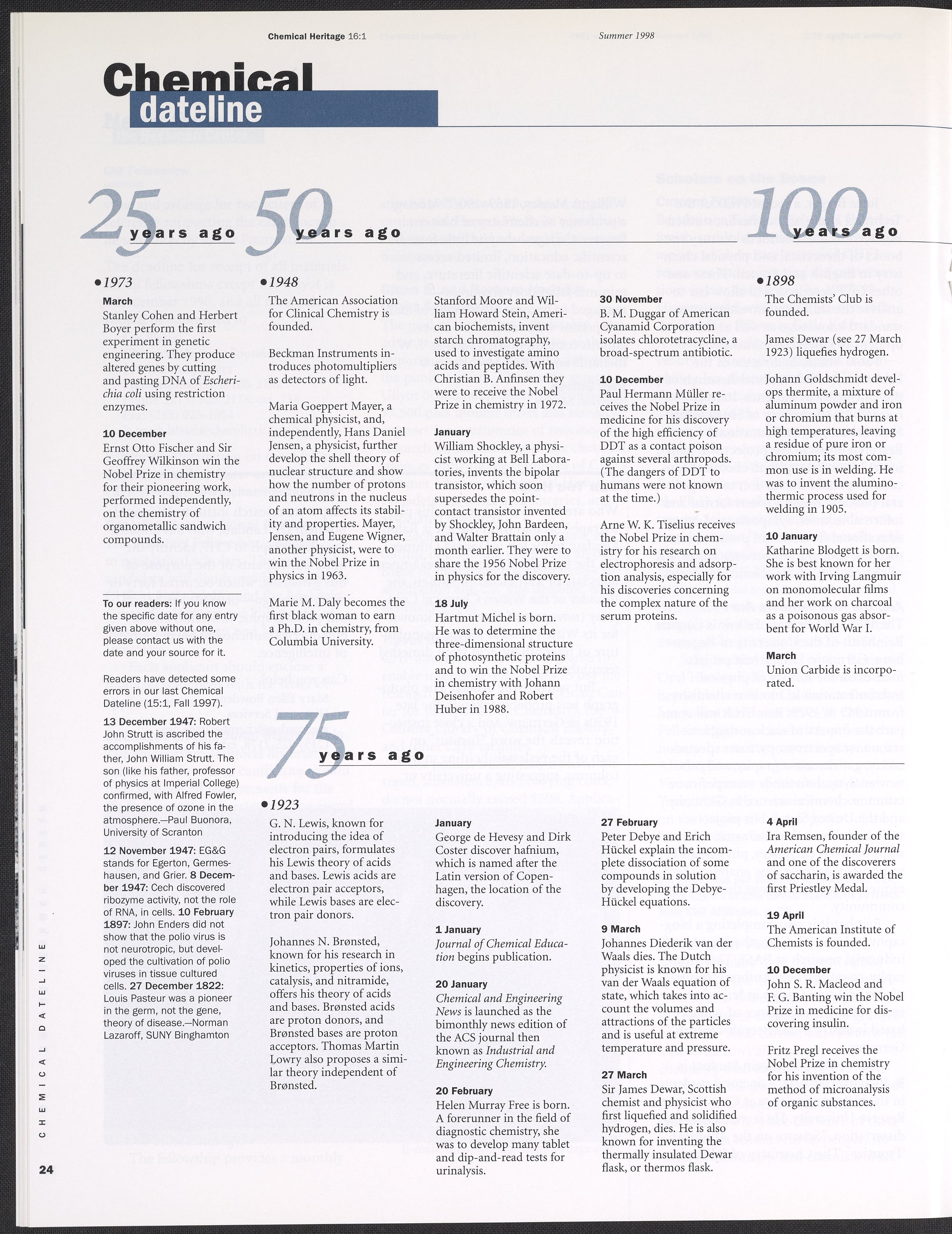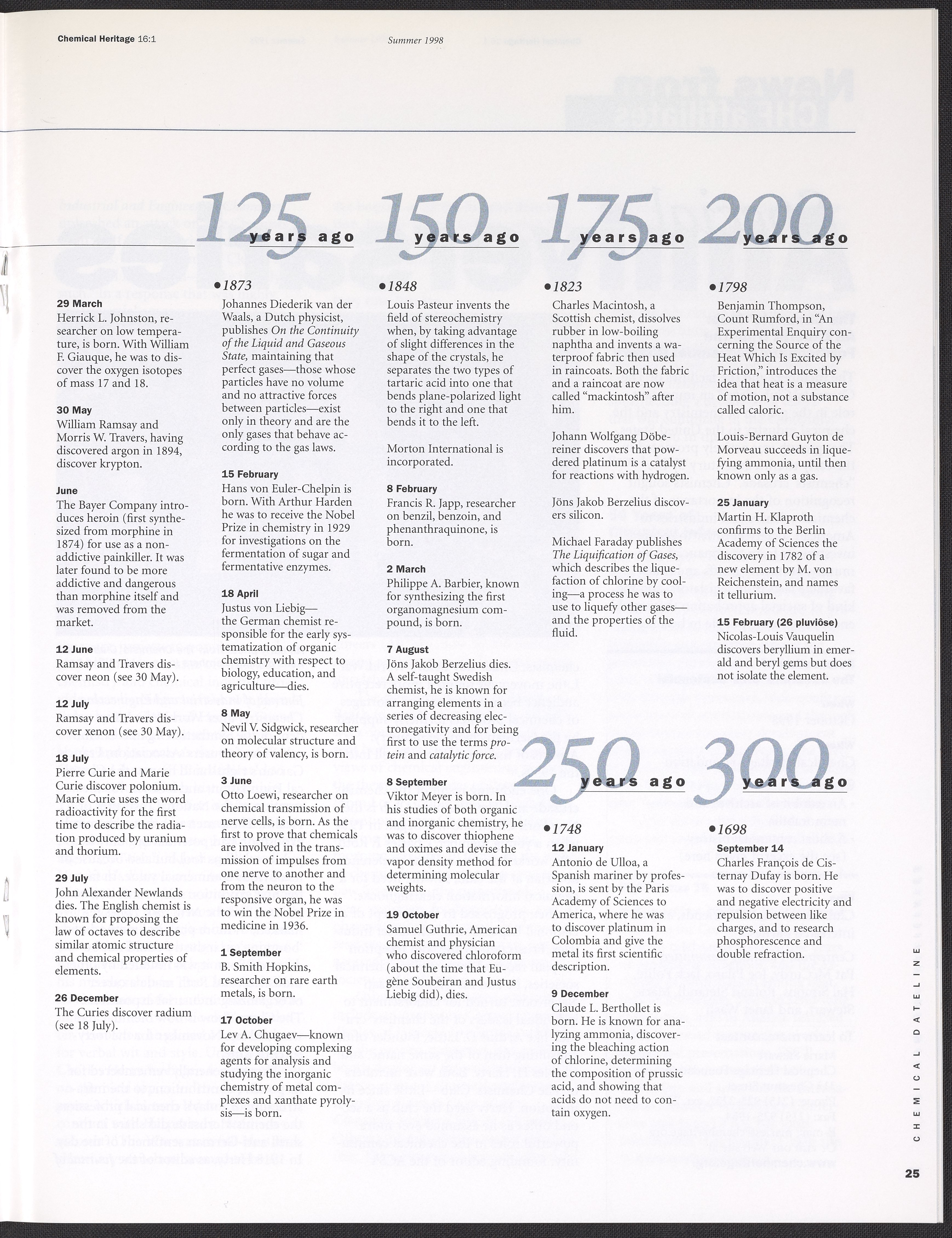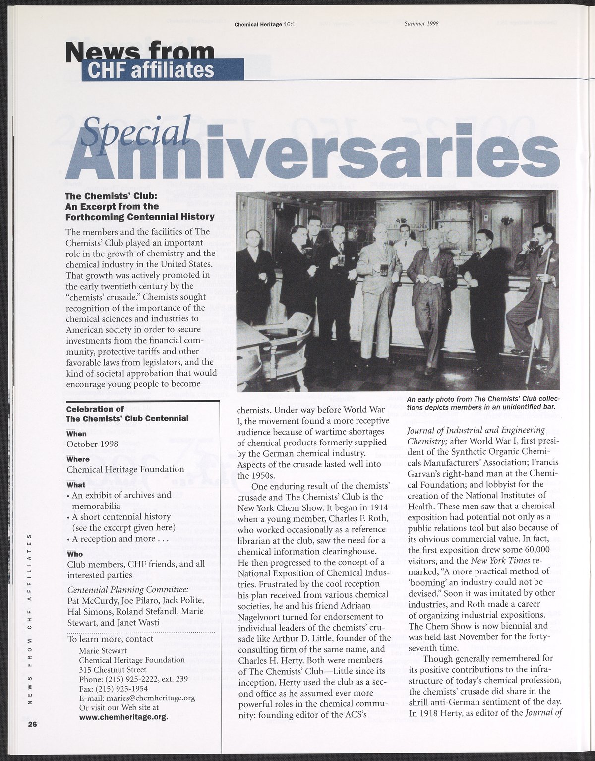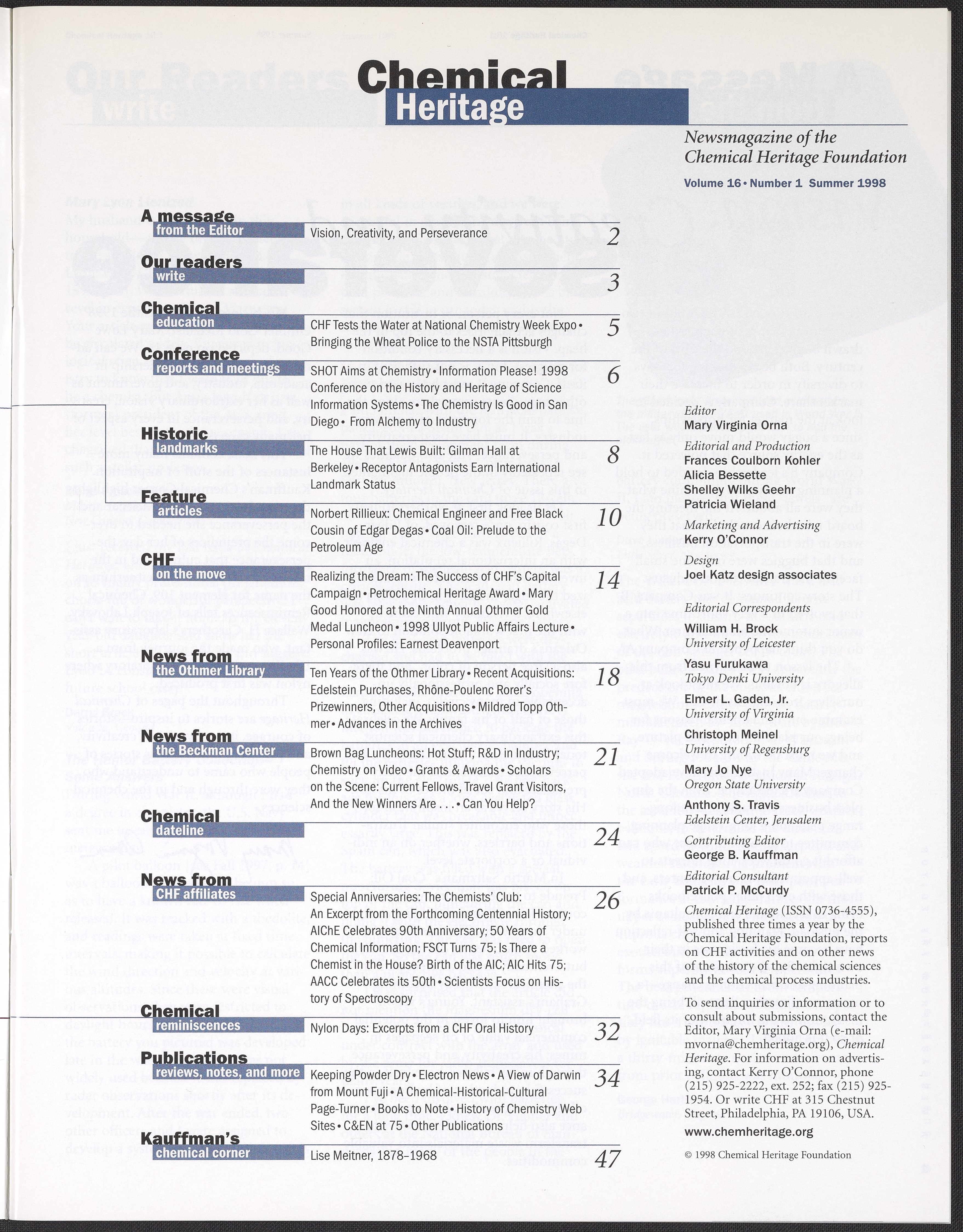 “Chemical Heritage, Volume 16 Number 1.” Philadelphia, Pennsylvania: Chemical Heritage Foundation, 1998. 099C001. Science History Institute. Philadelphia. https://digital.sciencehistory.org/works/ml0gd3o.