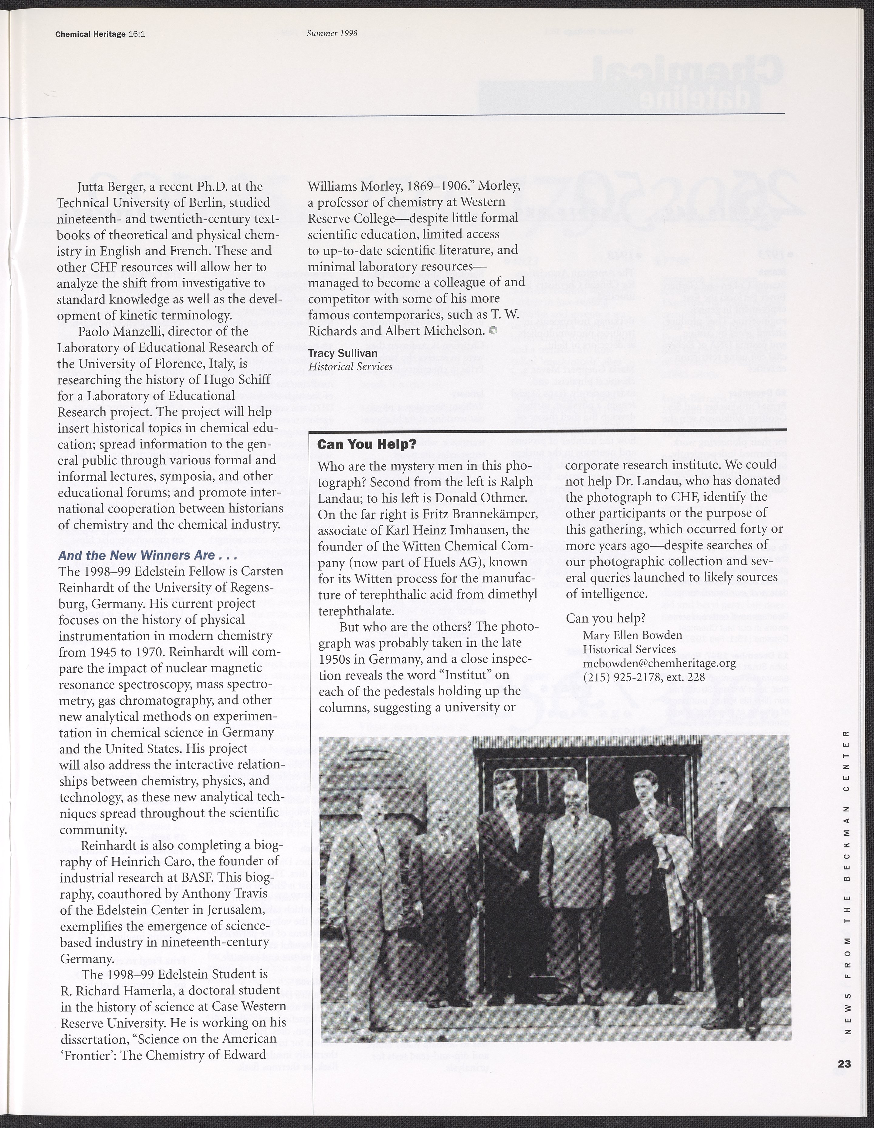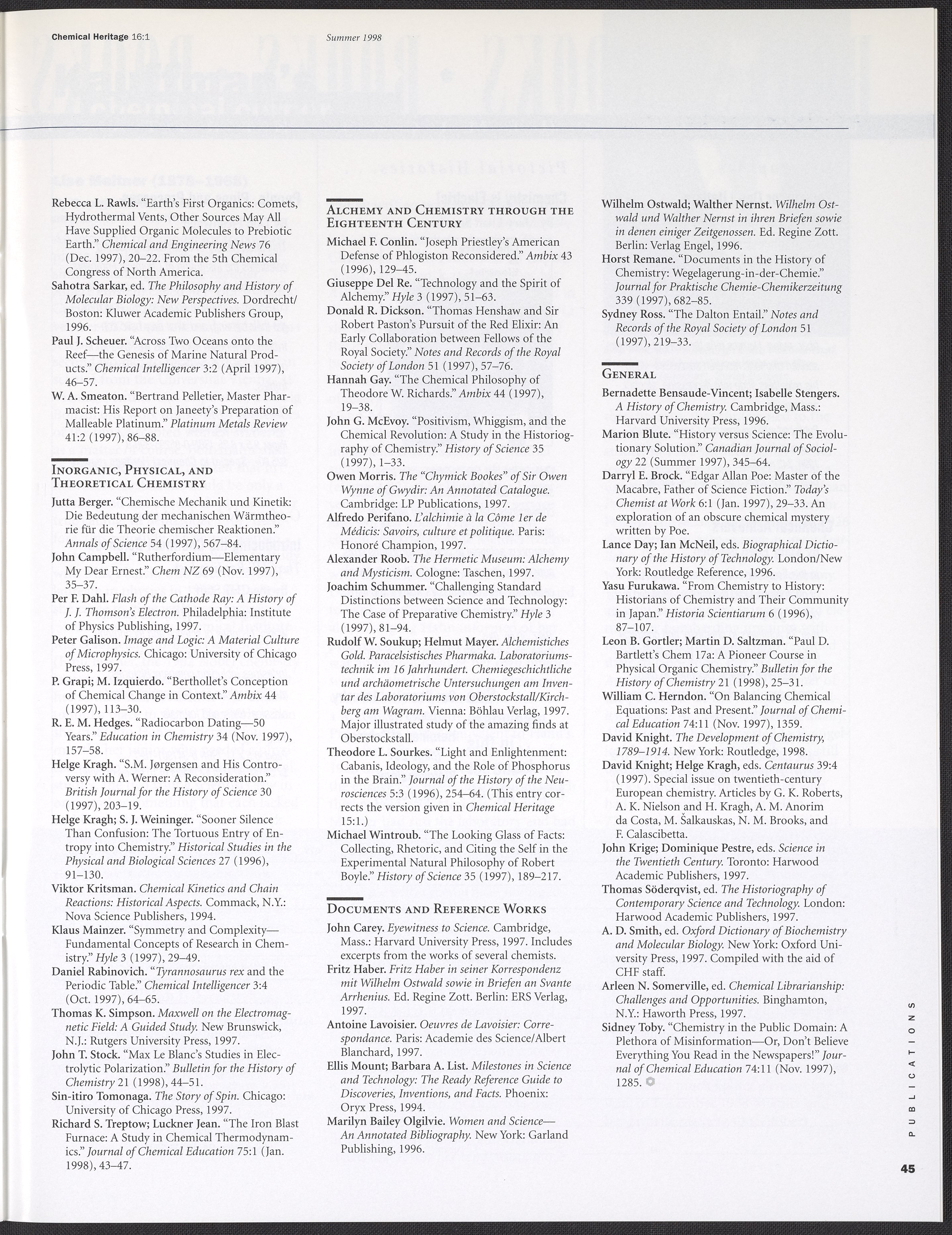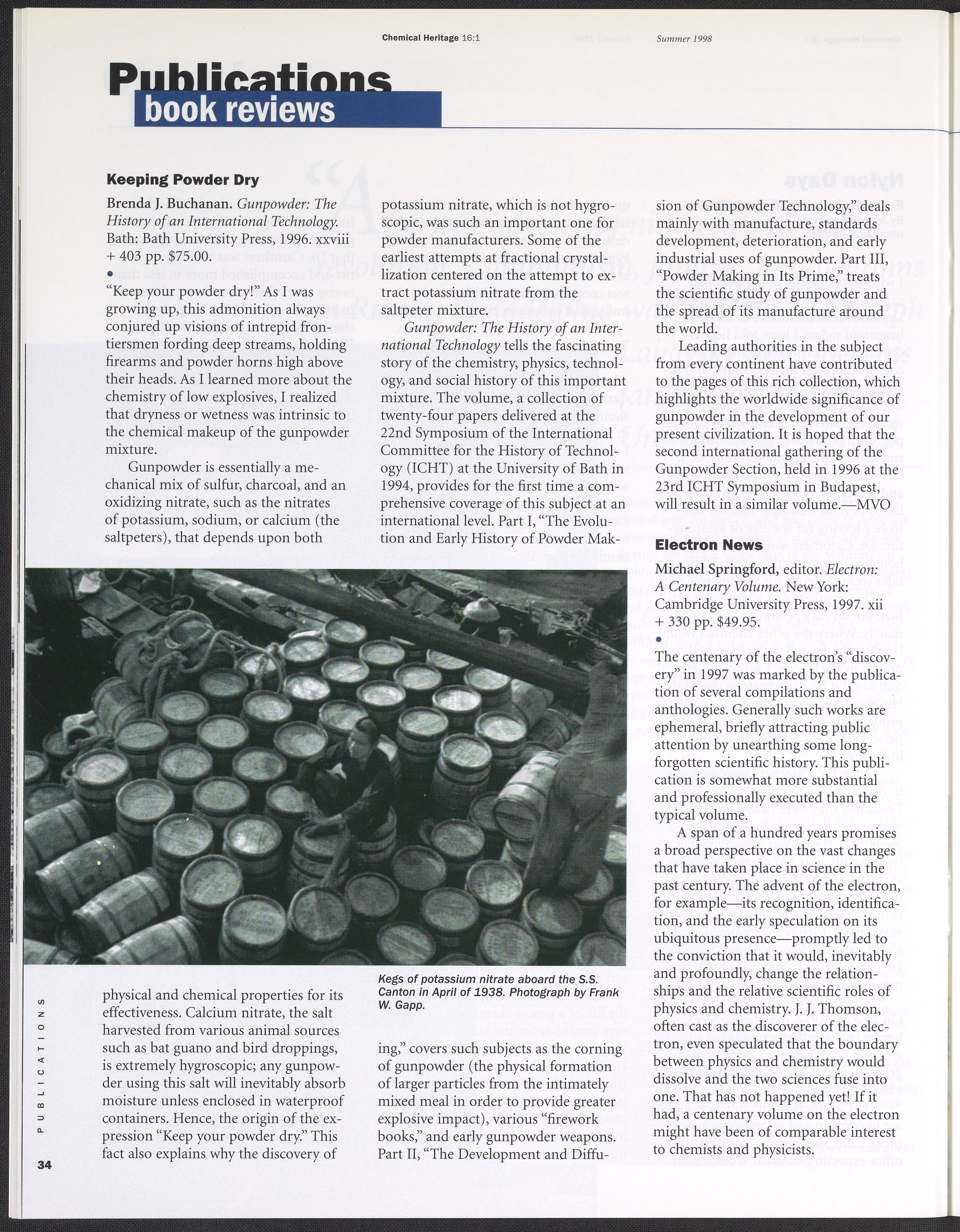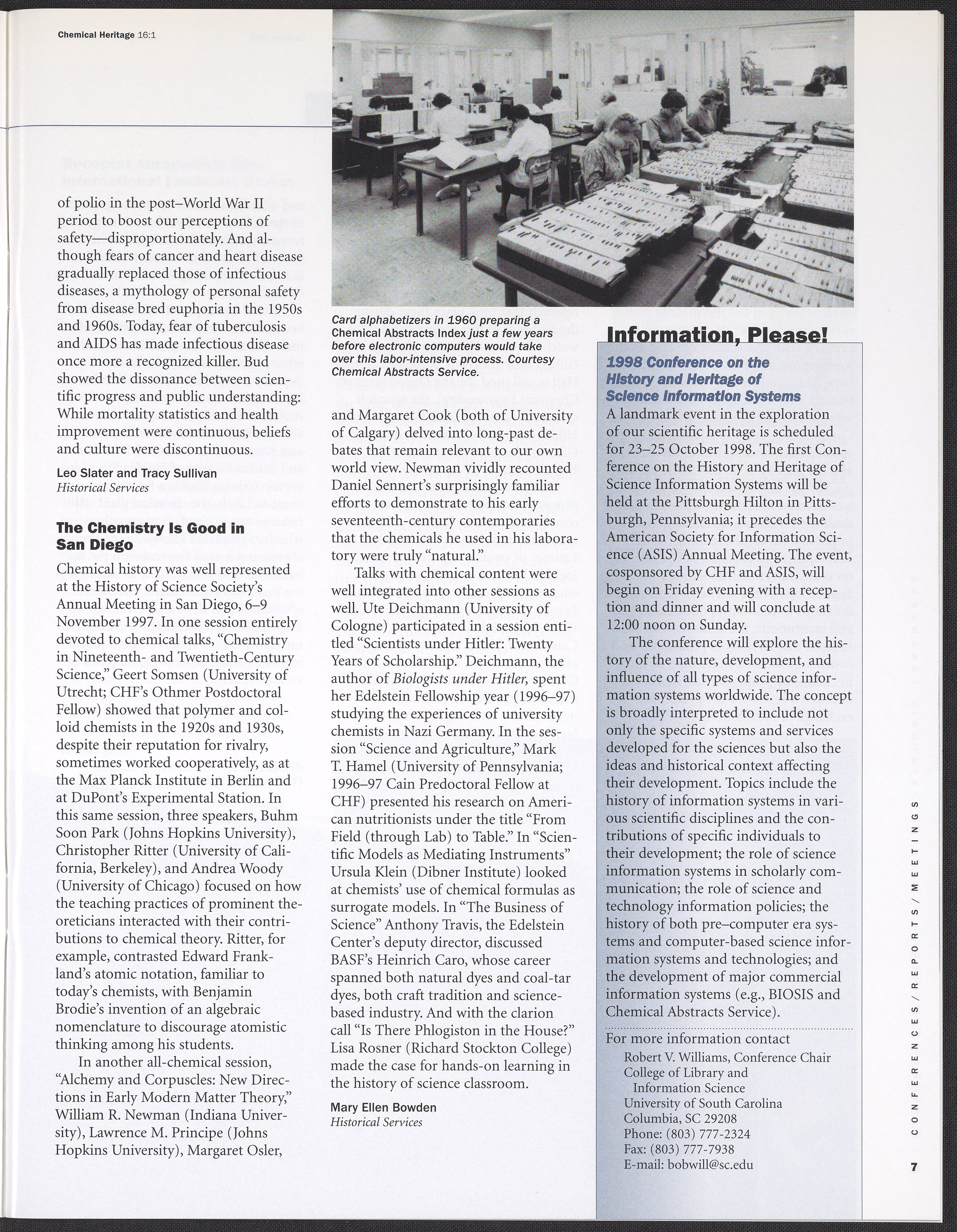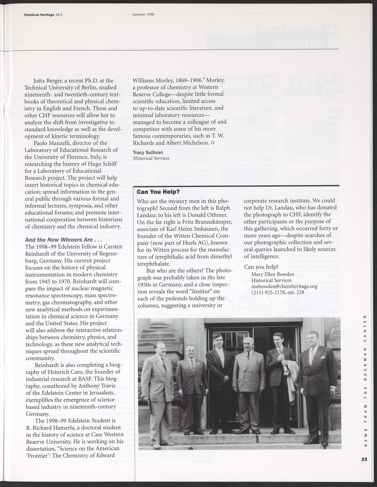 “Chemical Heritage, Volume 16 Number 1.” Philadelphia, Pennsylvania: Chemical Heritage Foundation, 1998. 099C001. Science History Institute. Philadelphia. https://digital.sciencehistory.org/works/ml0gd3o.