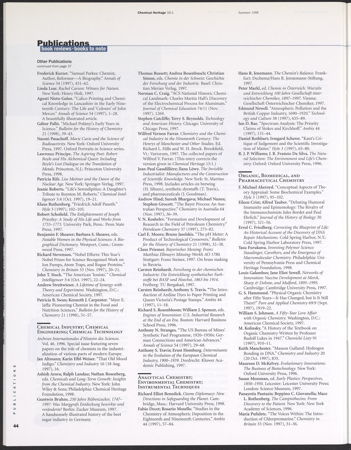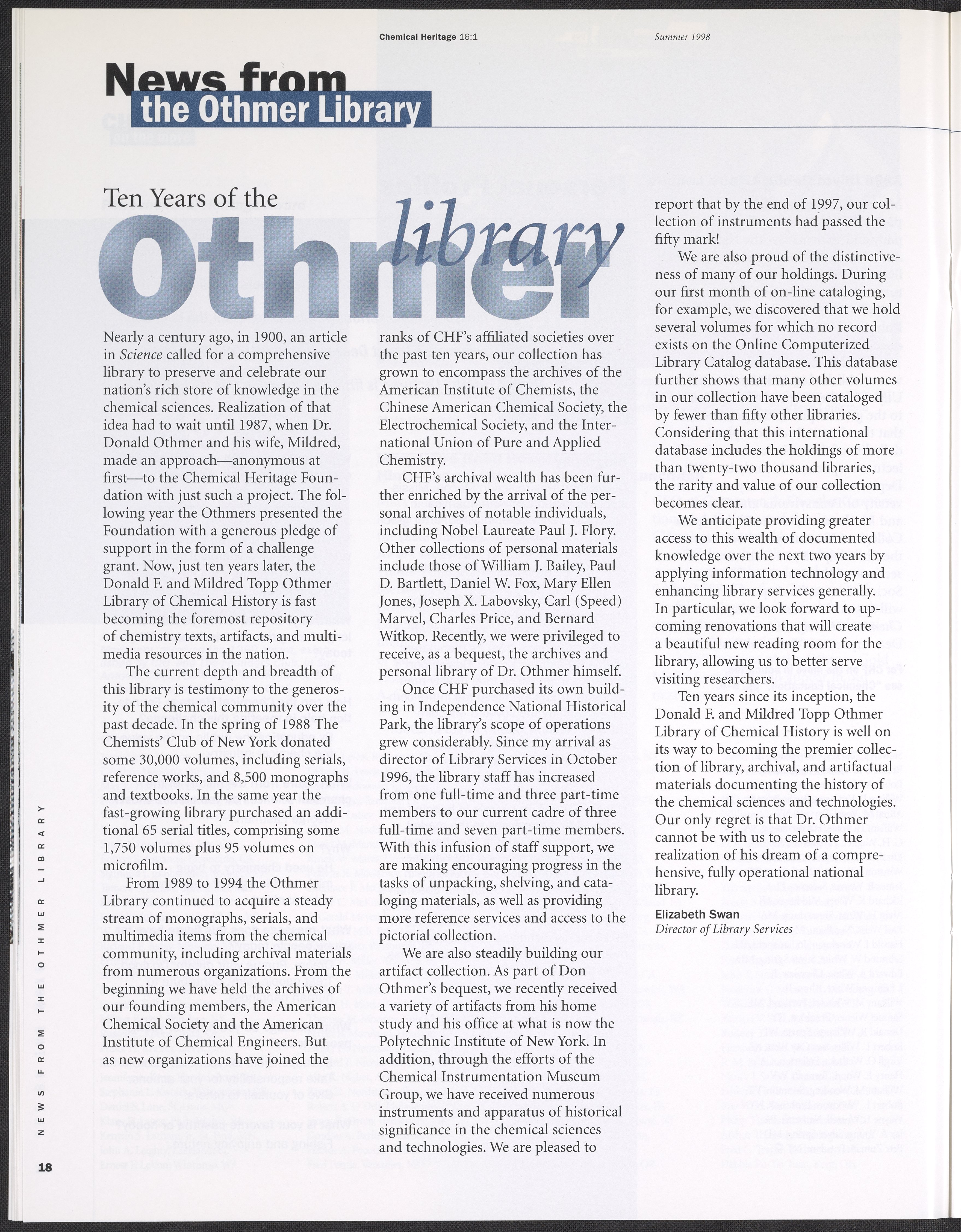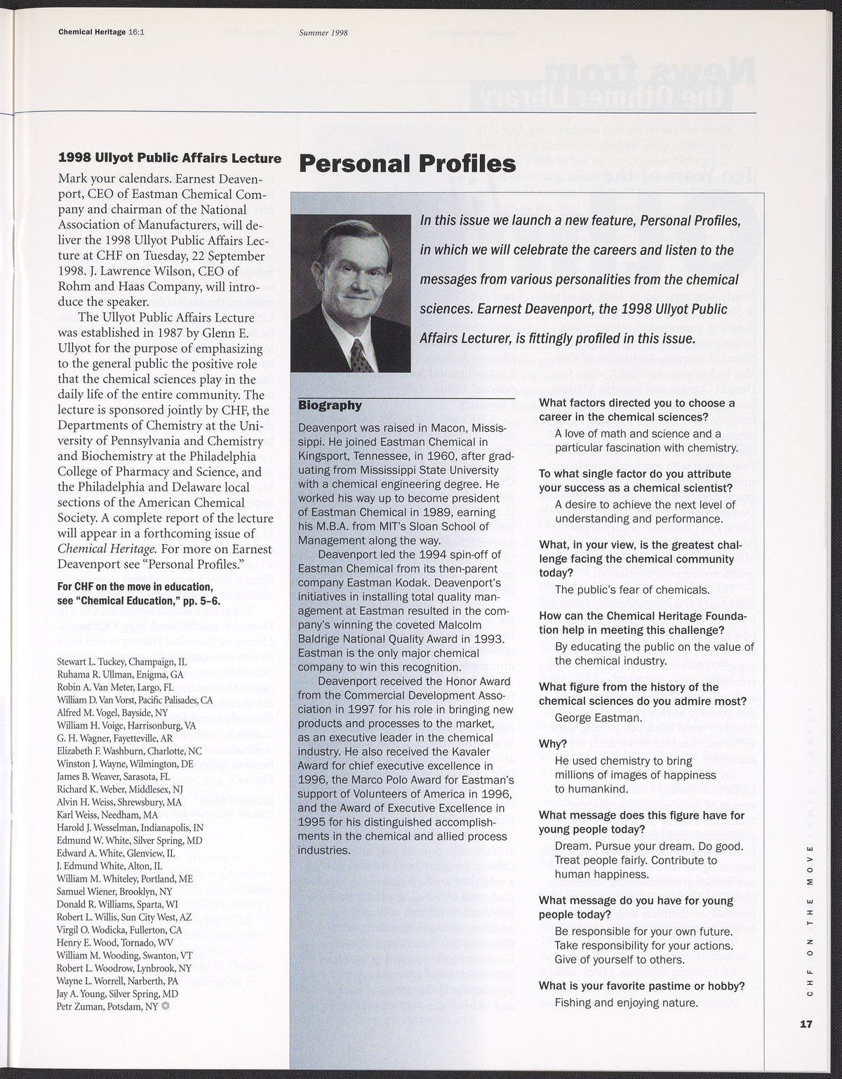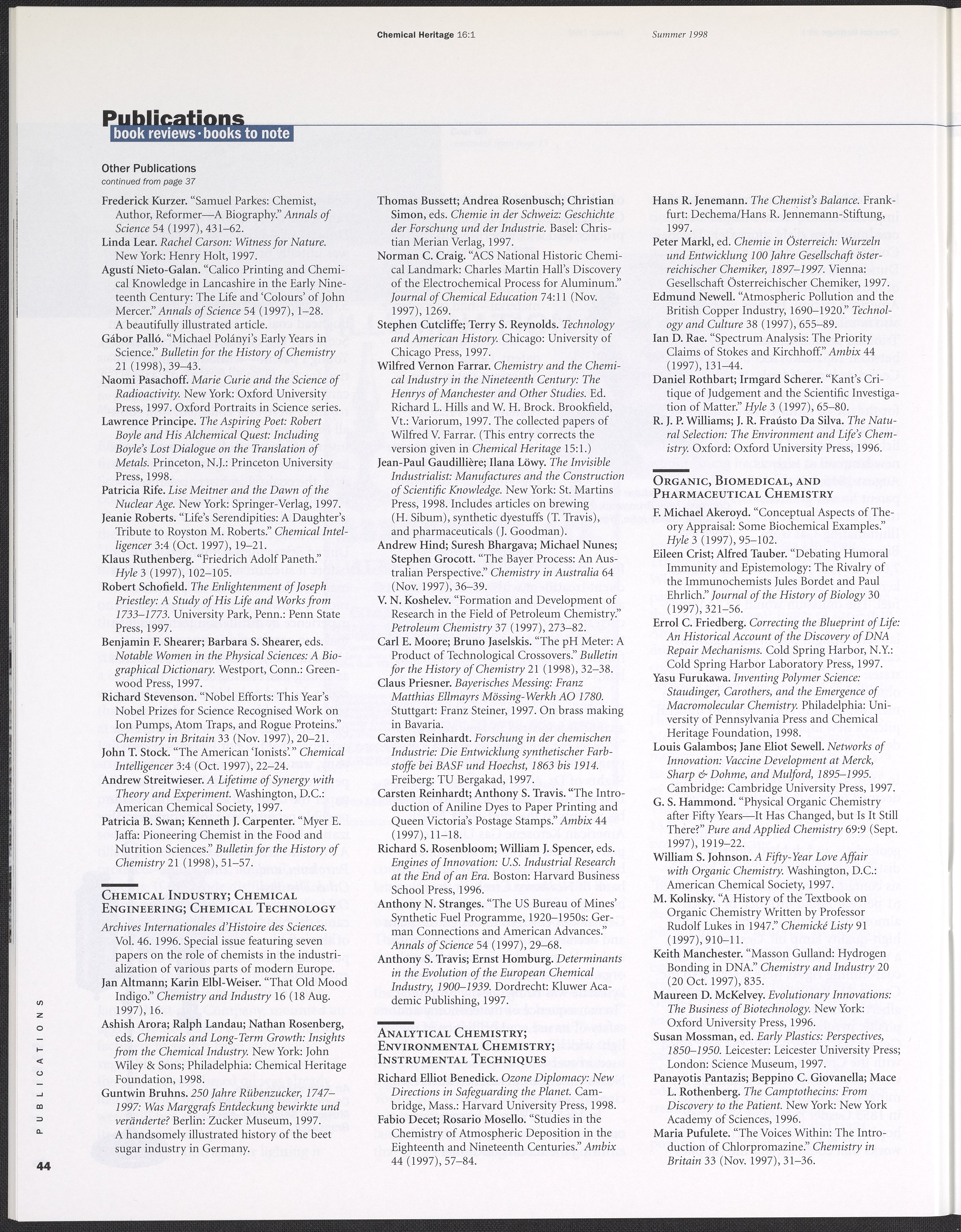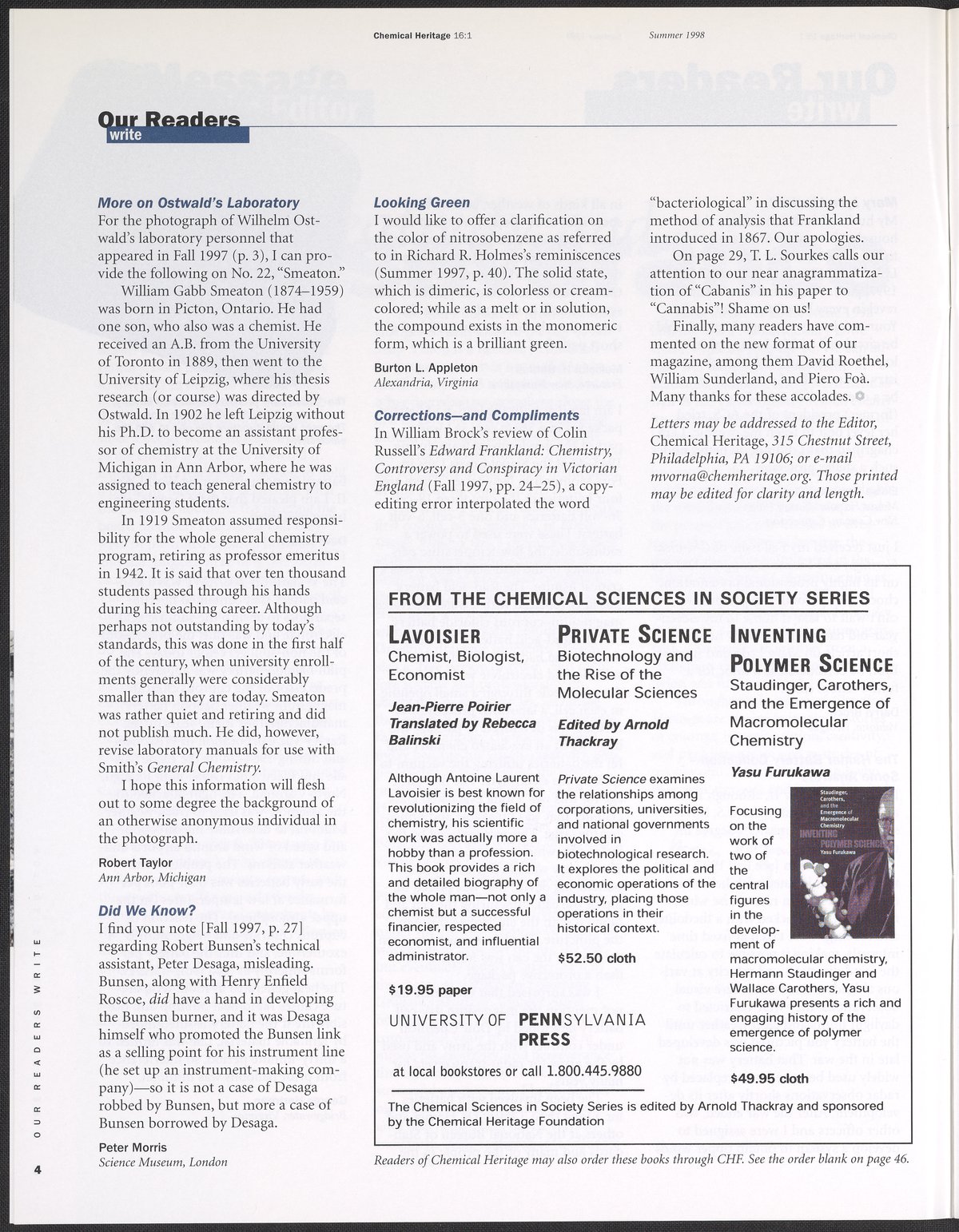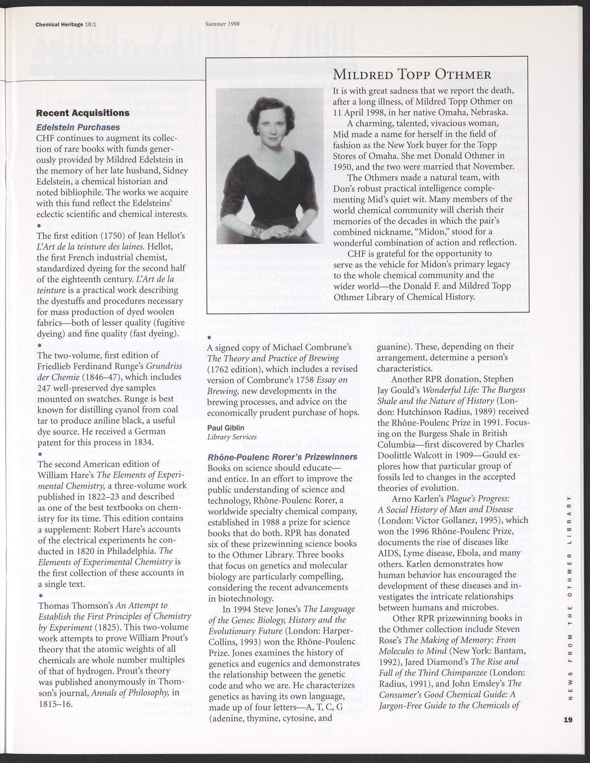 “Chemical Heritage, Volume 16 Number 1.” Philadelphia, Pennsylvania: Chemical Heritage Foundation, 1998. 099C001. Science History Institute. Philadelphia. https://digital.sciencehistory.org/works/ml0gd3o.
