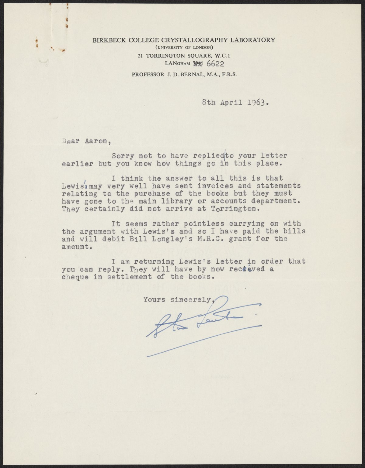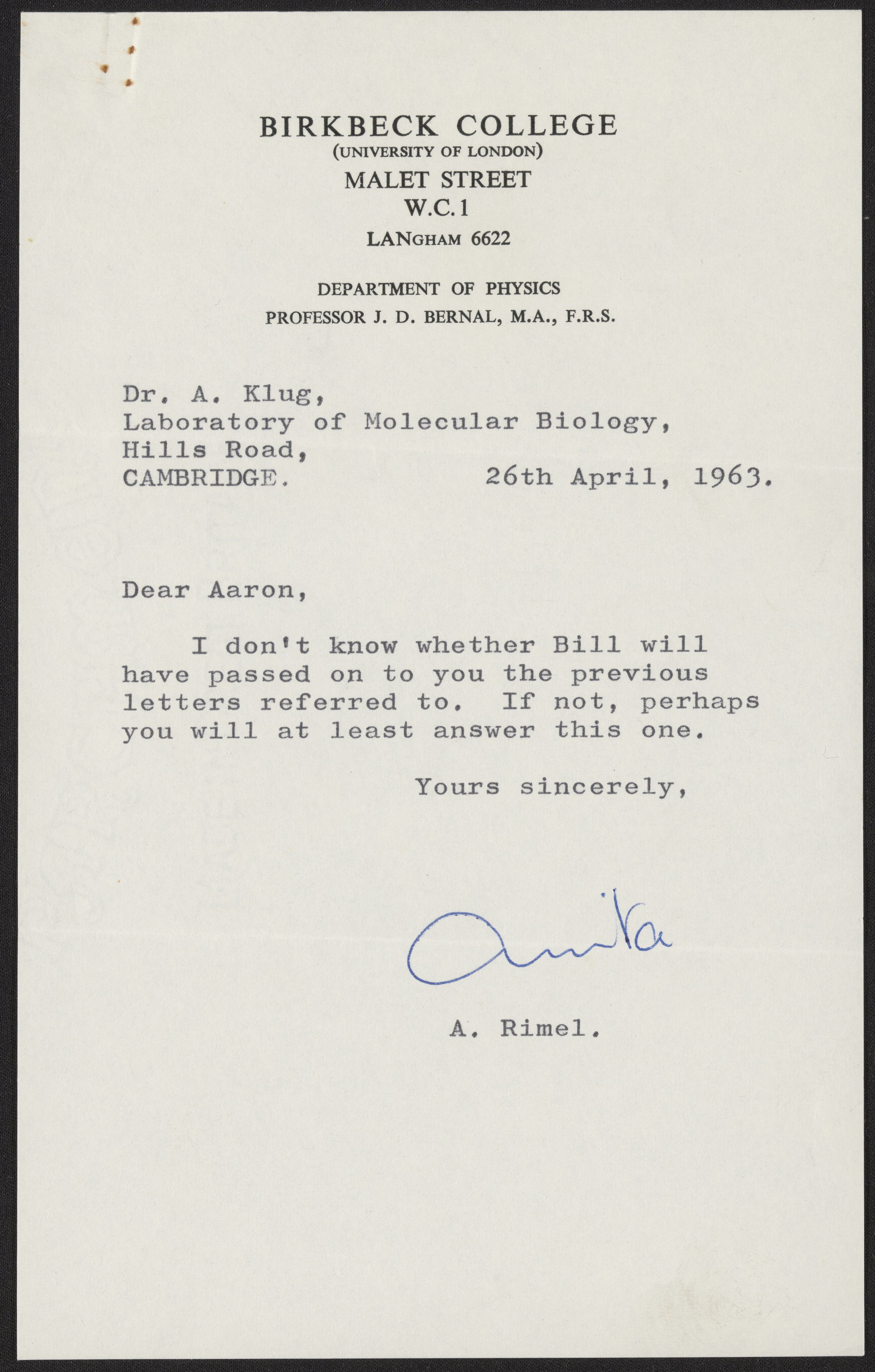 “Letter to Aaron Klug, April 8, 1963,” April 8, 1963. History of Molecular Biology Collection, Box 17, Folder 12. Science History Institute. Philadelphia. https://digital.sciencehistory.org/works/mlnuu5j.