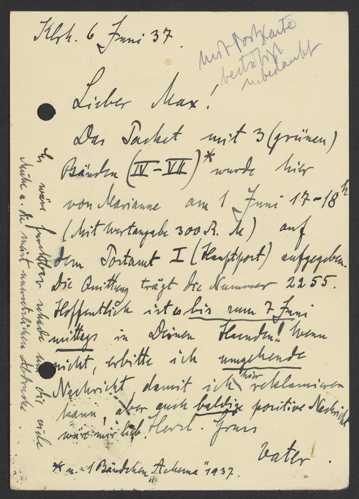 Das Packet mit 3 (grünen) Bänden (IV-VI)* wurde hier von Marianne am 1 Juni 17-18h (mit Wertangabe 300 RM) auf dem Postamt I (Hauptport) aufgegeben. Die Quittung trägt die Nummer 2255. Hoffentlich ist es bis zum 7. Juni mittags in Deinen Händen! Wenn nicht, erbitte ich umgehende Nachricht, damit ich hier reklamieren kann, aber auch baldige positive Nachricht wäre mir lieb.