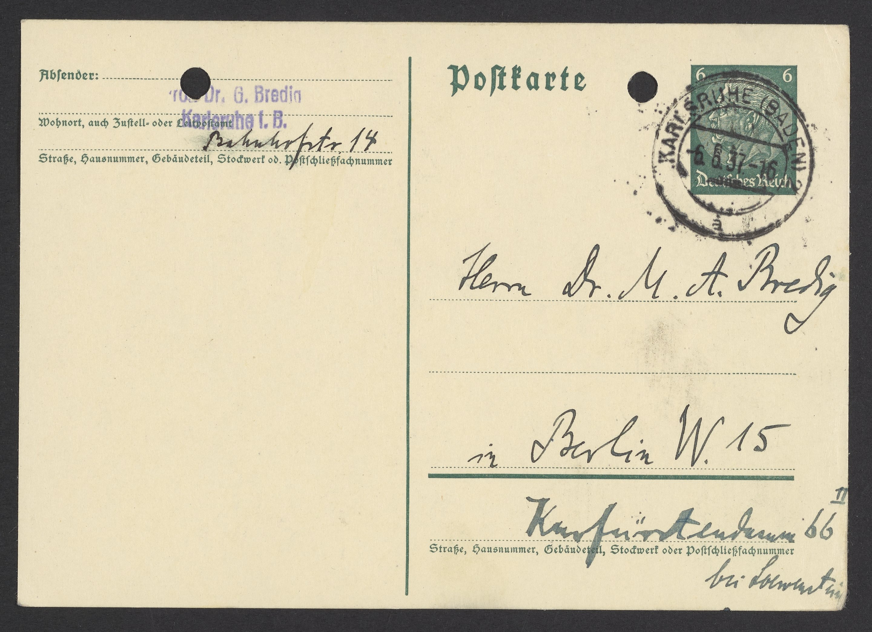 Bredig, Georg. “Postcard from Georg Bredig to Max Bredig, June 6, 1937,” June 6, 1937. Papers of Georg and Max Bredig, Box 7, Folder 13. Science History Institute. Philadelphia. https://digital.sciencehistory.org/works/mme31rp.