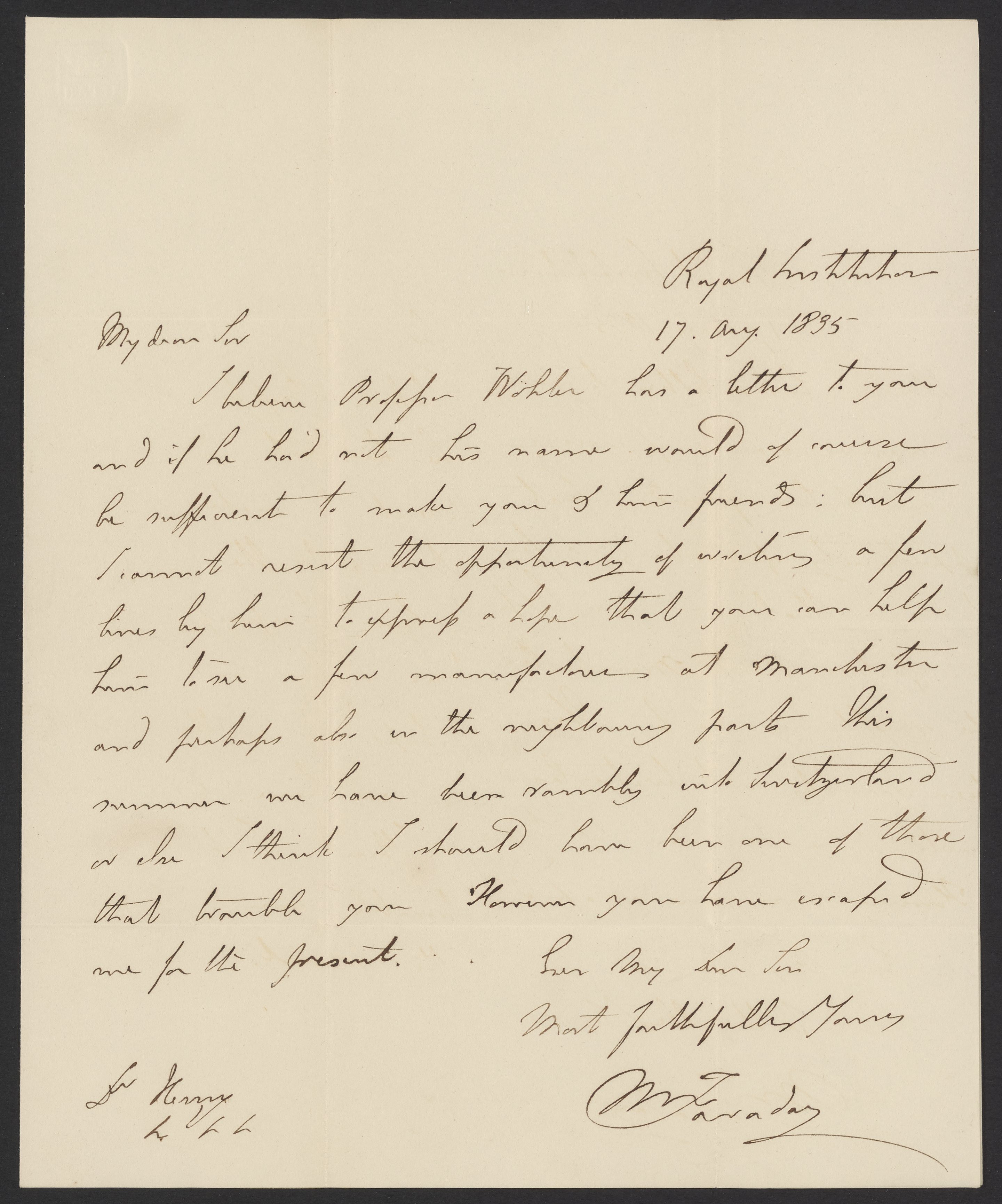 Letter from Michael Faraday to James Curtis Booth, August 17, 1835