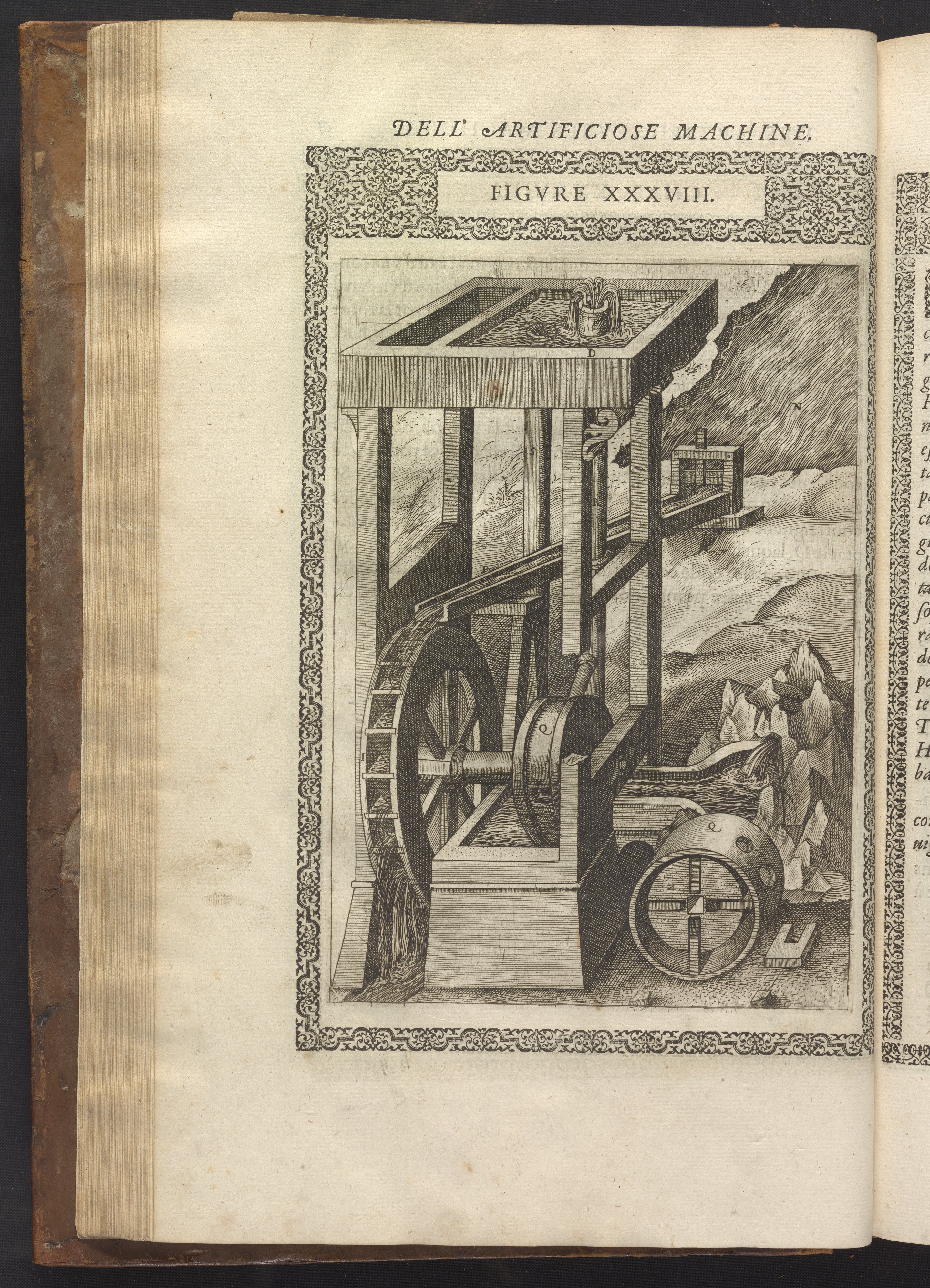 Ramelli, Agostino. “Plate 38: Device for Raising Water from a Spring by Channel Current.” In Le Diverse Et Artificiose Machine Del Capitano Agostino Ramelli. Paris, France, 1588. https://digital.sciencehistory.org/works/mp48sc916.