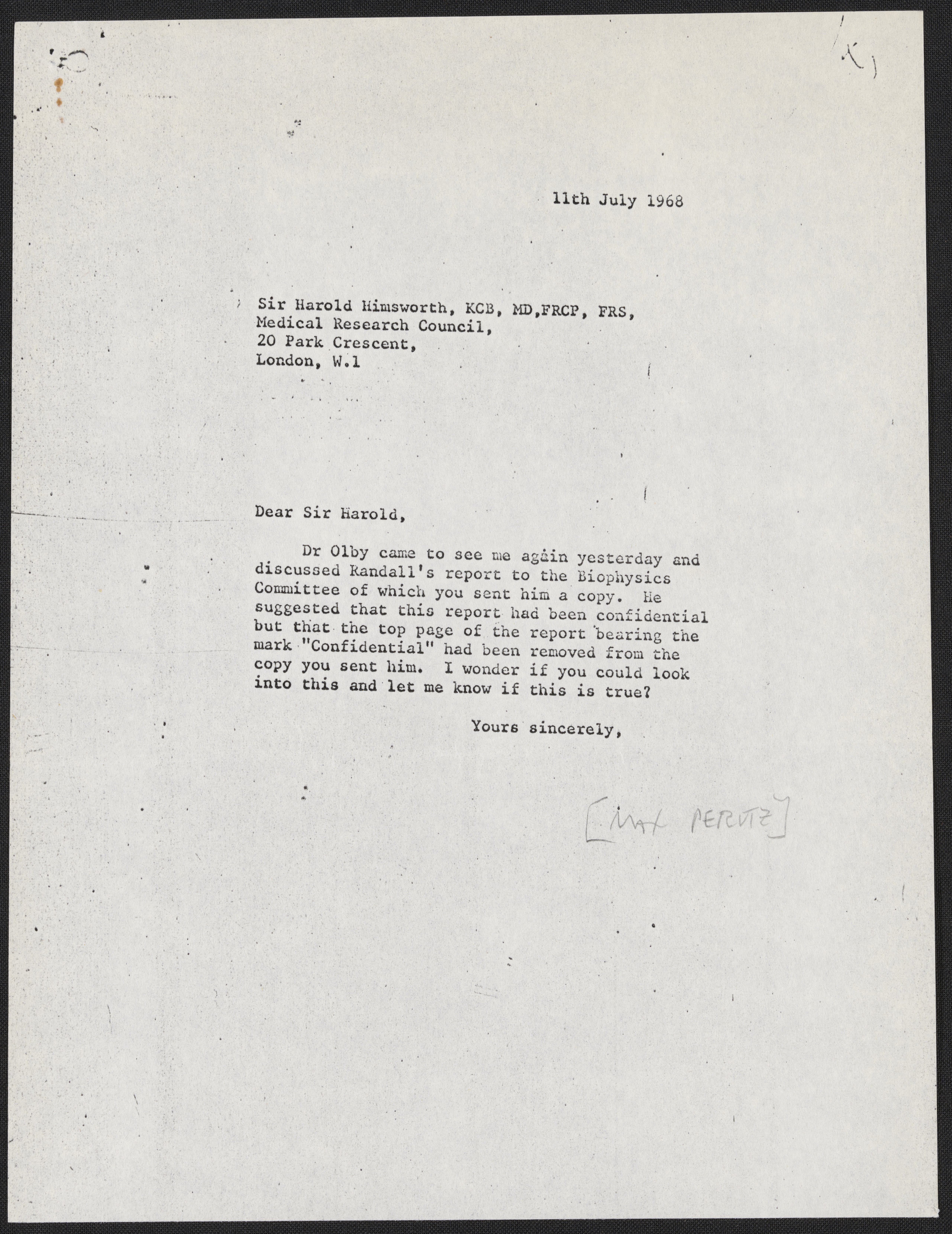 Letter from Max Perutz to Sir Harold Himsworth, July 11, 1968