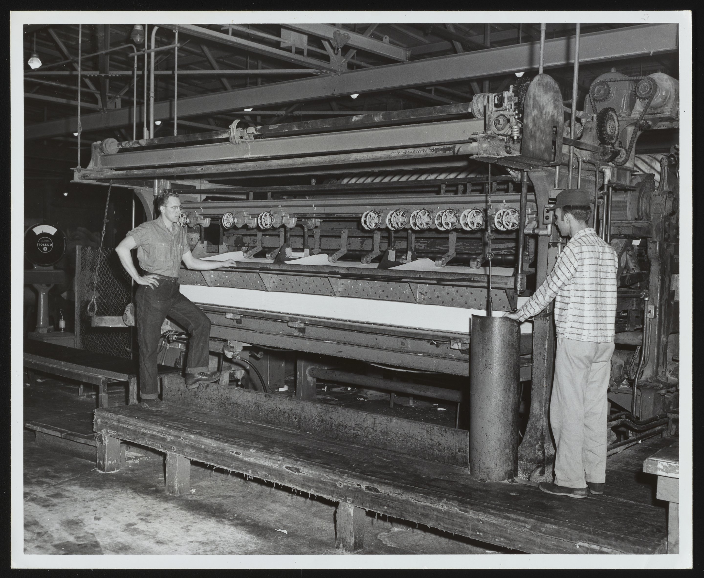 General view of two unidentified employees using a machine to cut stock of so-called "chemical cotton" into sheets at the Hercules Powder Company plant in Hopewell, Virginia. Chemical cotton, a type of purified cellulose obtained from raw cotton linters, is commonly used for the manufacture of cellulose ethers, i.e. water-soluble polymers that have a variety of uses as thickeners, binders, and water-retention agents in products ranging from ceramics and paints to food, cosmetics, and pharmaceuticals.