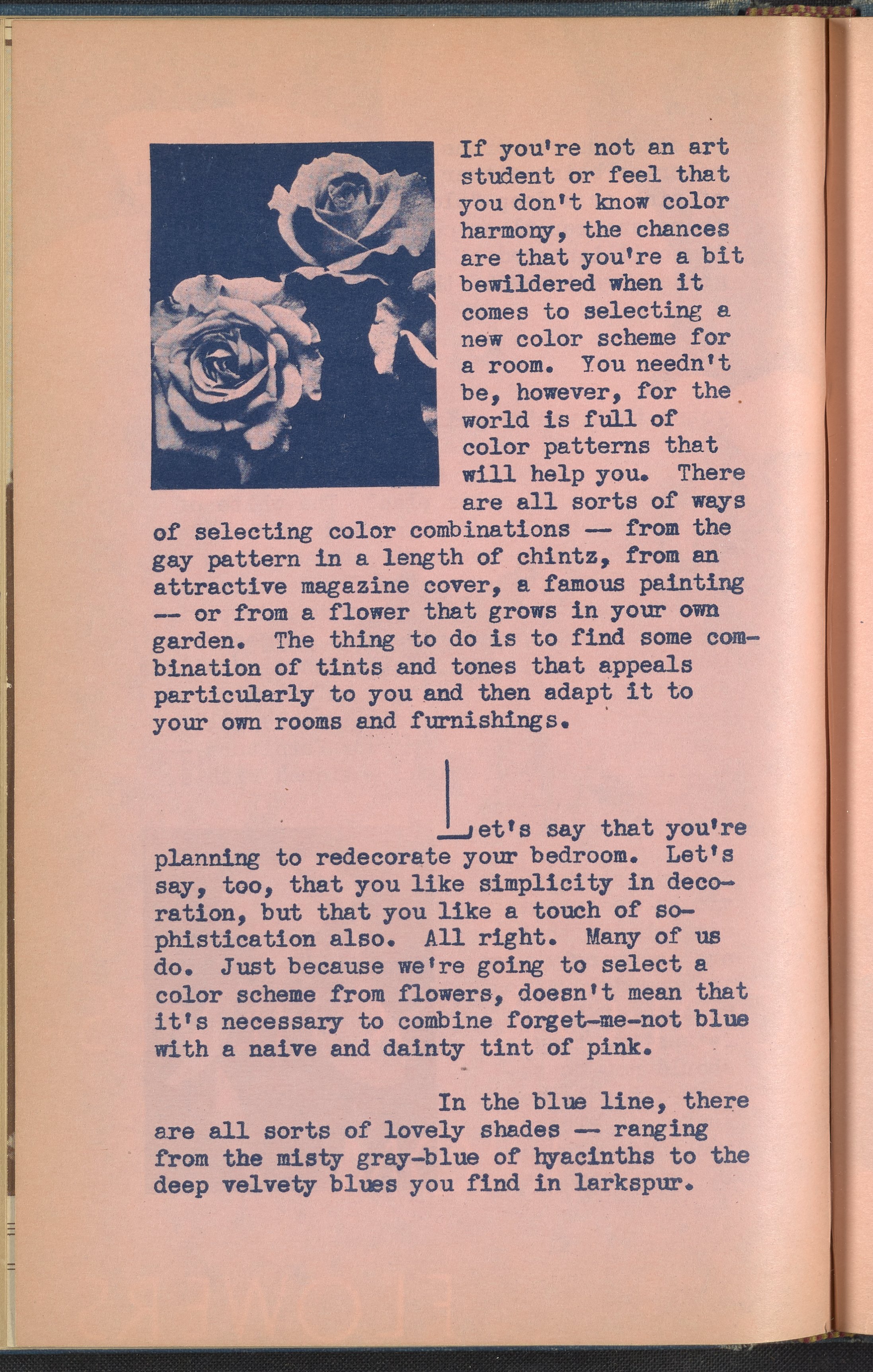 National Paint, Varnish. “Color Schemes From Flowers.” Pamphlets Corresponding to Radio Shows Produced by the National Paint, Varnish and Lacquer Association. Washington (D.C.), 1940–1949. TP935 .K46. Science History Institute. Philadelphia. https://digital.sciencehistory.org/works/mssz5wz.