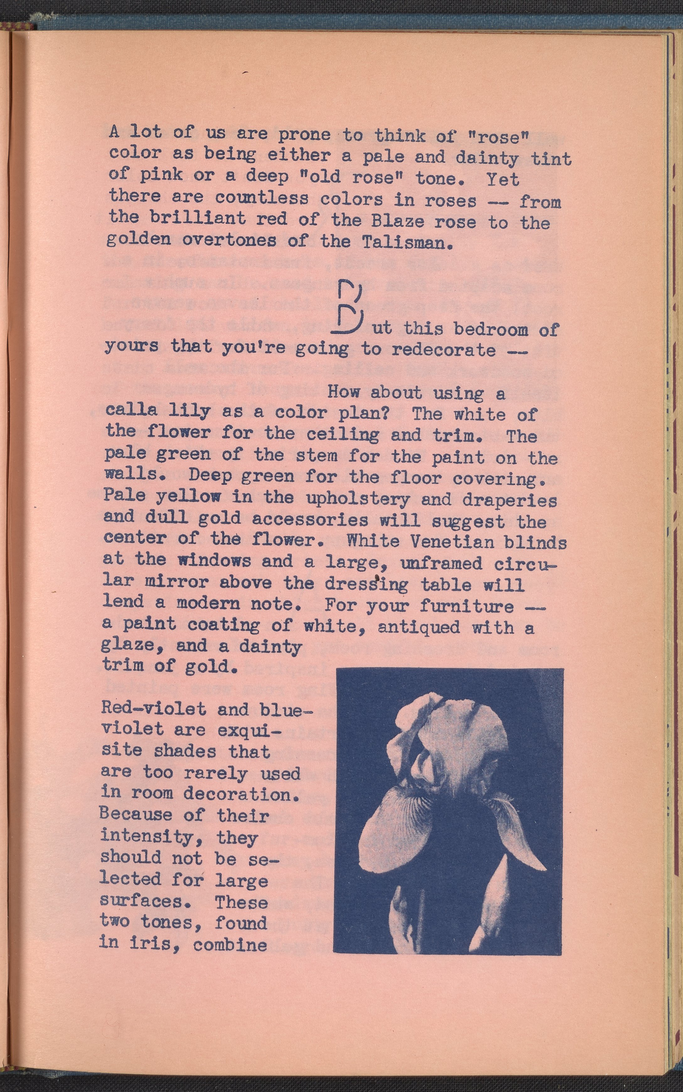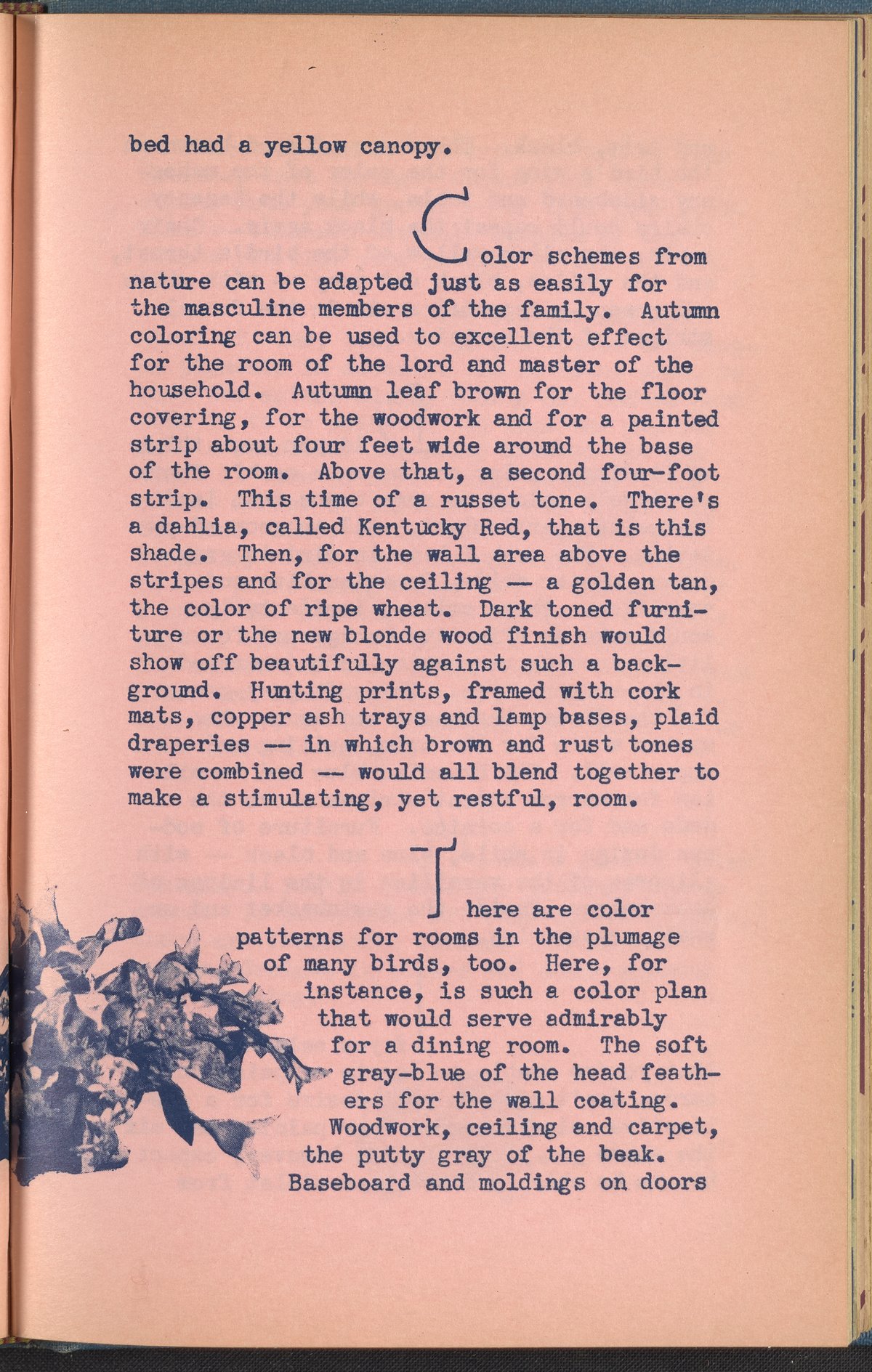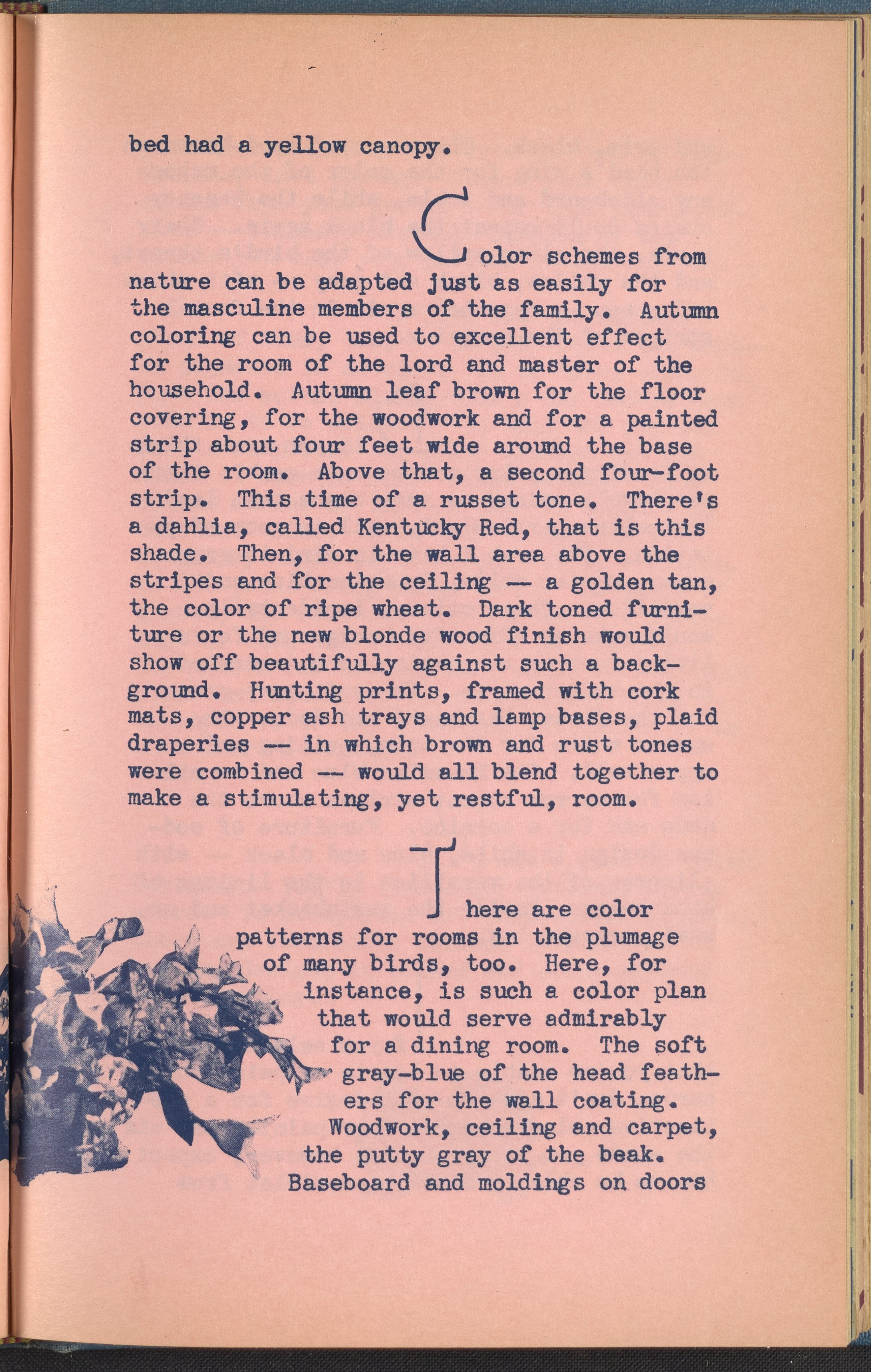 Booklet corresponding to a radio broadcast program created by the National Paint, Varnish, and Lacquer Association. The booklet describes how to take inspiration from nature to determine color scheme and decorations when designing a room. Includes small stylized illustrations, monotone photographs, and decorated covers.