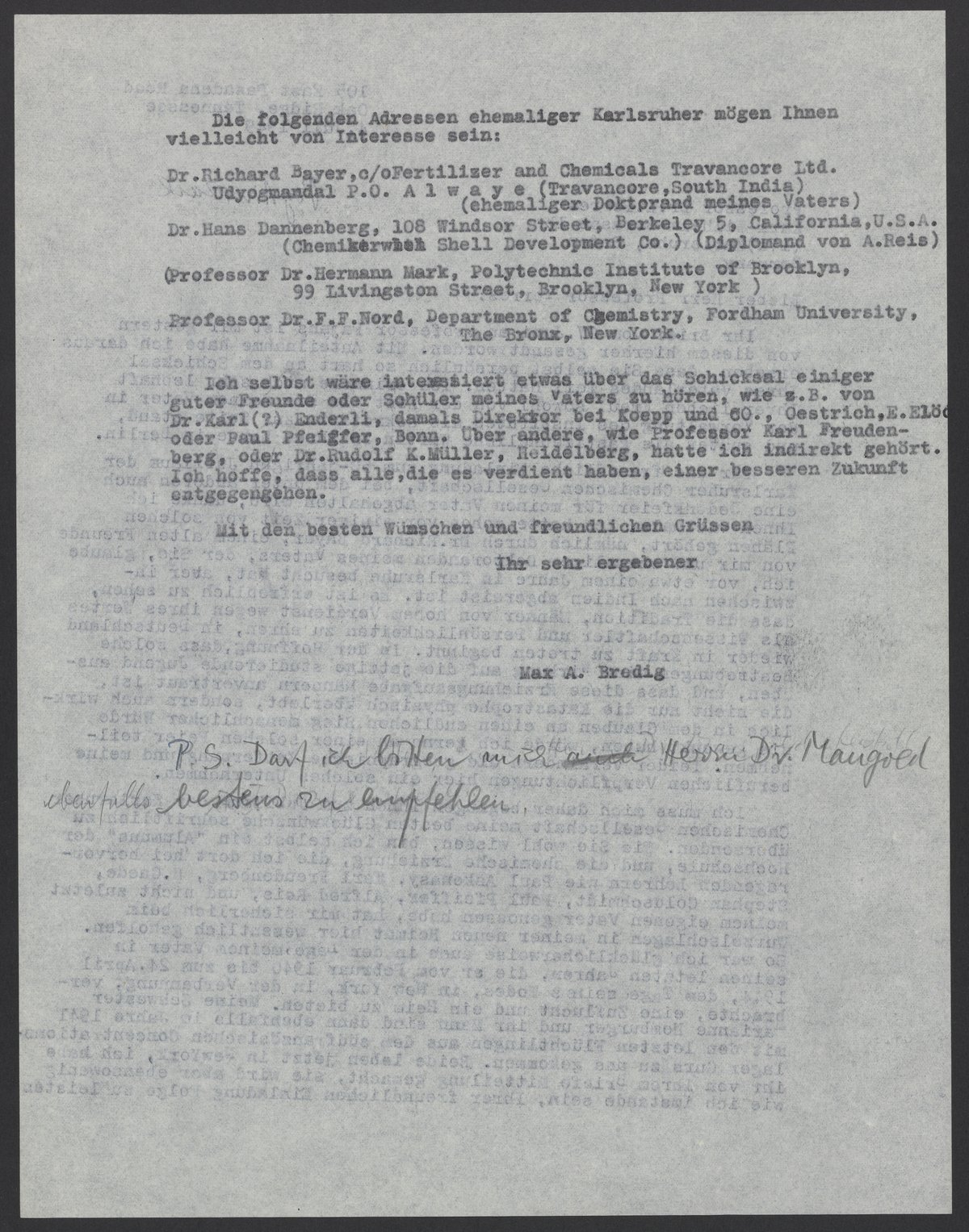 Ich selbst wäre interessiert etwas über das Schicksal einiger guter Freunde oder Schüler meines Vaters zu hören, wie z.B. von Dr. Karl (?) Enderli, damals Direktor bei Koepp und co., Oesterich E. Elö, oder Paul Pfeiffer, Bonn. Über andere, wie Professor Karl Freundenberg, oder Dr. Rudolf K. Müller, Heidelberg, hatte ich indirekt gehört. Ich hoffe, dass alle, die es verdient haben, einer besseren Zukunft entgegennehmen.