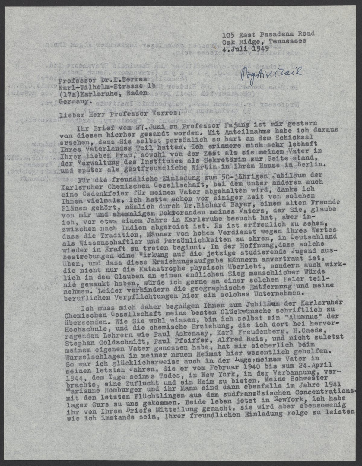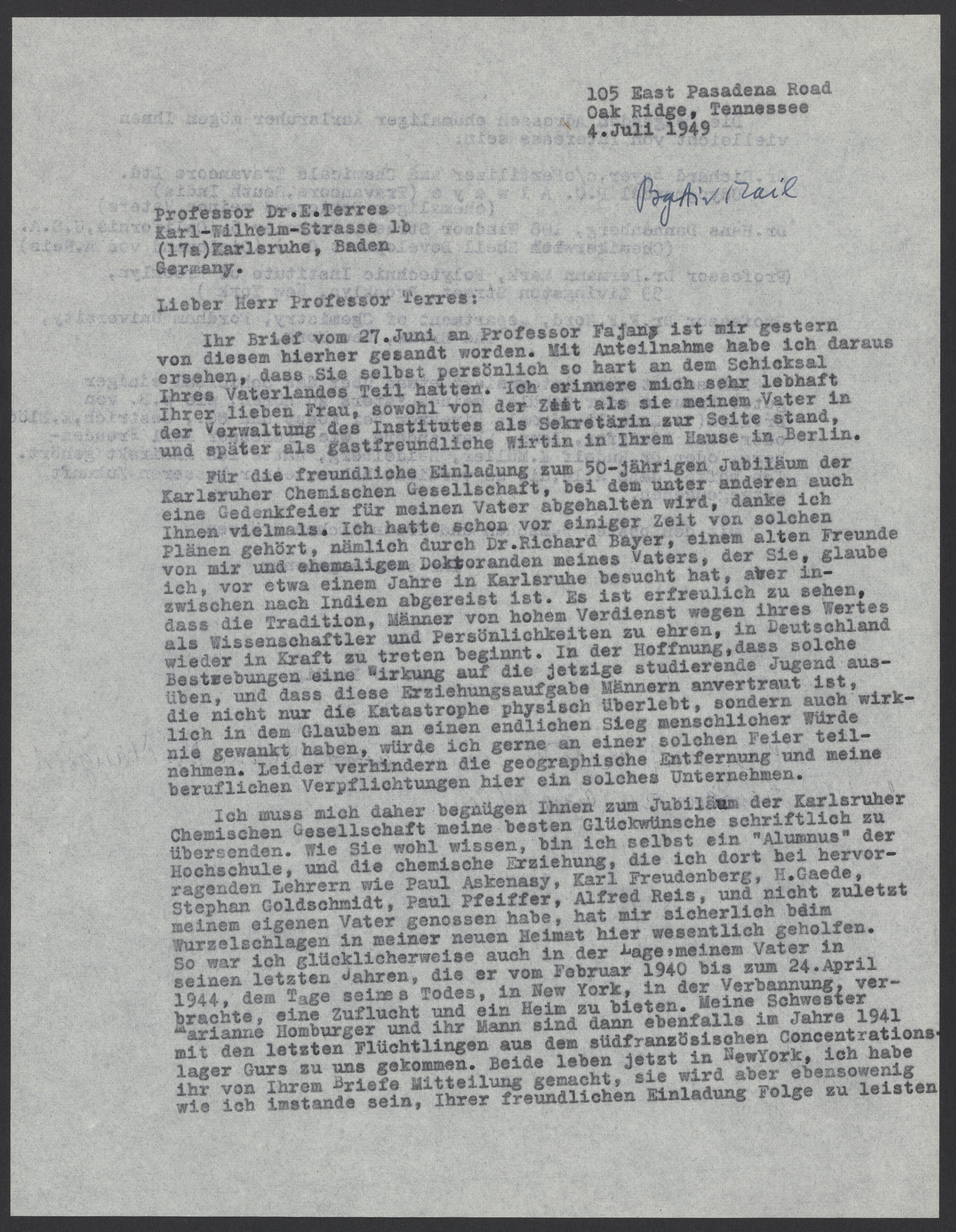 Ich muss mich daher begnügen Ihnen zum Jubiläum der Karlsruher Chemischen Gesellschaft meine beste Glückwünsche schriftlich zu übersenden. Wie sie wohl wissen, bin ich selbst ein “Alumnus” der Hochschule, und die chemische Erziehung, die ich dort bei hervorragenden Lehrern wie Paul Askenasy, Karl Freudenberg, H. Gaede, Stephan Goldschmidt, Paul Pfeiffer, Alfred Reis, und nicht zuletzt meinem eigenen Vater genossen habe, hat mir sicherlich beim Wurzelschlagen in meiner neuen Heimat hier wesentlich geholfen. So war ich glücklicherweise auch in der Lage, meinem Vater in seinen letzten Jahren, die er vom Februar 1940 bis zum 24. April 1944, dem Tage seines Todes, in New York, in der Verbannung, verbrachte, eine Zuflucht und ein Heim zu bieten. Meine Schwester Marianne Homburger und ihr Mann sind dann ebenfalls im Jahre 1941 mit den letzten Flüchtlingen aus dem südfranzösischen Concentrationslager Gurs zu uns gekommen. Beide leben jetzt in NewYork, ich habe ihr von Ihrem Briefe Mitteilung gemacht, sie wird ebensowenig wie ich imstande sein, Ihrer freundlichen Einladung Folge zu leisten.