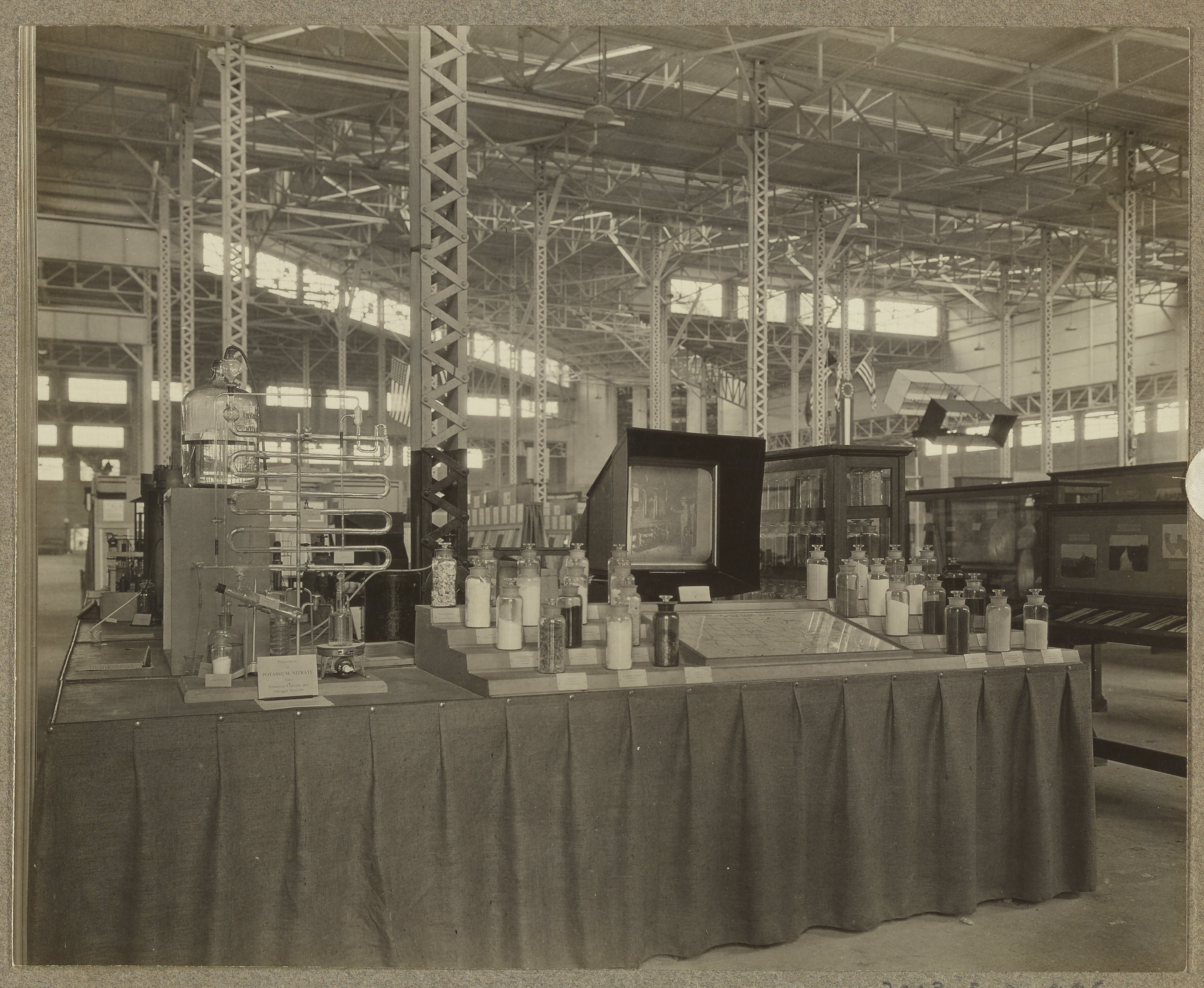 Small JPG1200 x 985px — 232 KBLarge JPG2880 x 2364px — 1.1 MBFull-sized JPG3210 x 2635px — 1.3 MBOriginal fileTIFF — 3210 x 2635px — 24.3 MBTwo views of an exhibition display concerning the work of the U.S. Department of Agriculture's Fixed Nitrogen Research Laboratory located in Washington, D.C. The display includes assorted sample jars and a photograph viewer, as well as an apparatus used to prepare potassium nitrate from potassium chloride and nitrogen peroxide. These photographs were taken in the Agricultural Hall at the Sesqui-centennial International Exposition held in Philadelphia in 1926.