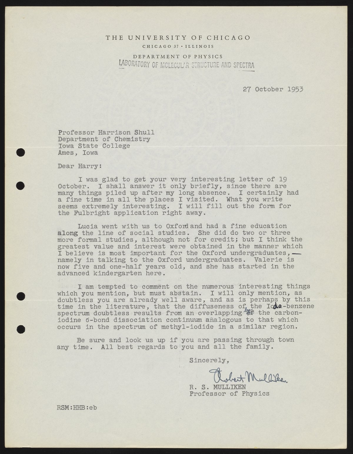 Mulliken, Robert Sanderson. “Letter from Robert S. Mulliken to Harrison Shull, 1953,” October 27, 1953. Robert S. Mulliken & Harrison Shull Correspondence, Box 1. Science History Institute. Philadelphia. https://digital.sciencehistory.org/works/mw22v549p.