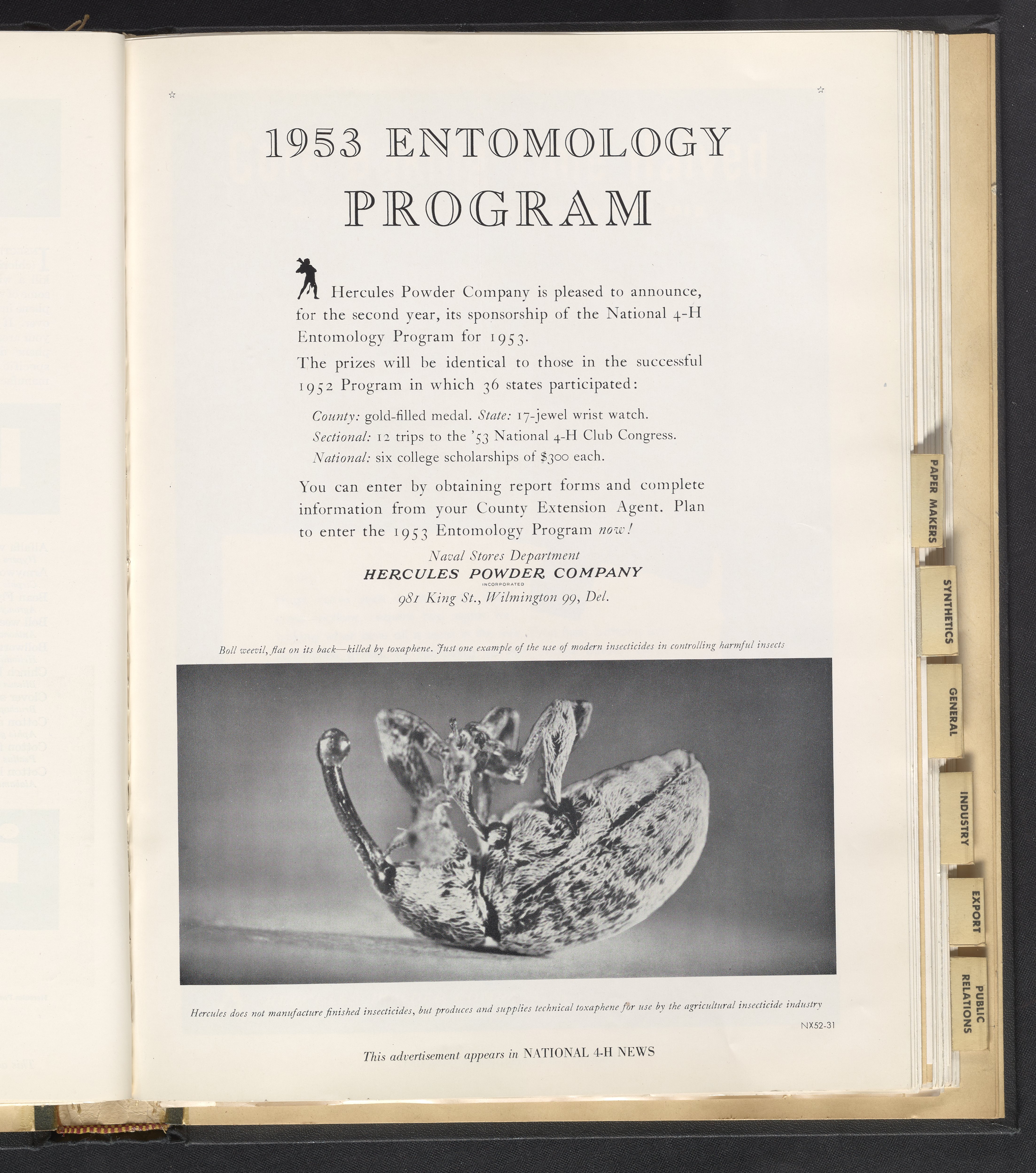 Hercules Incorporated. “1953 Entomology Program.” 1952 Hercules Advertisements, 1952. Records of Hercules Incorporated, Volume 1952. Science History Institute. Philadelphia. https://digital.sciencehistory.org/works/mw22v6063.