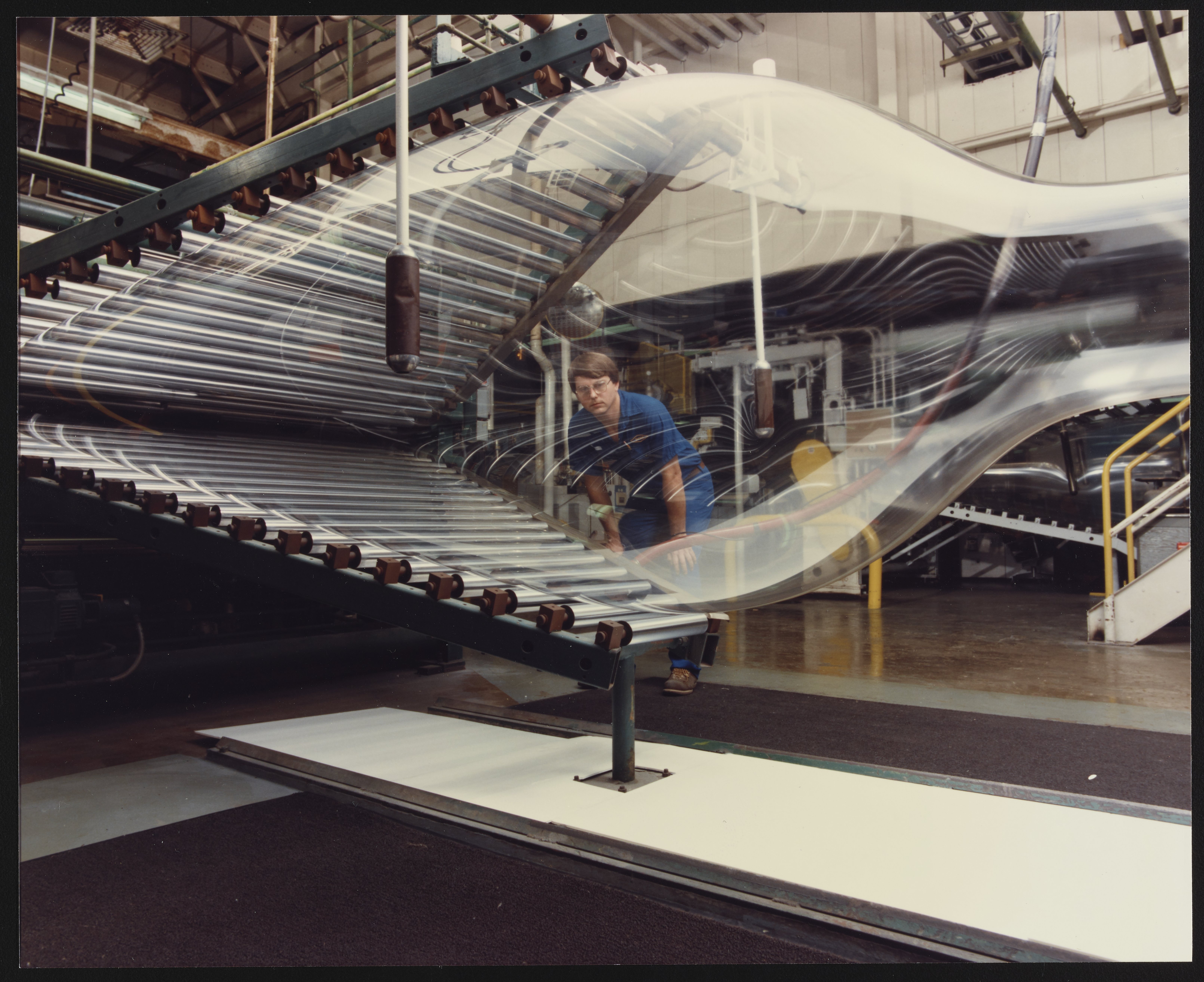 Small JPG1200 x 978px — 195 KBLarge JPG2880 x 2348px — 770 KBFull-sized JPG6441 x 5251px — 2.7 MBOriginal fileTIFF — 6441 x 5251px — 96.8 MBTwo views of an unidentified employee observing the extrusion of a saran bubble from a rolling machine at the Dow Chemical Company plant in Midland, Michigan. During production, saran film passed through a series of rollers, which deflated the bubbles and prepared the film for winding on rolls. Initially developed for the U.S. Army to wrap arms and equipment for transport during World War II, saran plastic was subsequently developed and marketed as Saran Wrap for household use.