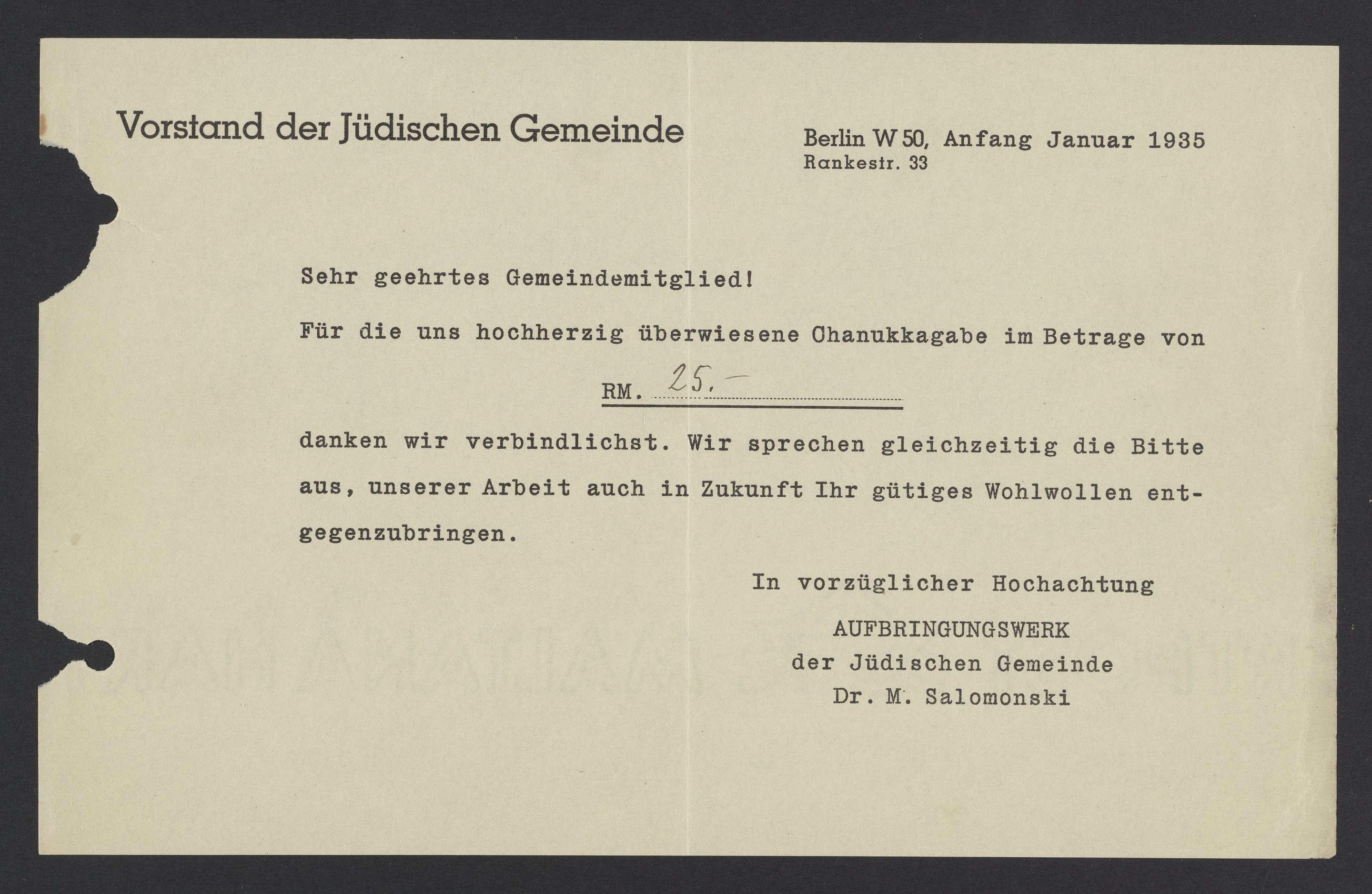 Small JPG1200 x 782px — 115 KBLarge JPG2880 x 1877px — 753 KBFull-sized JPG5908 x 3851px — 3.3 MBOriginal fileTIFF — 5908 x 3851px — 65.1 MBNote thanking Max Bredig (1902-1977) for his donation to the Vorstand der Judischen Gemeinde zu Berlin (Aufbringungswerk), or Board of Directors of the Jewish Community in Berlin (funding agency), and a provisional receipt for the payment.