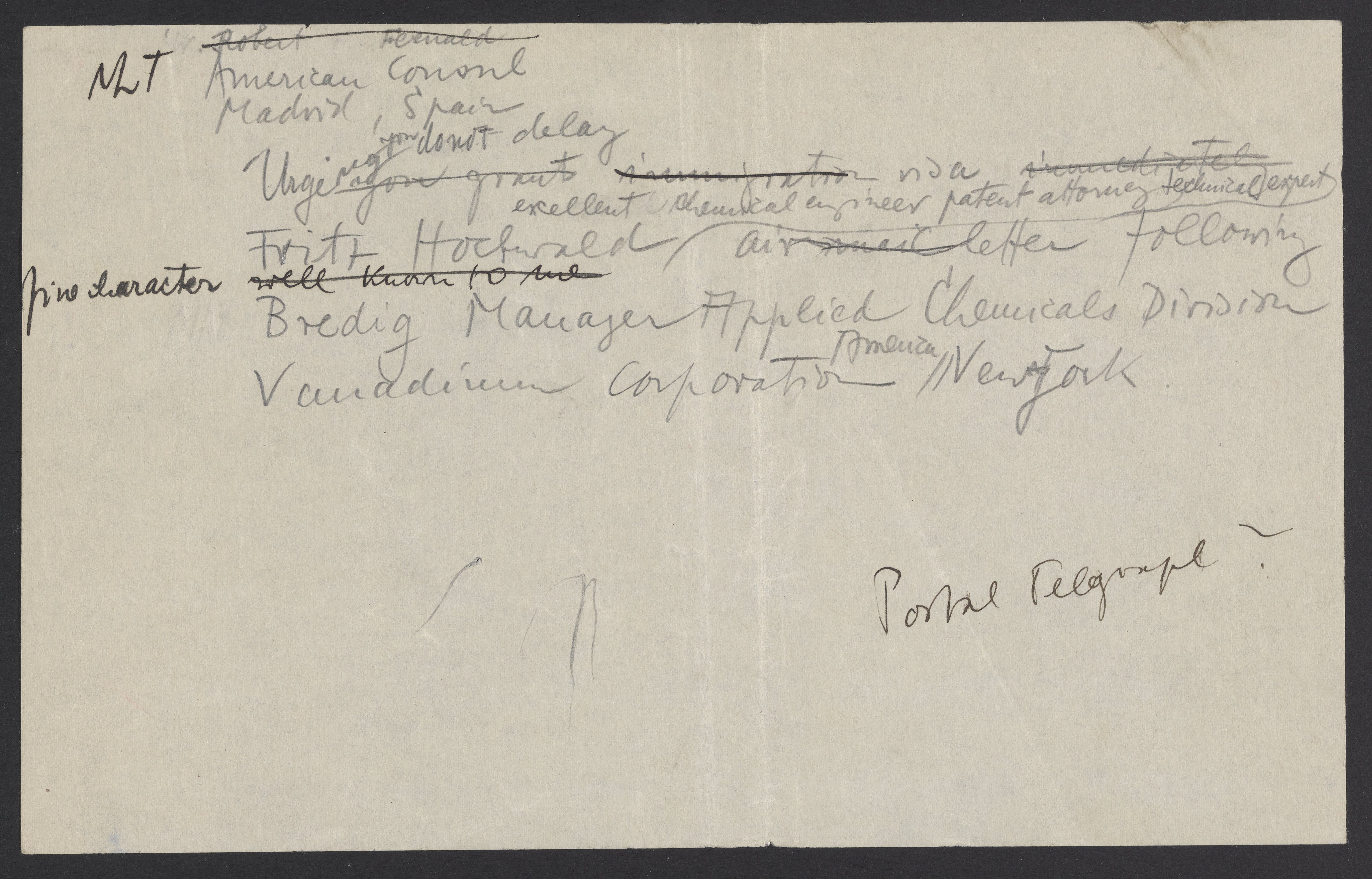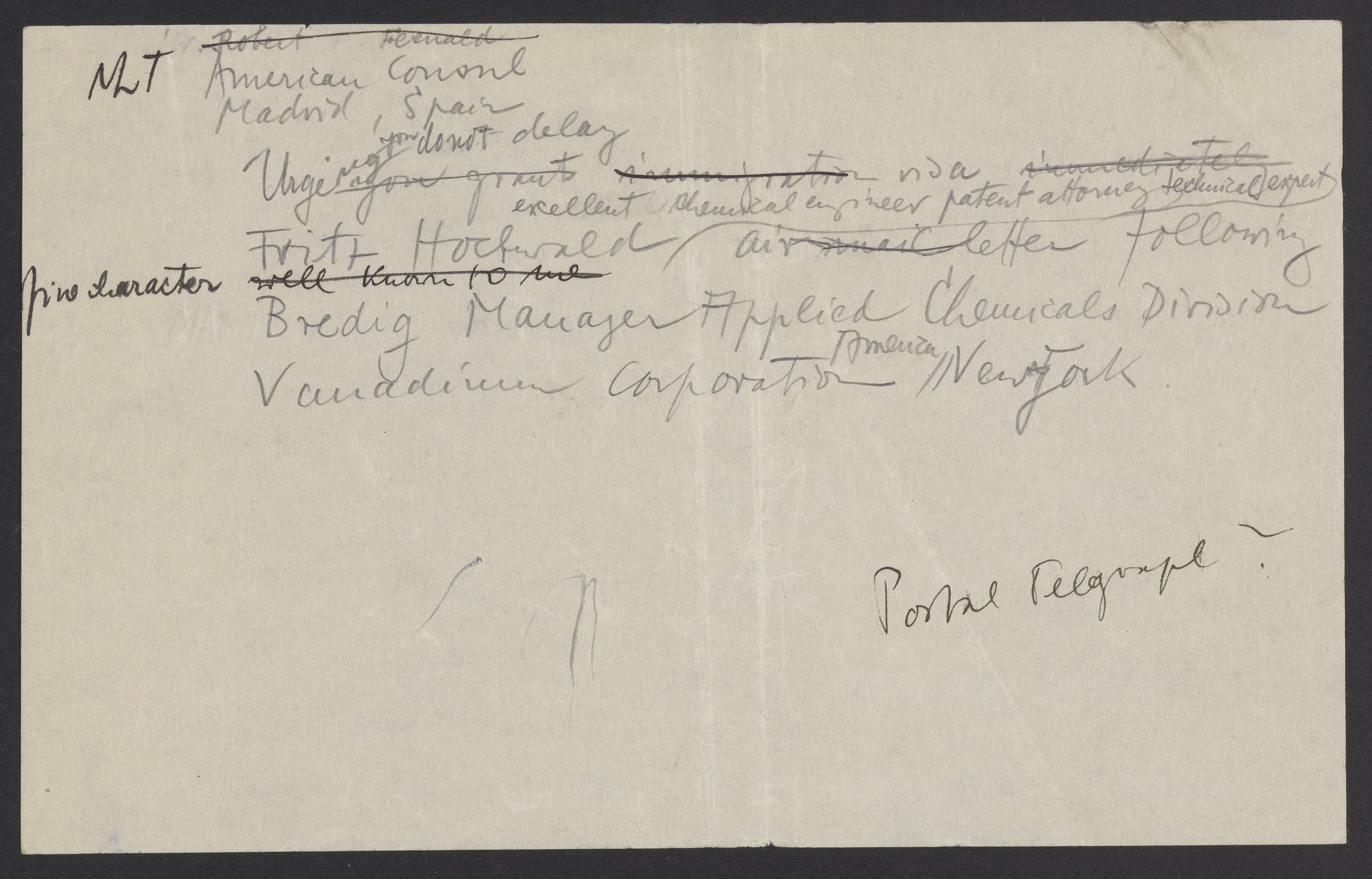 Draft text intended for a telegram from Max Bredig (1902-1977) to the American Consul of Madrid, Spain concerning the visa of Fritz Hochwald (1897-1968).