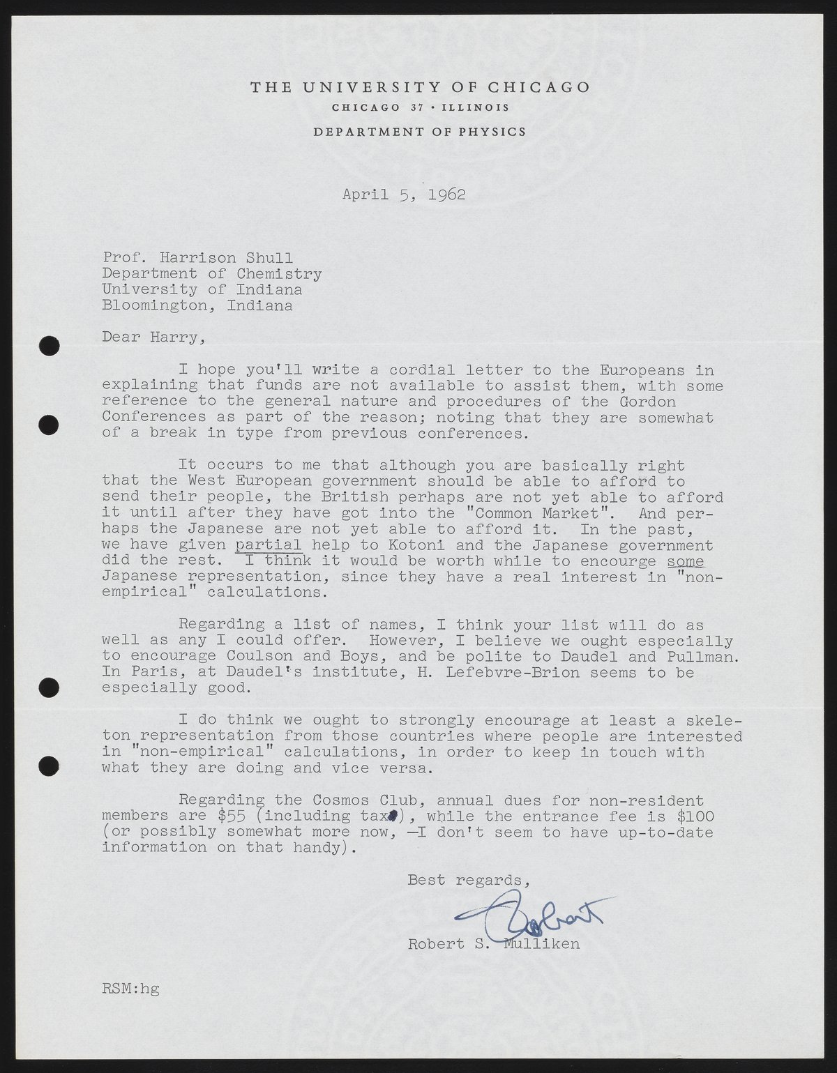 Mulliken, Robert Sanderson. “Letter from Robert S. Mulliken to Harrison Shull, 1962,” April 5, 1962. Robert S. Mulliken & Harrison Shull Correspondence, Box 1. Science History Institute. Philadelphia. https://digital.sciencehistory.org/works/n296wz21k.