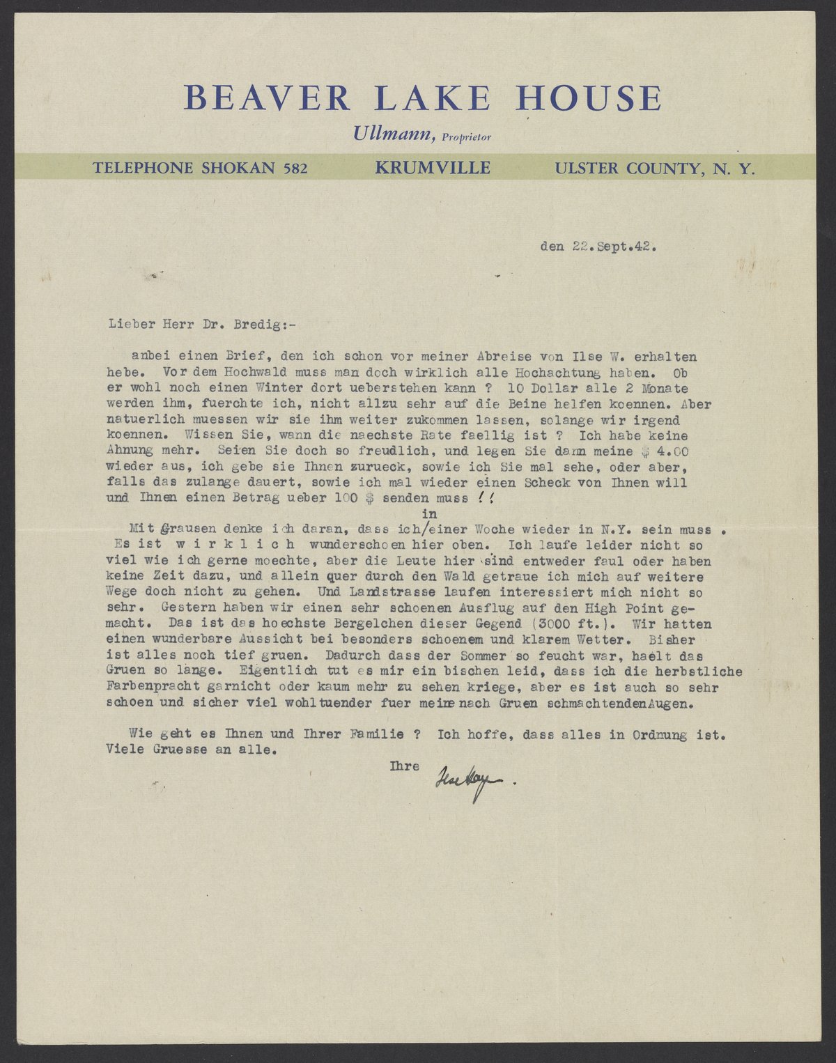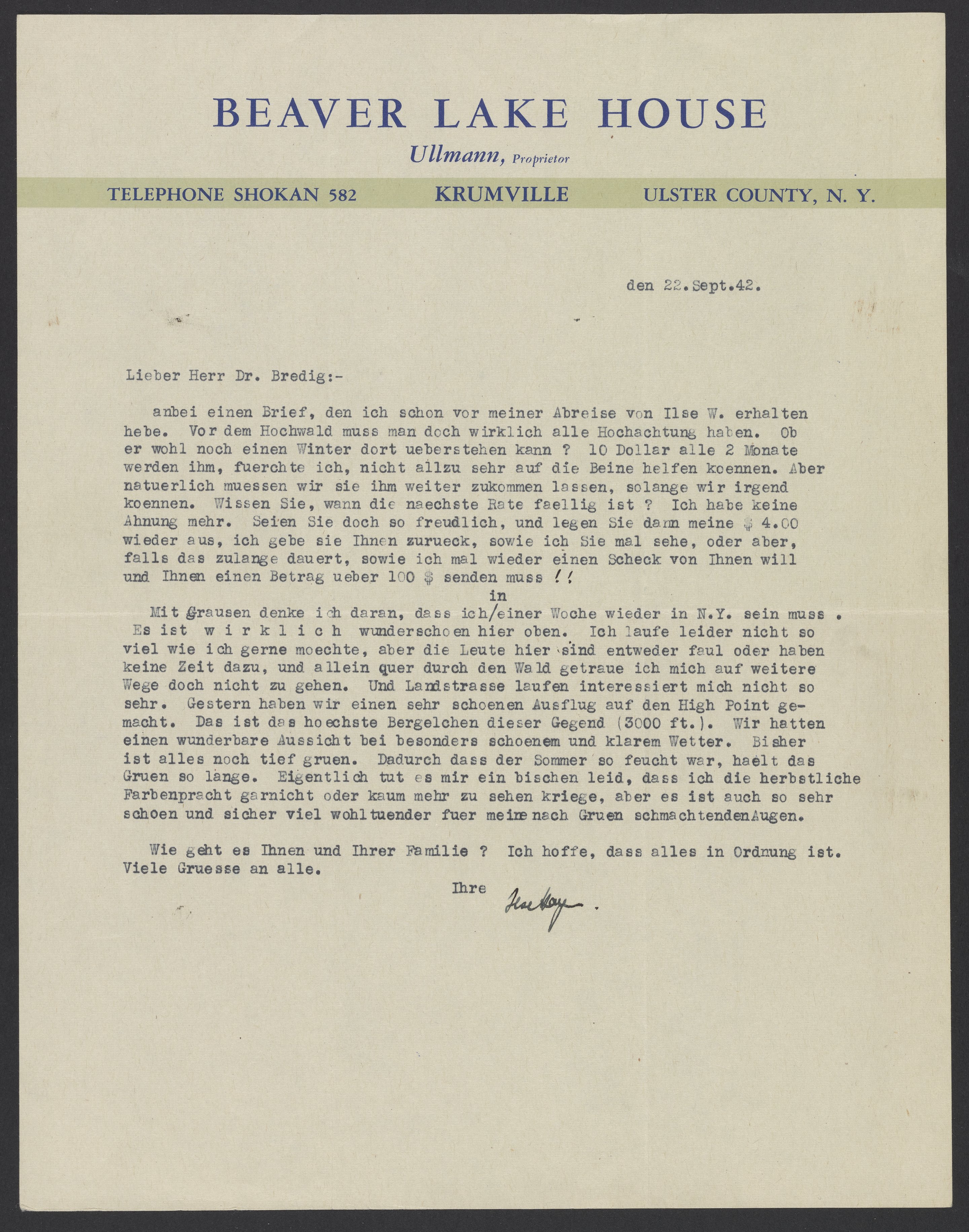 Letter from Ilse Hayn to Max Bredig, September 22, 1942
