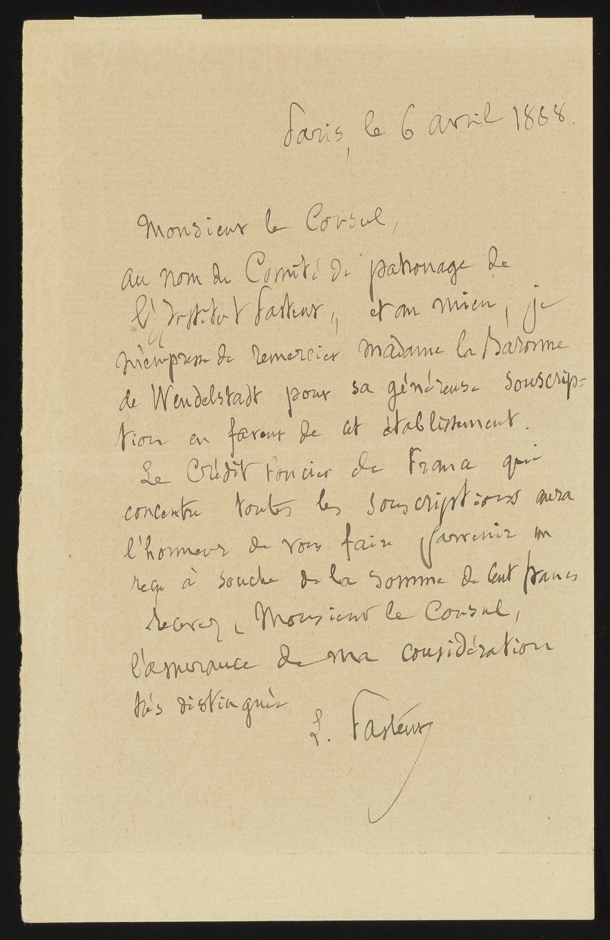 Letter from Louis Pasteur to Monsieur le Consul