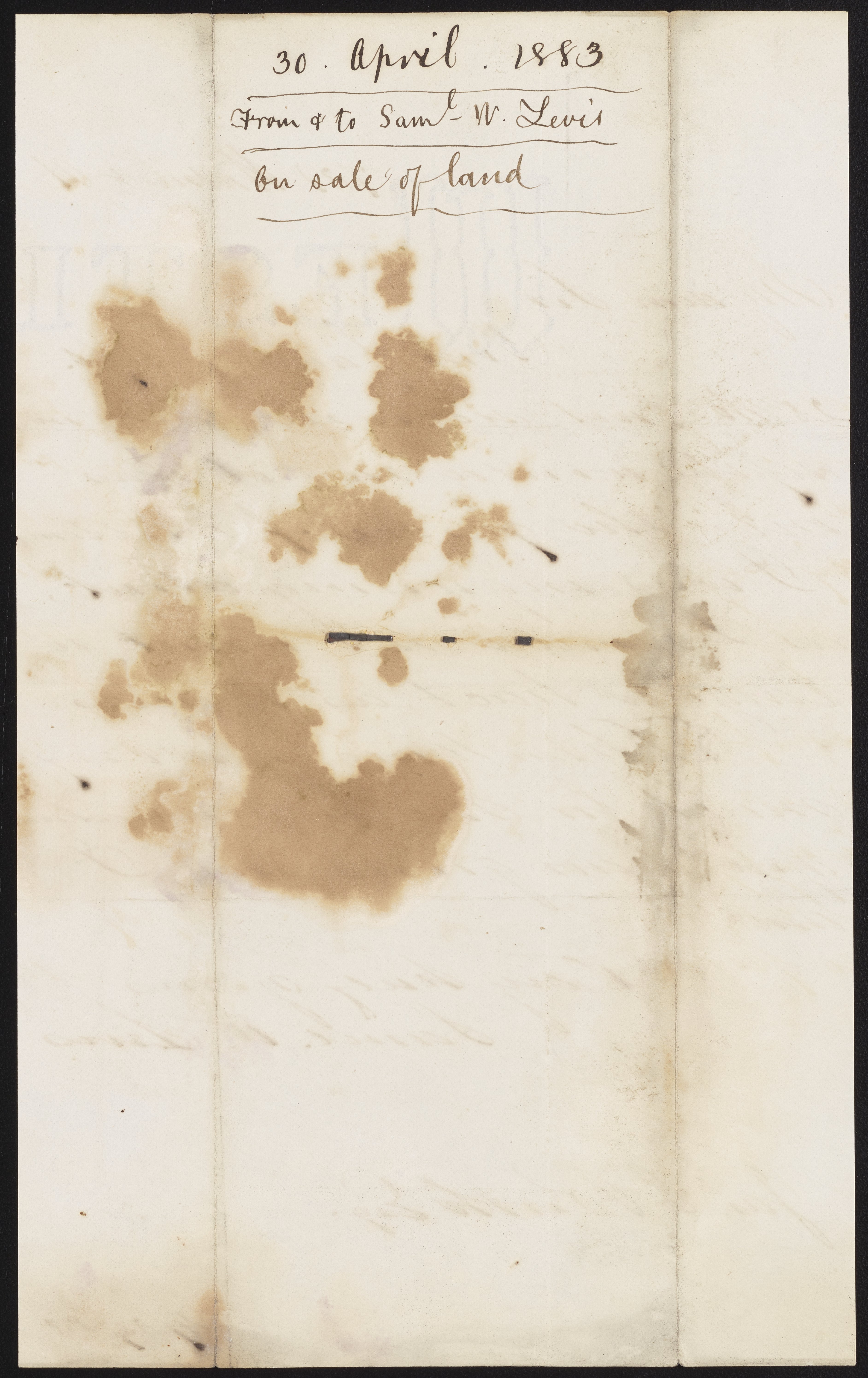 Small JPG1200 x 1918px — 309 KBLarge JPG2880 x 4603px — 1.7 MBFull-sized JPG3768 x 6022px — 2.8 MBOriginal fileTIFF — 3768 x 6022px — 65.0 MBSamuel W. Levis writes to James Curtis Booth (1810-1888) following his letter of early April to enquire after land for sale.