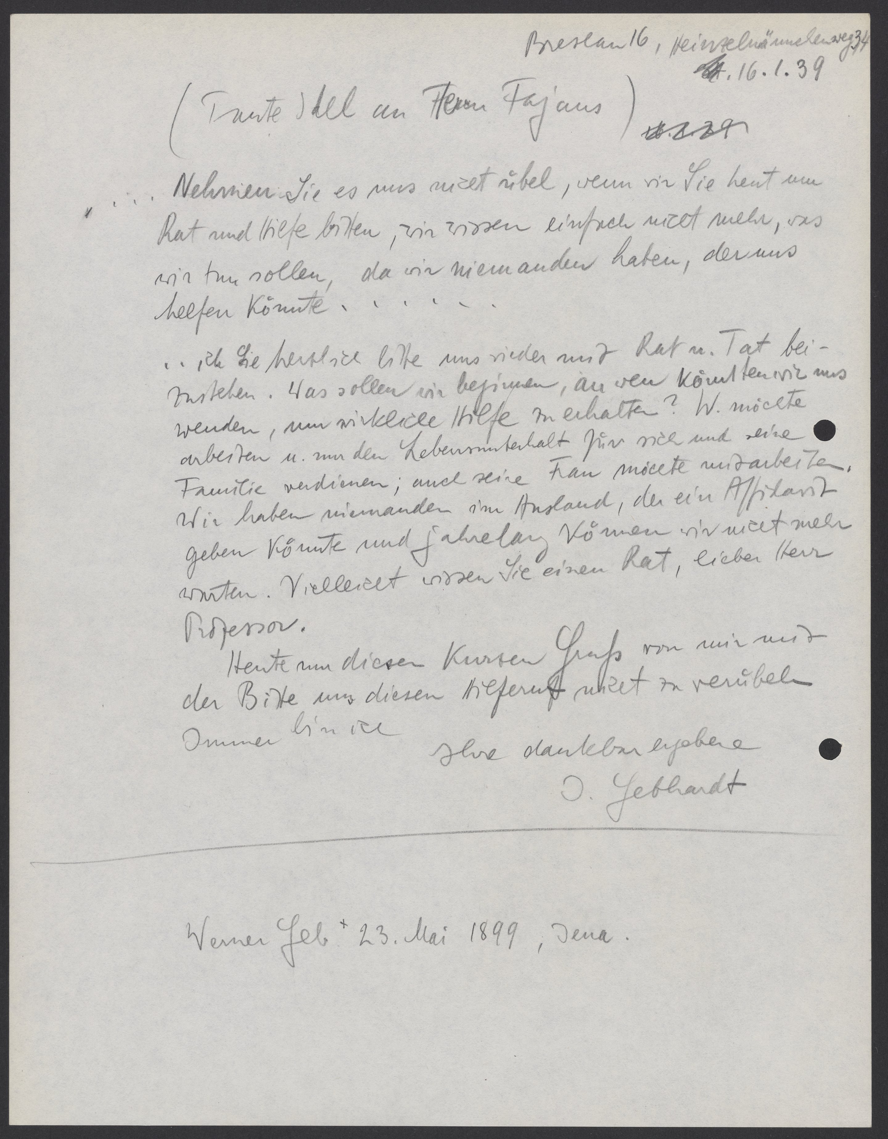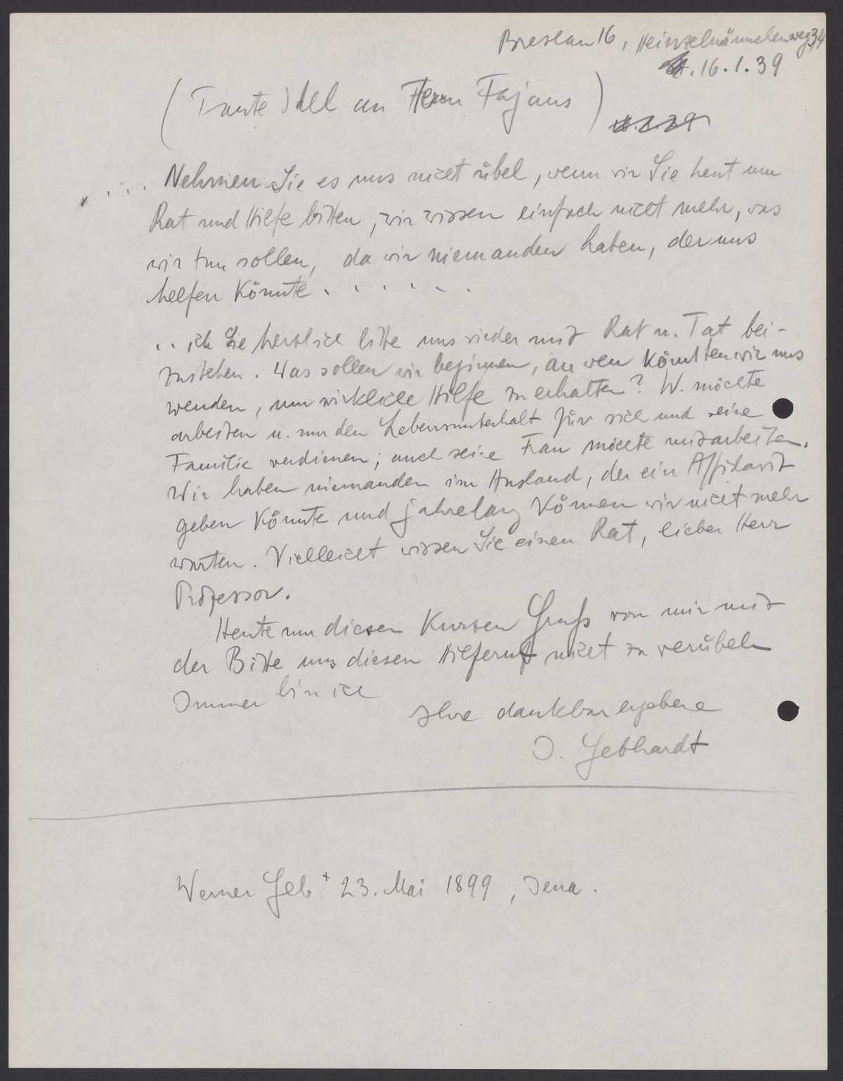 Letter copies from Werner and Ida Gebhardt to Kasimir Fajans, January, 1939