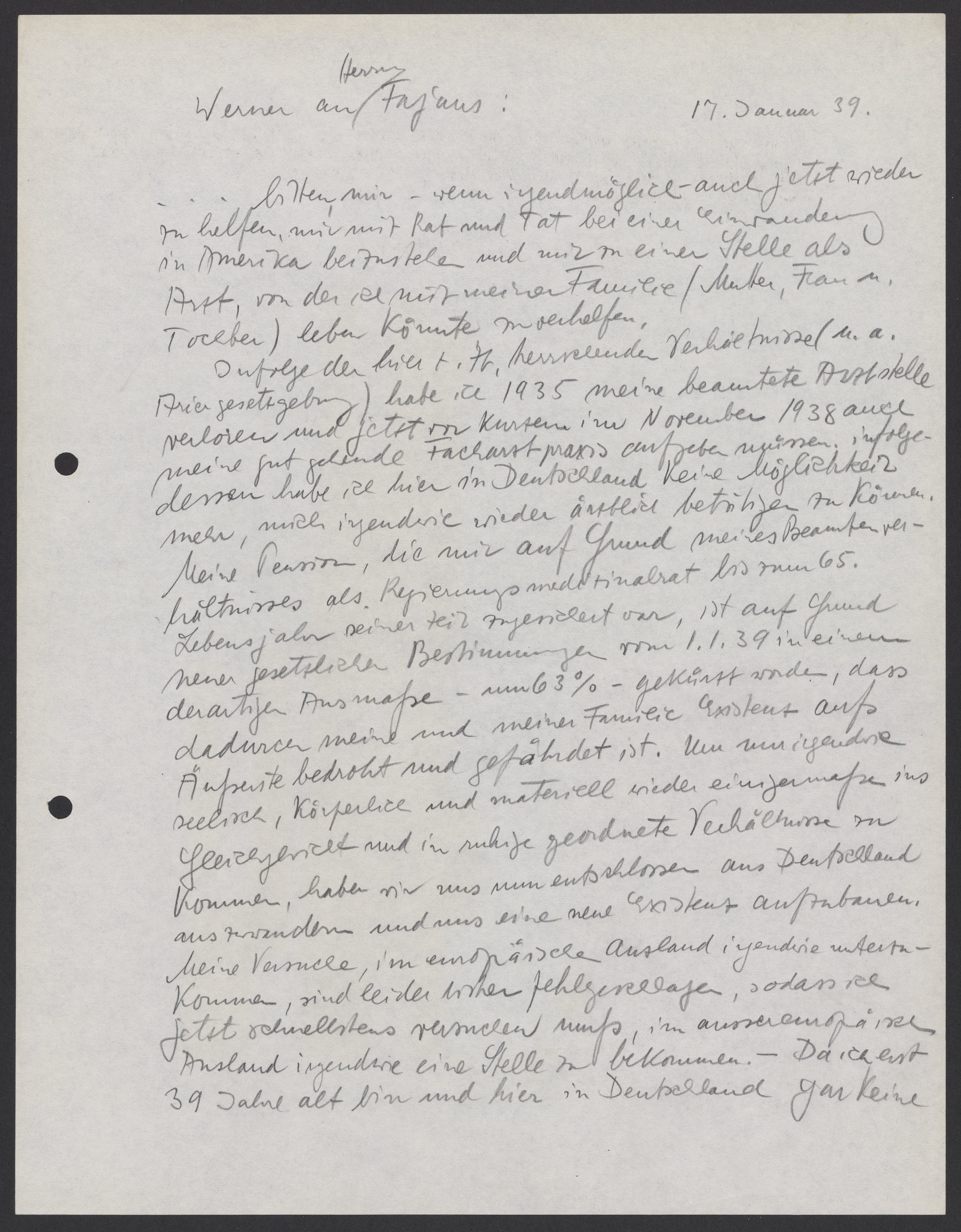 As a result of the circumstances prevailing here at the time, including Aryan laws, I lost my official position as a doctor in 1935. Moreover, recently, in November 1938, I also had to give up my specialist practice. As a result, I can no longer work as a doctor in any capacity here in Germany. My pension, which was supposed to be paid to me until my 65th birthday because of my civil service status as a government medical officer, has been reduced to such a great extent (by 63% - on the basis of new legal provisions beginning on January 1st, 1939), that the welfare of me and family have been threatened and endangered. In order to reclaim our emotional, physical, and financial wellbeing and move to a peaceful, orderly place, we have now decided to emigrate from Germany and build a new life for ourselves. Unfortunately, my attempts to find somewhere to work in other European countries have so far failed. Therefore, I must now try to find a job somewhere outside of Europe as quickly as possible. Because I'm only 39 years old and I don’t have any (connections) here in Germany….
