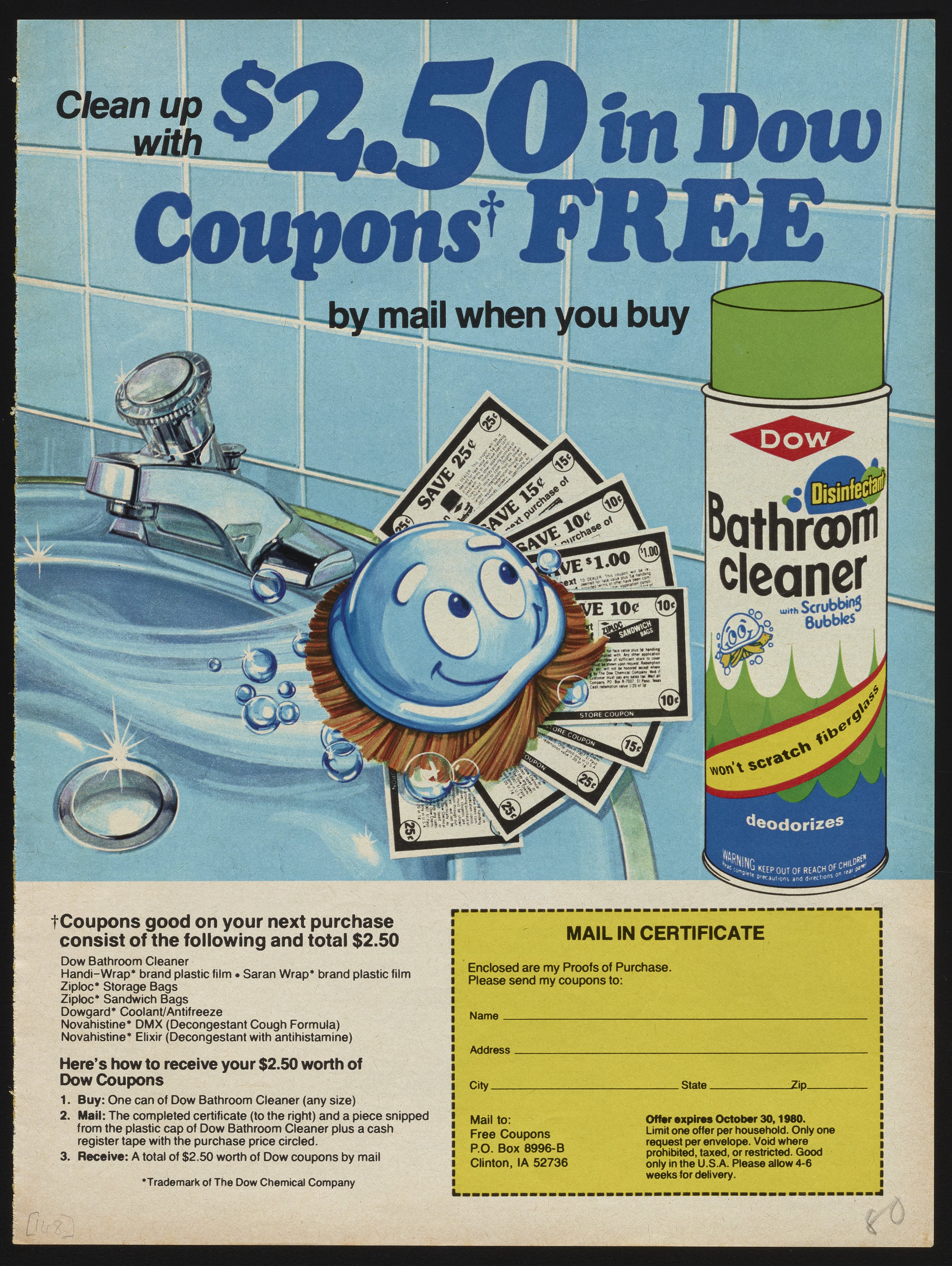 Color print advertisement for Dow Bathroom Cleaner featuring the Scrubbing Bubbles mascot. The advertisement includes a mail-in certificate for coupons good towards the purchase of several Dow products, including Bathroom Cleaner, Handi-Wrap, Saran Wrap, and Ziploc. This advertisement appeared in the July 1980 issue of Better Home and Gardens.